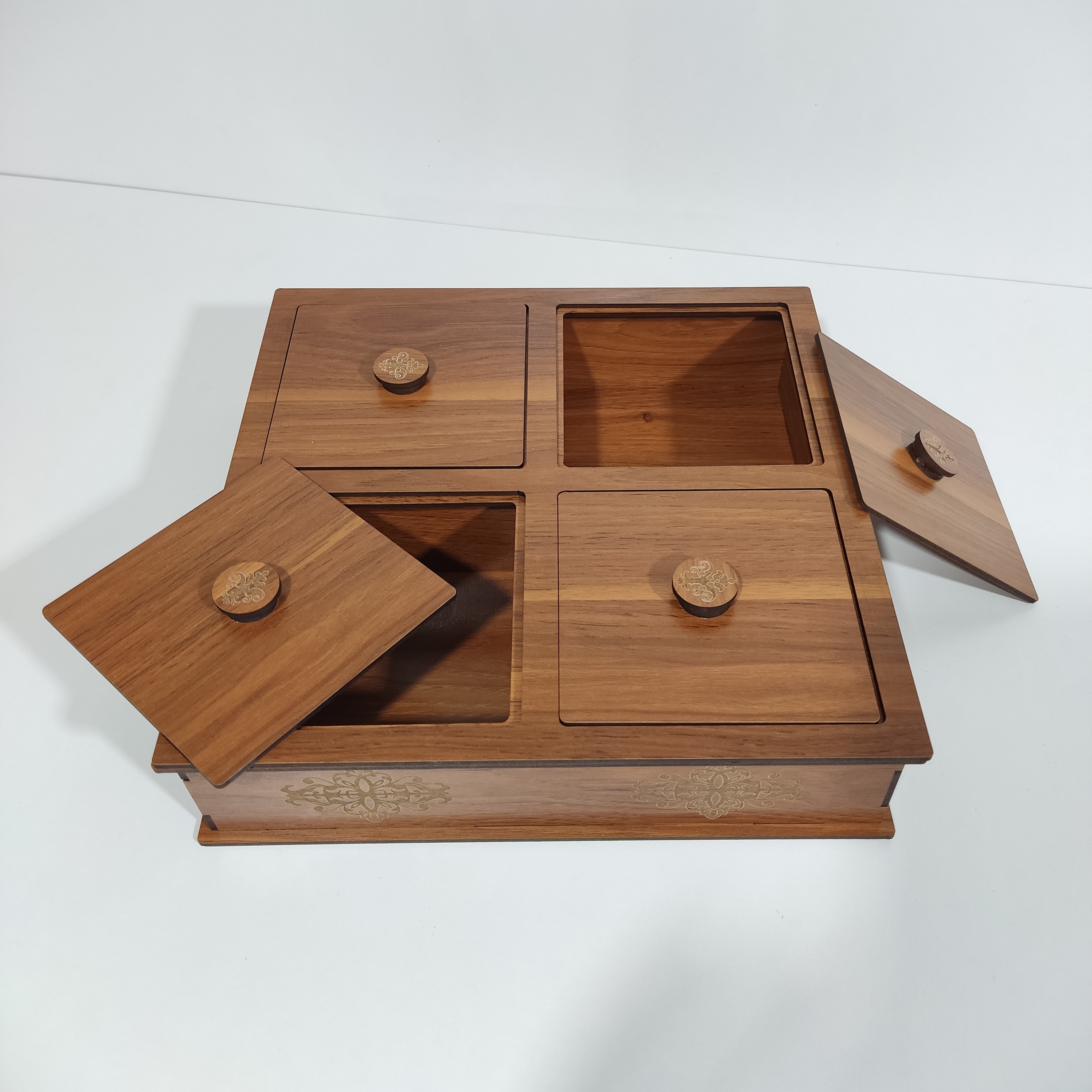 این آجیل خوری 4 قسمتی با درب چوبی و حکاکی نقوش بر روی دیواره ها و دستگیره ها می باشد و از جنس چوب ام دی اف ساخته شده در وسط این آجیل خوری دیواره های تقسیم کننده وجود دارد که فضا های آجیل خوری را به چهار قسمت مساوی تقسیم میکند این آجیل خوری را میتوان در خانه، سرکار، میهمانی ها، ادارات، هتل ها، کافه ها استفاده کرد و در هر قسمت آن شکلات یا آجیل های مختلف ریخت.
