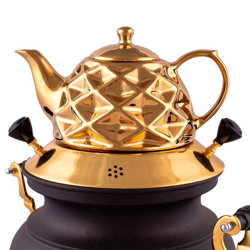 سماور با طراحی خاص و مدل عدسی با 4 لیتر همراه قوری , مشکی , رنگ ثابت , جنس برنج با دسته های طلایی سرامیکی زیبایی منحصر بفرد , کار با کیفیت و ضخامت بالا, بااطمینان سفارش دهید.قسمت چراغ سماور می تواند به عنوان خوراک پز استفاده شود.قسمت بدنه اصلی به عنوان کتری روی گاز استفاده میشود. سر شعله سماور هم از نوع برنج می باشد, بخاطر تولید کننده اصلی بودن قیمت پایین با سود کم محصول به دست مشتری می رسد.