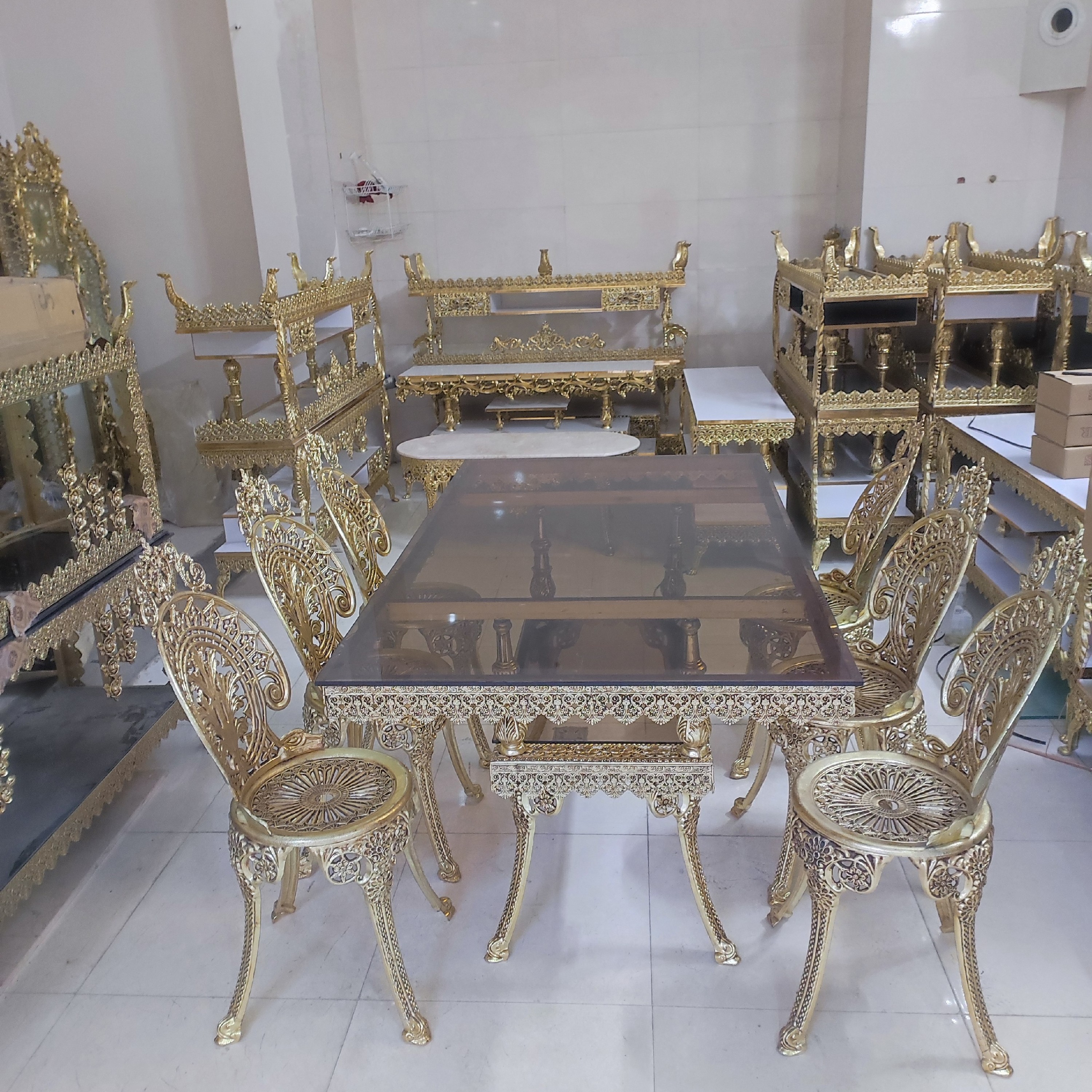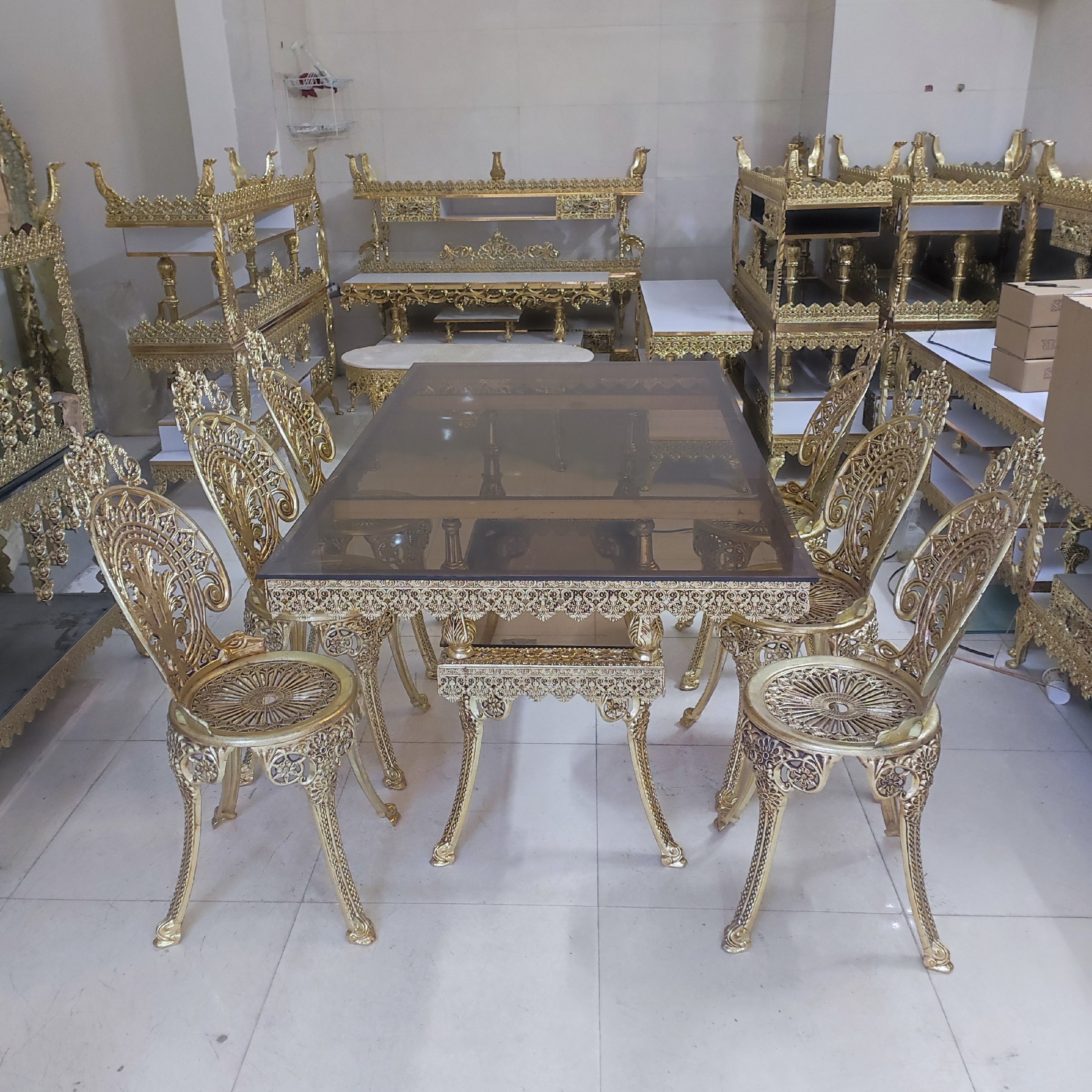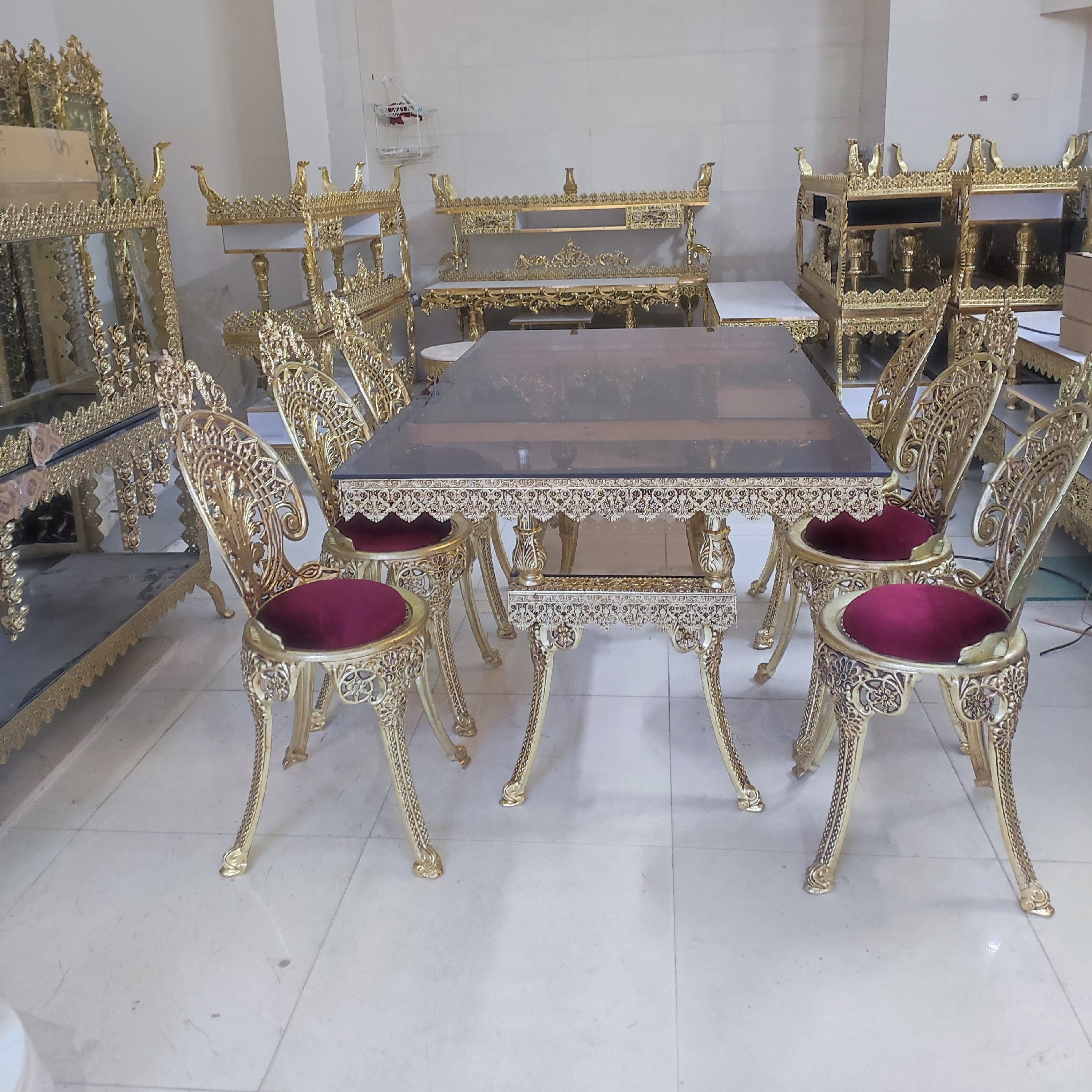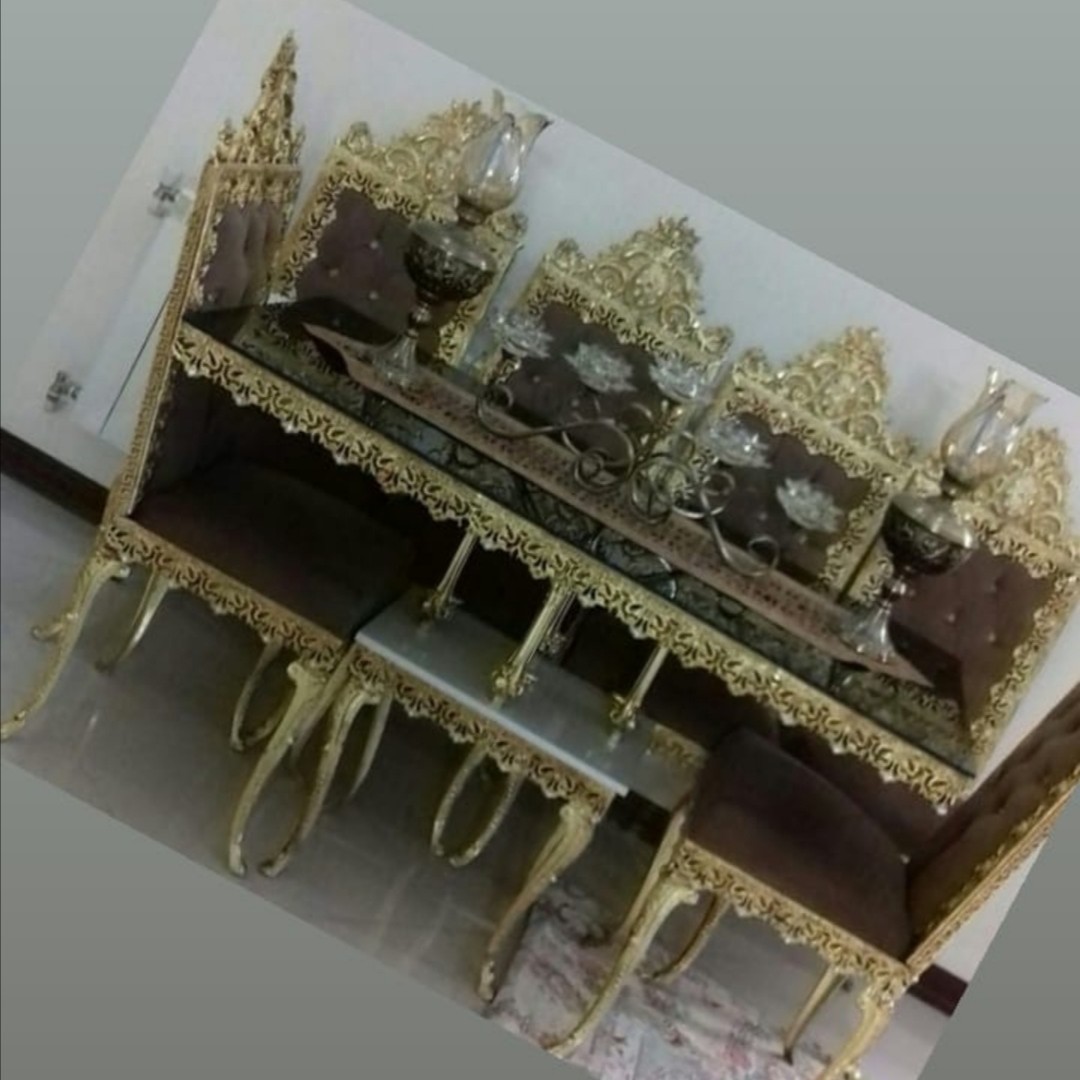 به دلیل حجیم بودن ارسال فقظ باربری بصورت انجام میشه میز ناهارخوری 6نفره جنس آلیاژ آلومینیوم آبکاری برنج رنگ ثابت با ضمانت و کارت گارانتی قابل سفارش در سایز های مختلف از 2نفره تا 12نغره روکش صندلی ب انتخاب مشتری