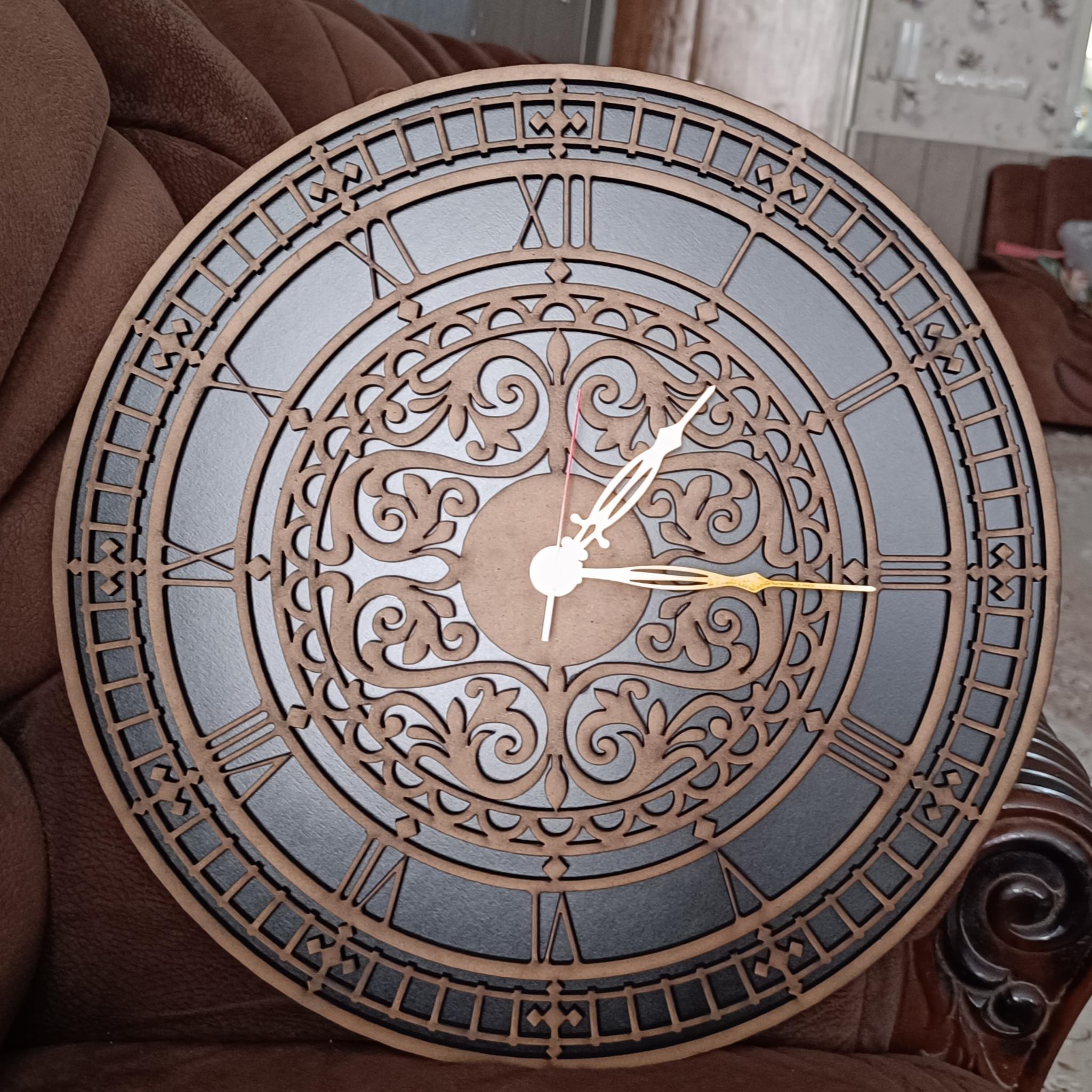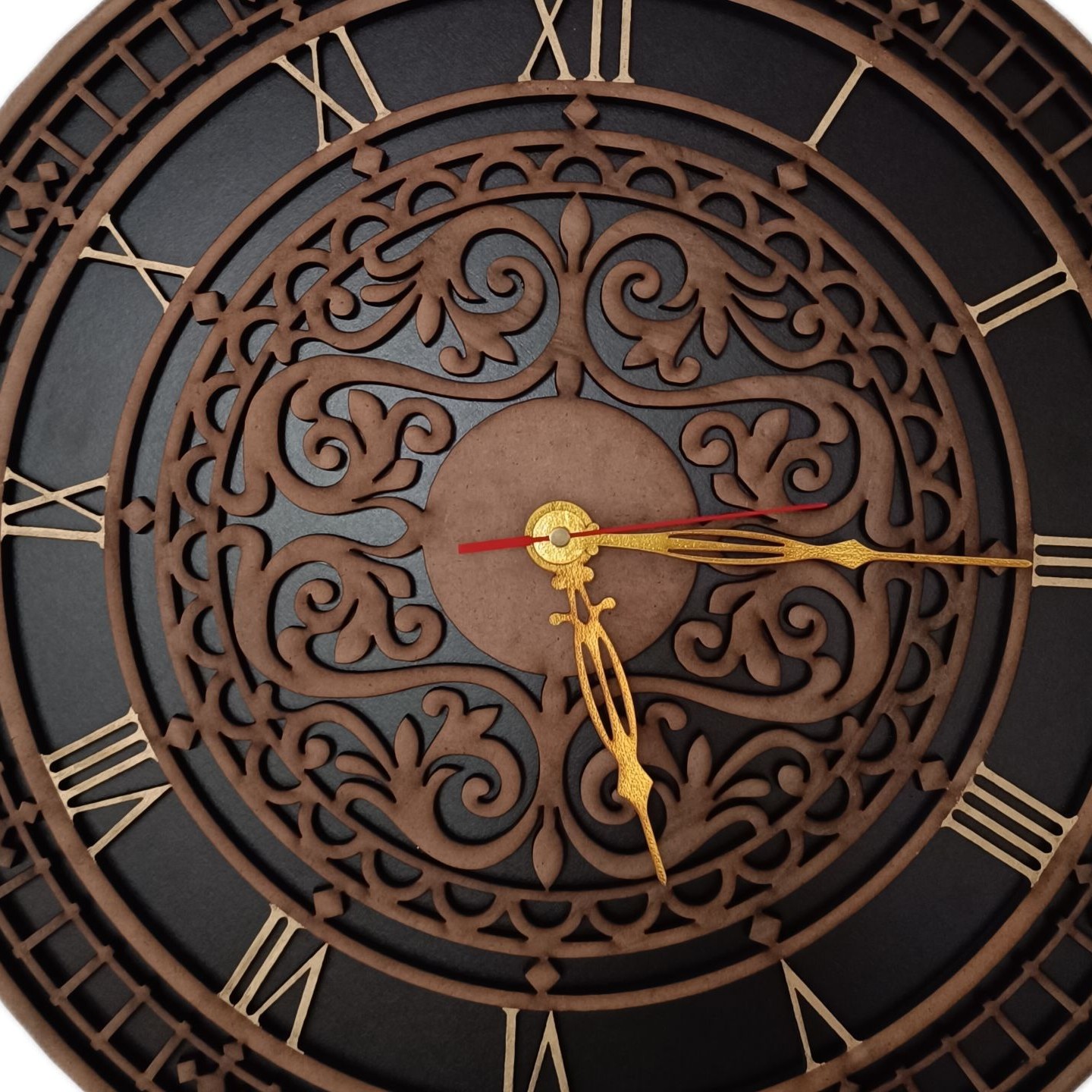 ساعت دیواری چوبی که از جنس ام دی اف ساخته شده است که برشهای بسیار زیبا و جذاب اسلیمی ایرانی و طرح ترنج و بسیار دقیق خورده است ضخامت این ساعت دیواری 1.2 سانتیمتر میباشد و قطر آن 40 سانتیمتر که سایز بسیار جذاب و ایدهآل برای تمامی نقاط میباشد این ساعت کلاً از چوب ساخته شده است حتی عقربهها و تنها موتور ساعت غیر چوب میباشد بسیار مستحکم و زیبا و دارای موتور آرامگرد تایوان اصل که از بهترین نوع موتور در بازار میباشد در آن به کار رفته است همراه این ساعت چندین نمونه عقرب چوبی خدمت شما ارسال تا طبق سلیقه خود آن را جایگذاری کنید بسته به میل شما عقربهها و اعداد میتوانند رنگ سفید یا رنگ دیگری باشد