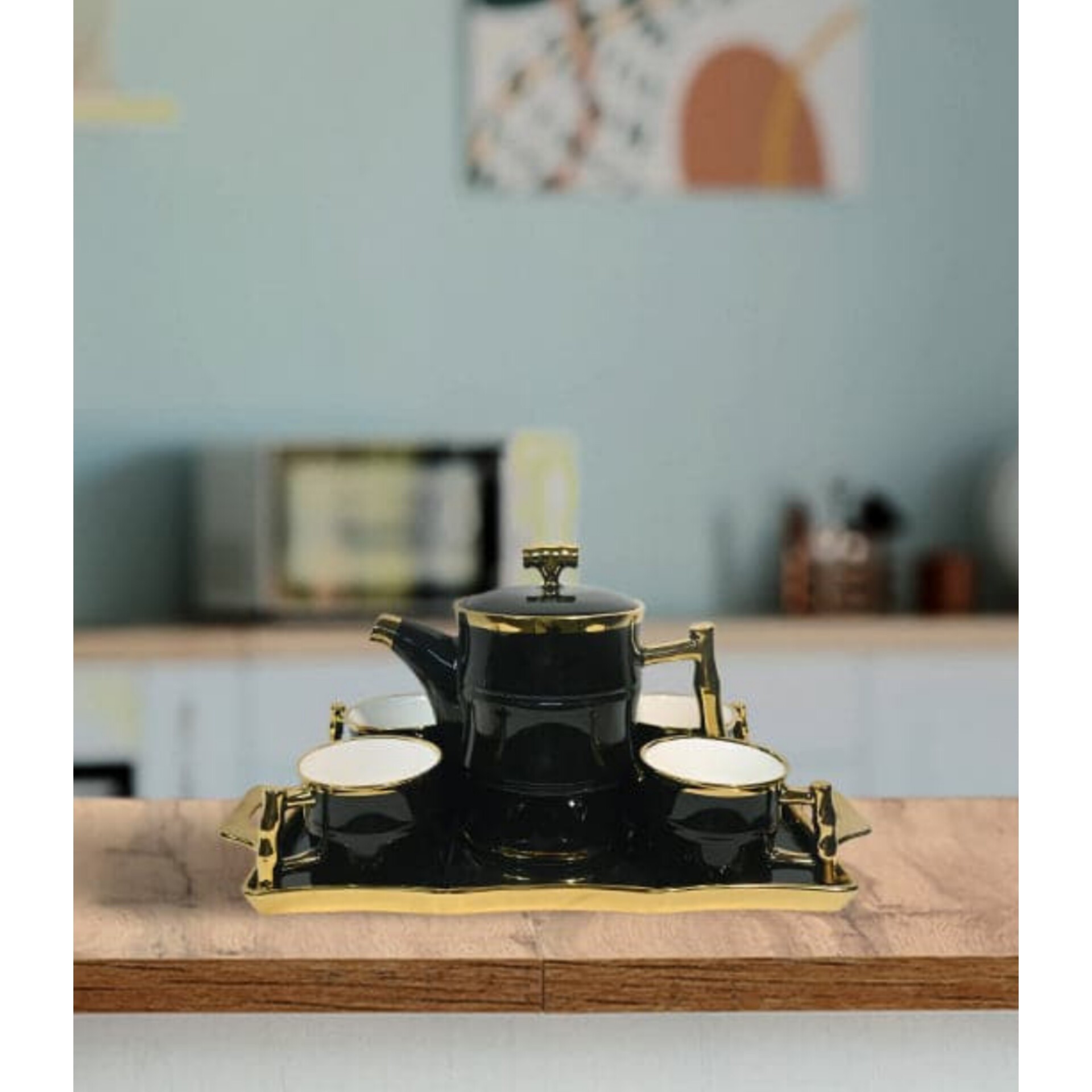 ست چای خوری سیاه و طلایی با سینی آیا می خواهید مهمانان خود را با یک ست چای مجلل و زیبا تحت تاثیر قرار دهید؟ ست چای خوری سیاه و طلایی با سینی برای سرو نوشیدنی های گرم مانند چای، قهوه و کاکائو داغ مناسب است. این ست چای خوری سرامیکی مرغوب با چهار فنجان، قوری و سینی عرضه می شود که پذیرایی از مهمانان شما را آسان می کند. طراحی شیک مشکی و طلایی نیز آن را به یک هدیه عالی برای دوستان و عزیزانتان در مناسبت های خاص تبدیل می کند.