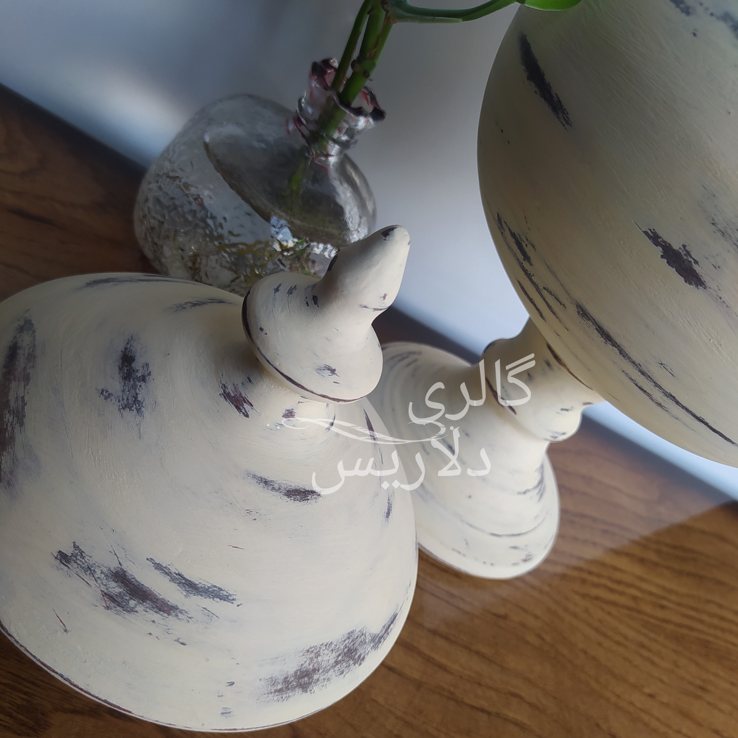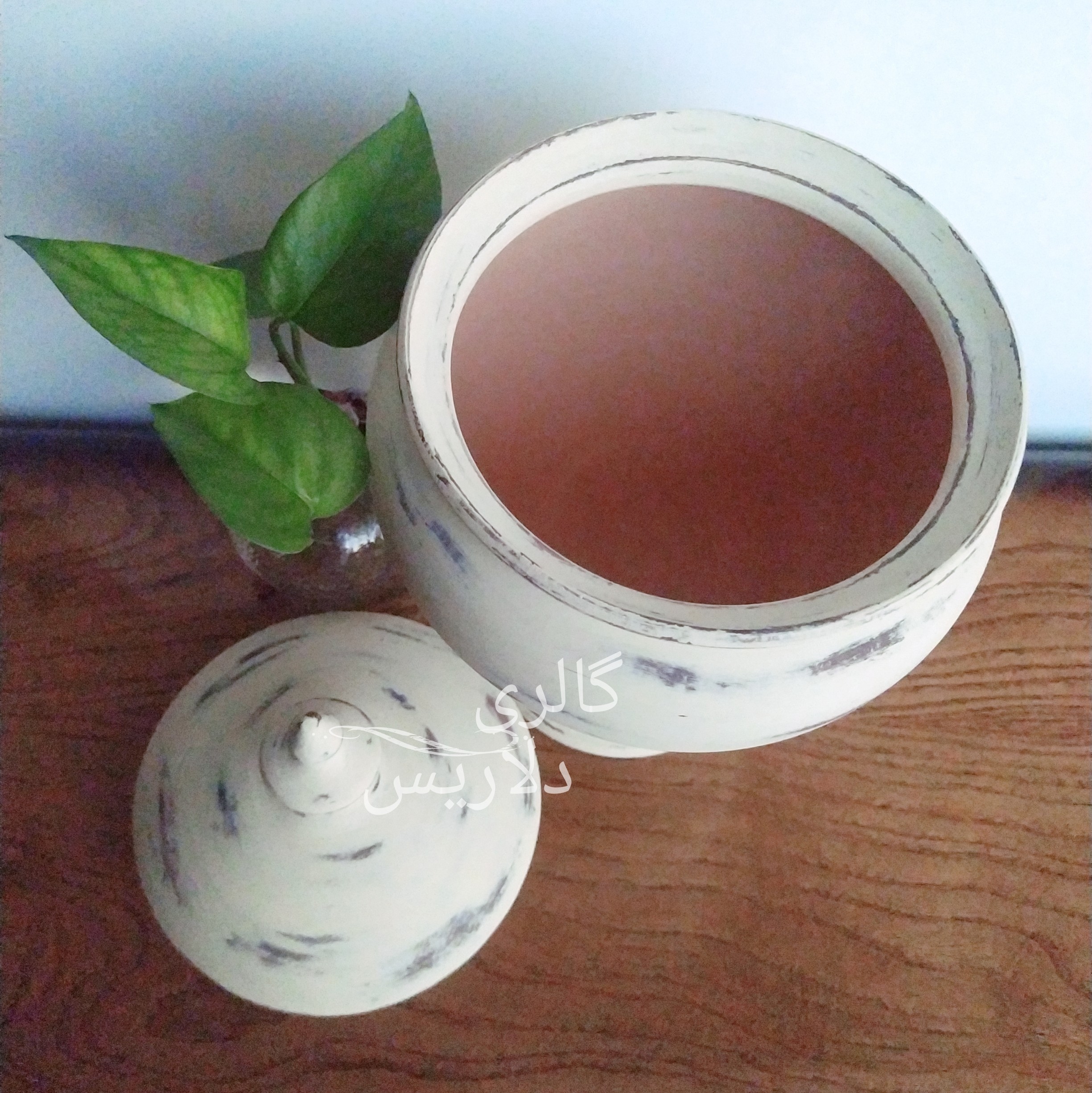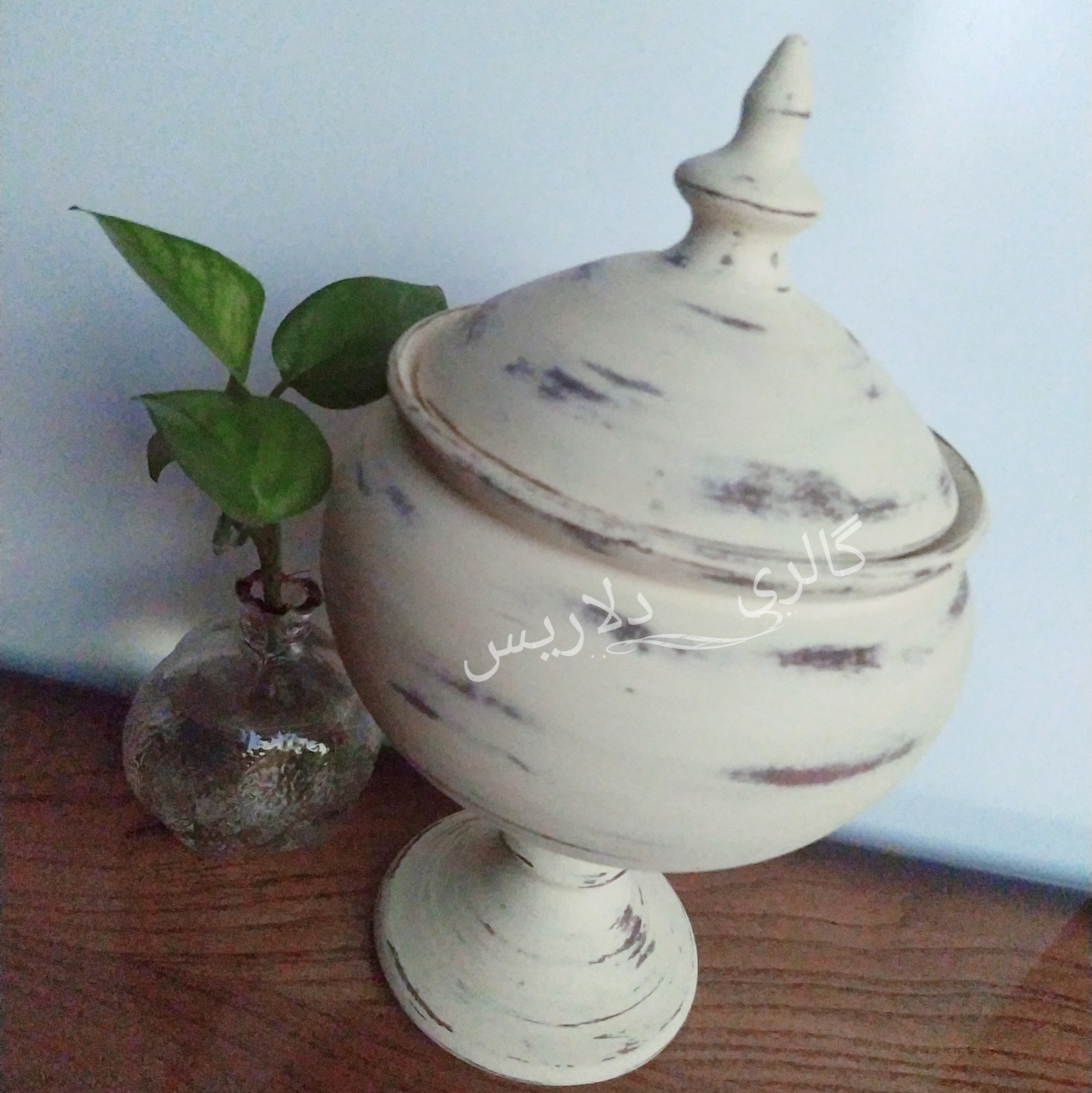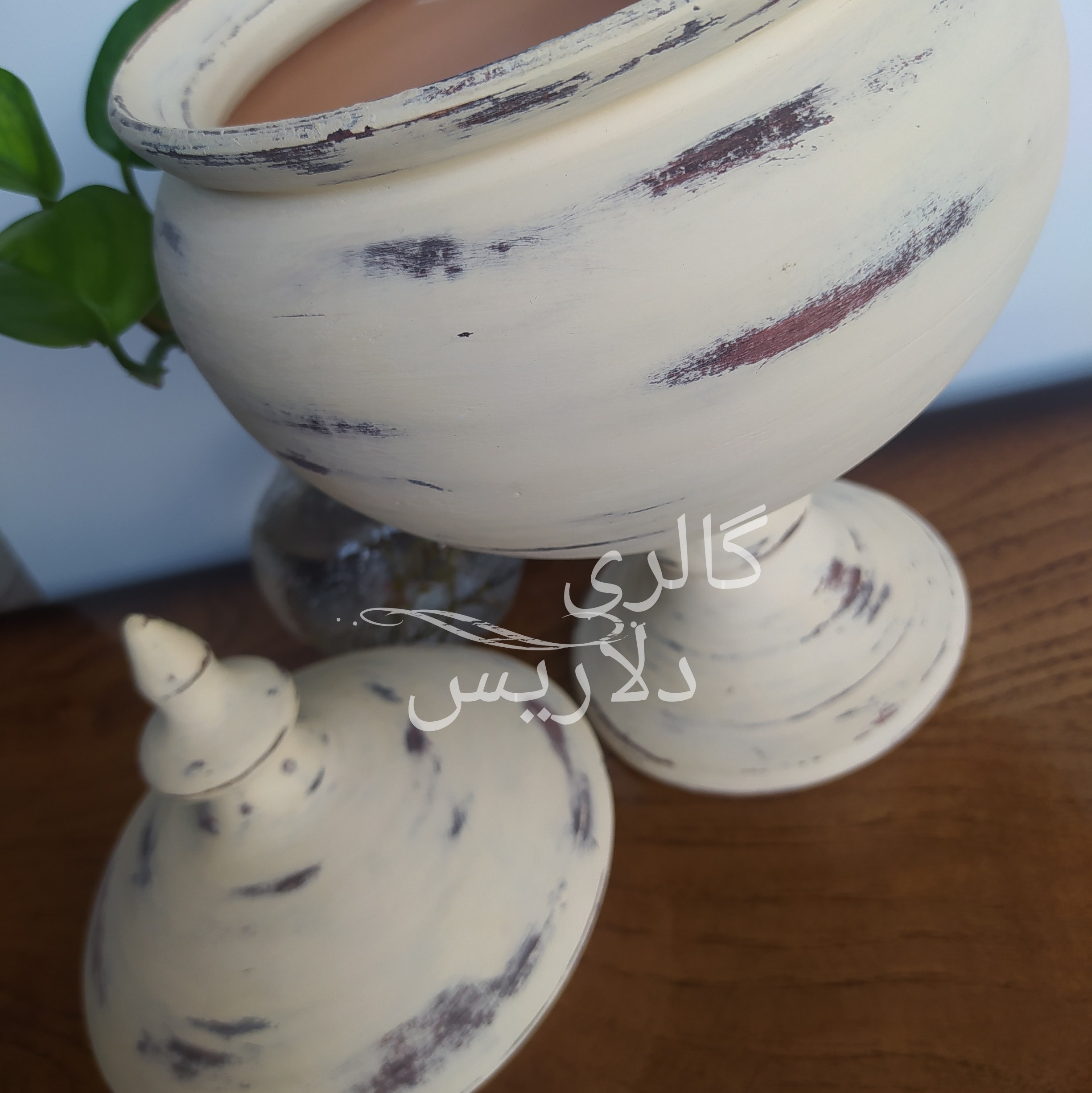 شکلات خوری سفالی پایه دار..کار دست ✋ قابل شستوشو.. پتینه وینتج ایتالیایی.. رنگ کرم.. درب دار سایز بزرگ مناسب انواع شکلات و آبنبات و اکسسوری.. مناسب برای پذیرایی جهیزیه هدیه دادن و غیره سایز ؛ارتفاع با درب 28سانت.بدون درب 20سانت..قطر دهنه 15 سانت.. ارسال به سراسر کشور با بهترین بسته بندی