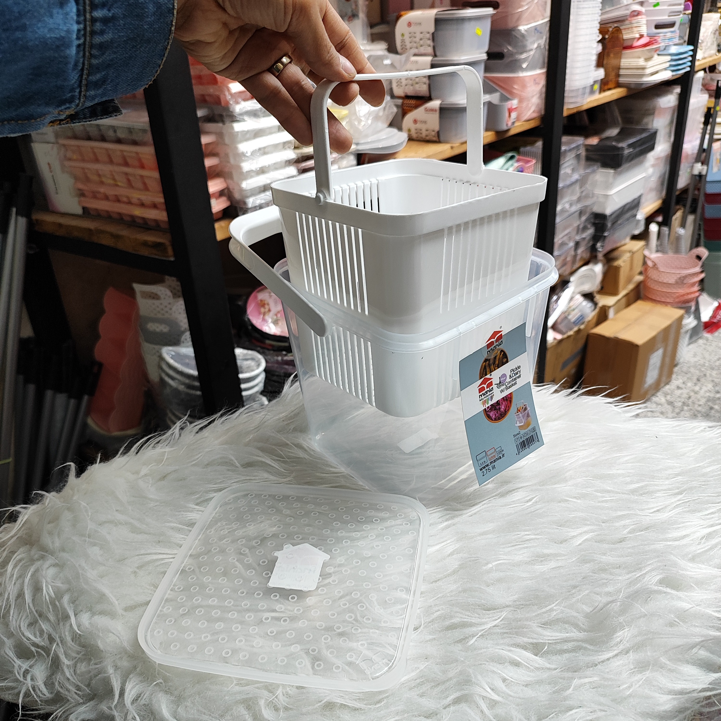 ظرف مخصوص نگه داری زیتون و پنیر و... برند مانیا سایز متوسط دارای یک عدد سبد دسته دار کیفیت عالی