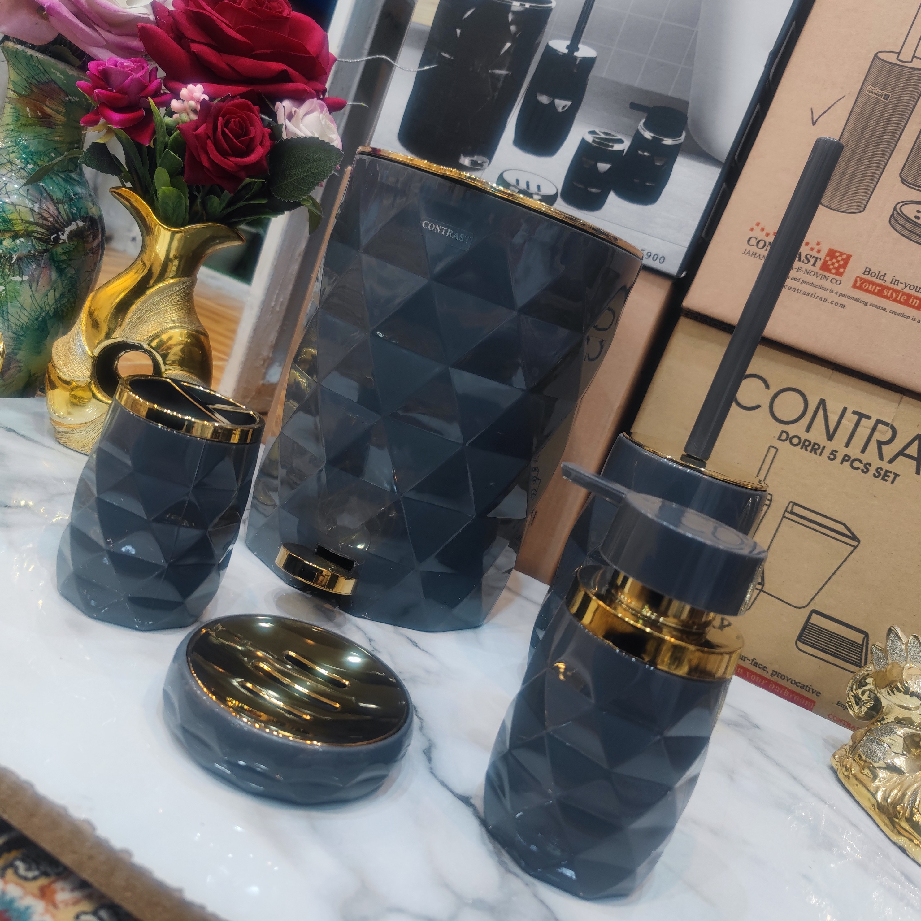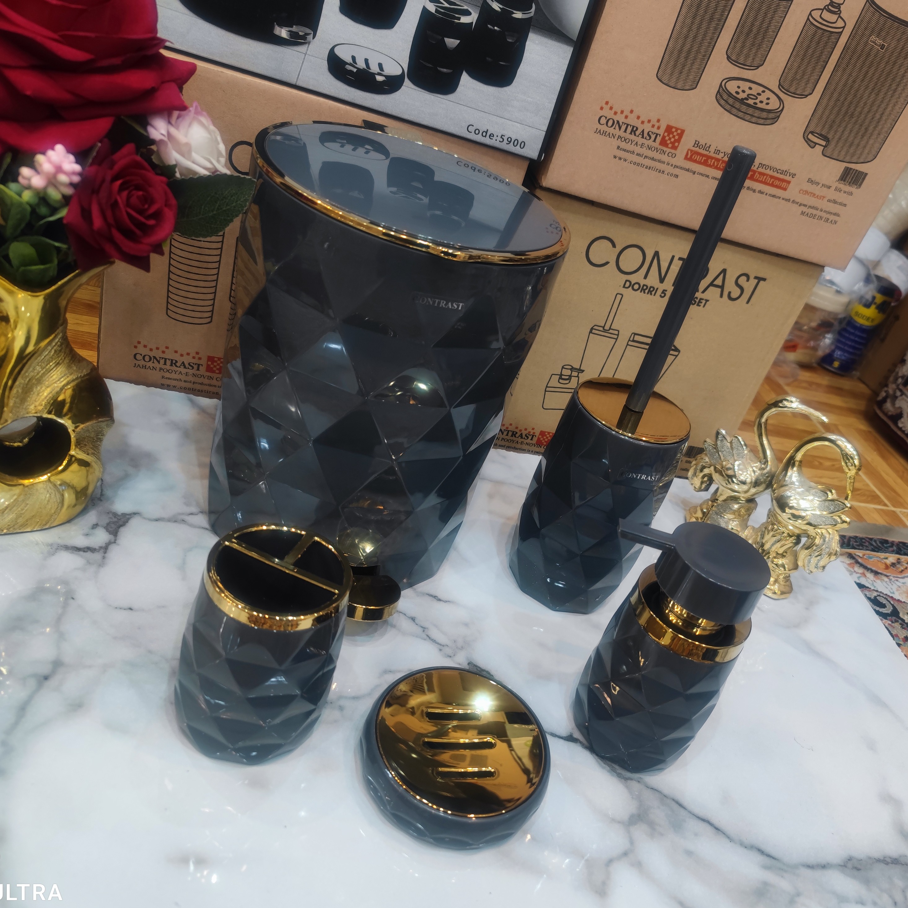 ست سرویس بهداشتی 5 پارچه طرح آناناسی برند کنتراست نو آکبند رنگ بسیار زیبا و پرطرفدار و جذاب طوسی تیره طلایی مبلمونسرا مدل 266222