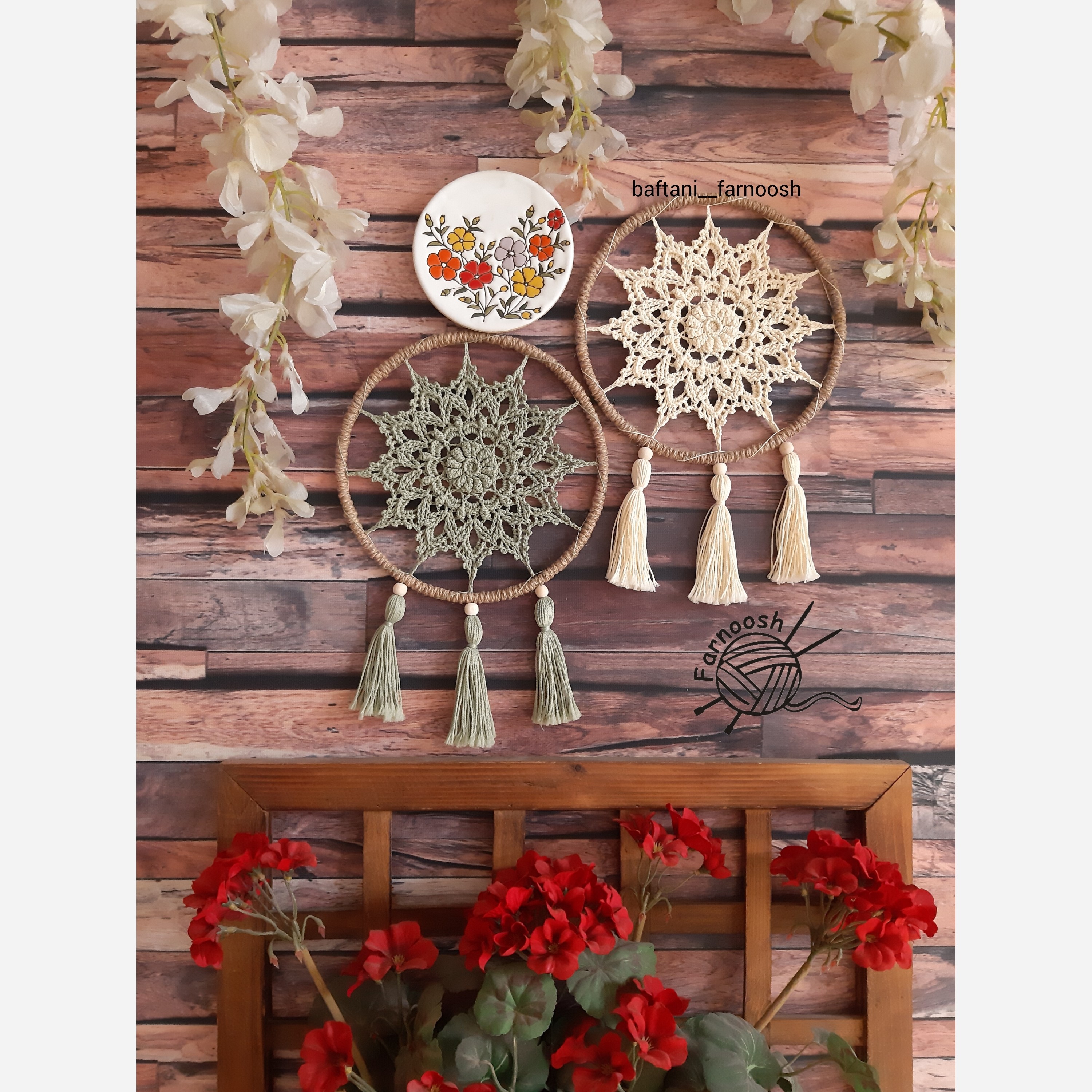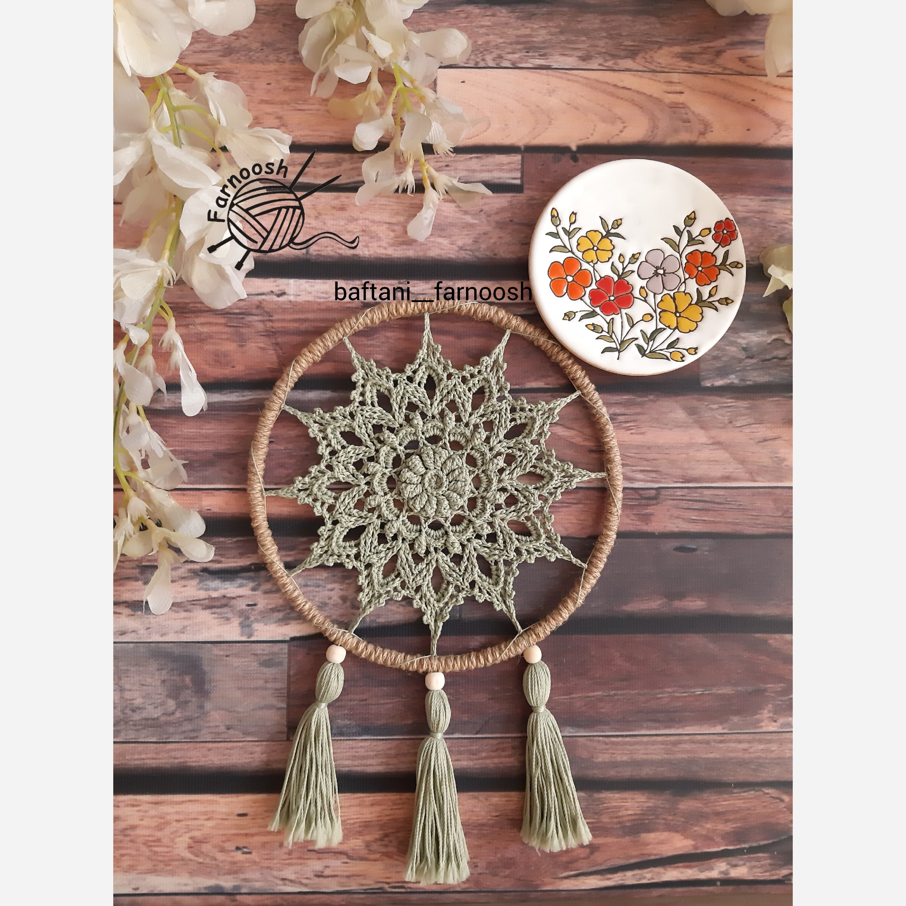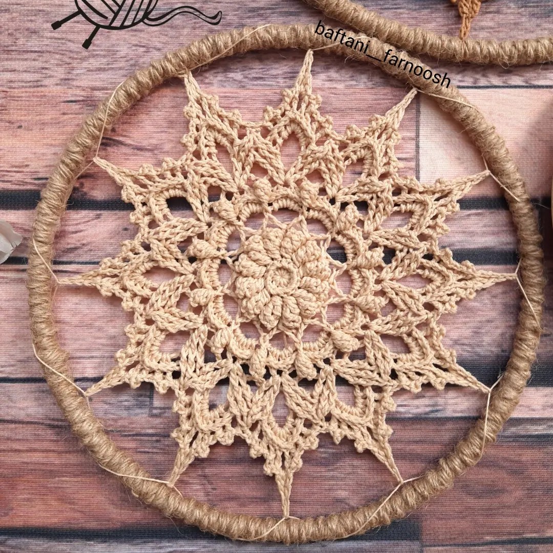 مینی دیوارکوب قلاببافی طرح برجسته بافته شده با نخ مرسریزه حلقه استیل و کنف پیچی شده در رنگهای دلخواه قابل سفارشه