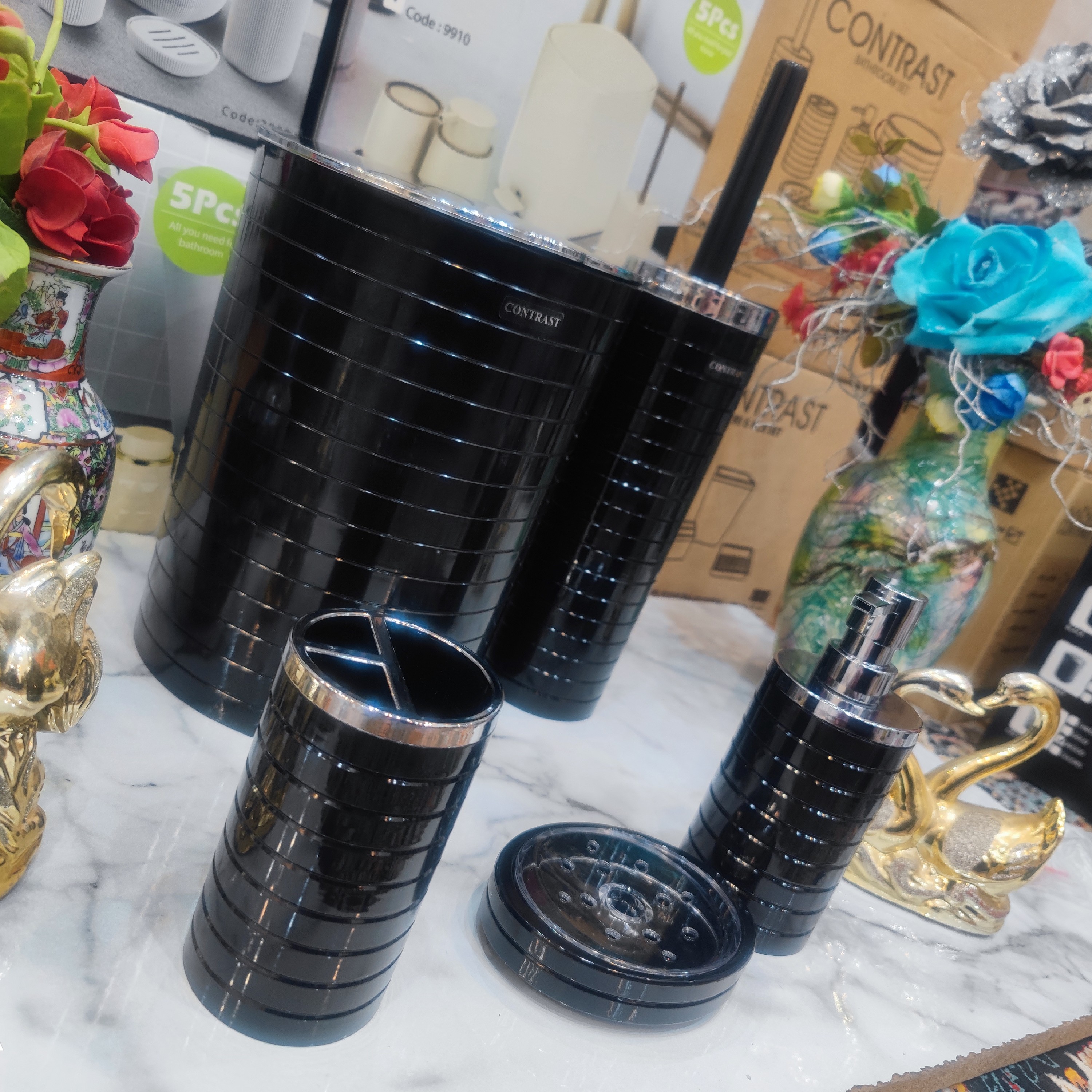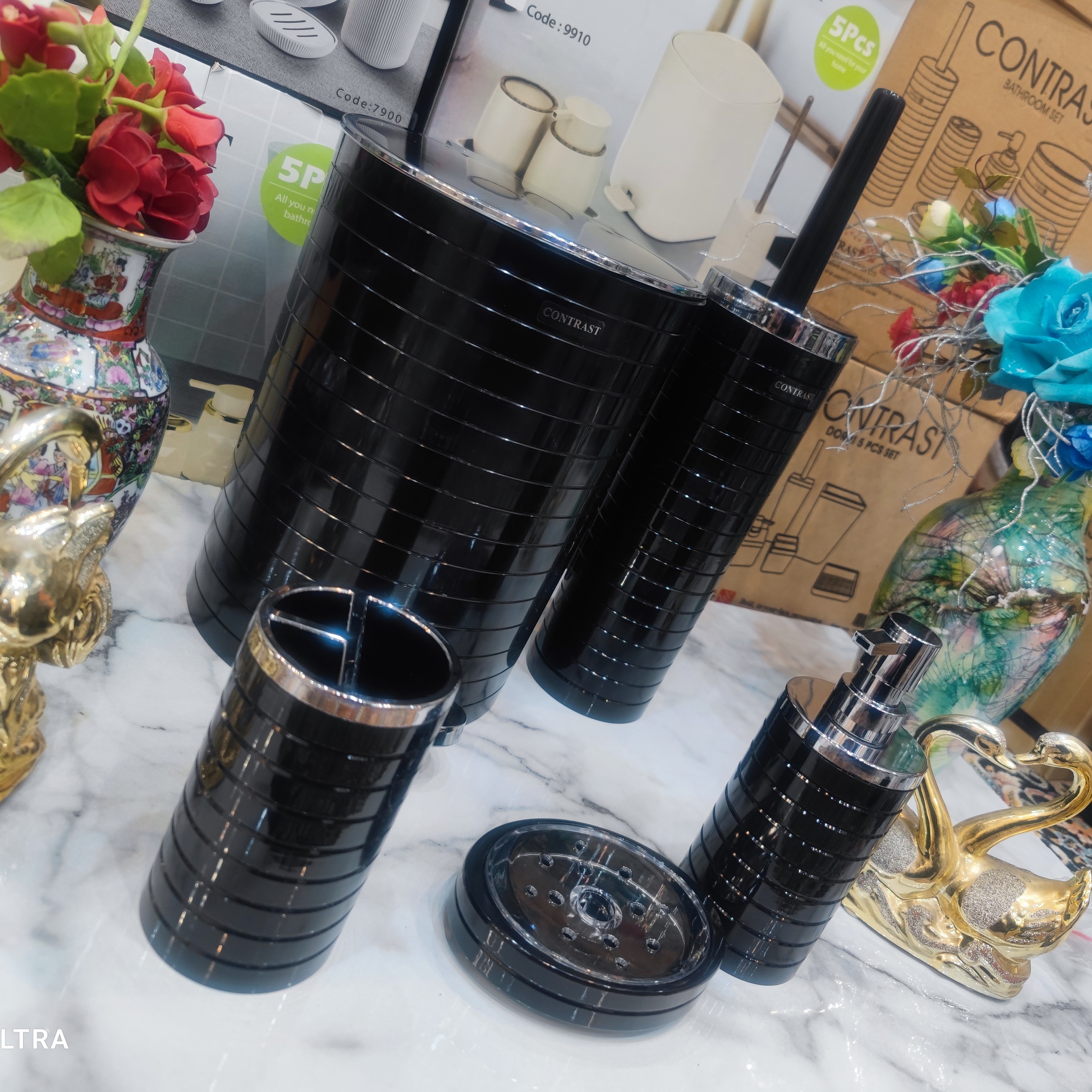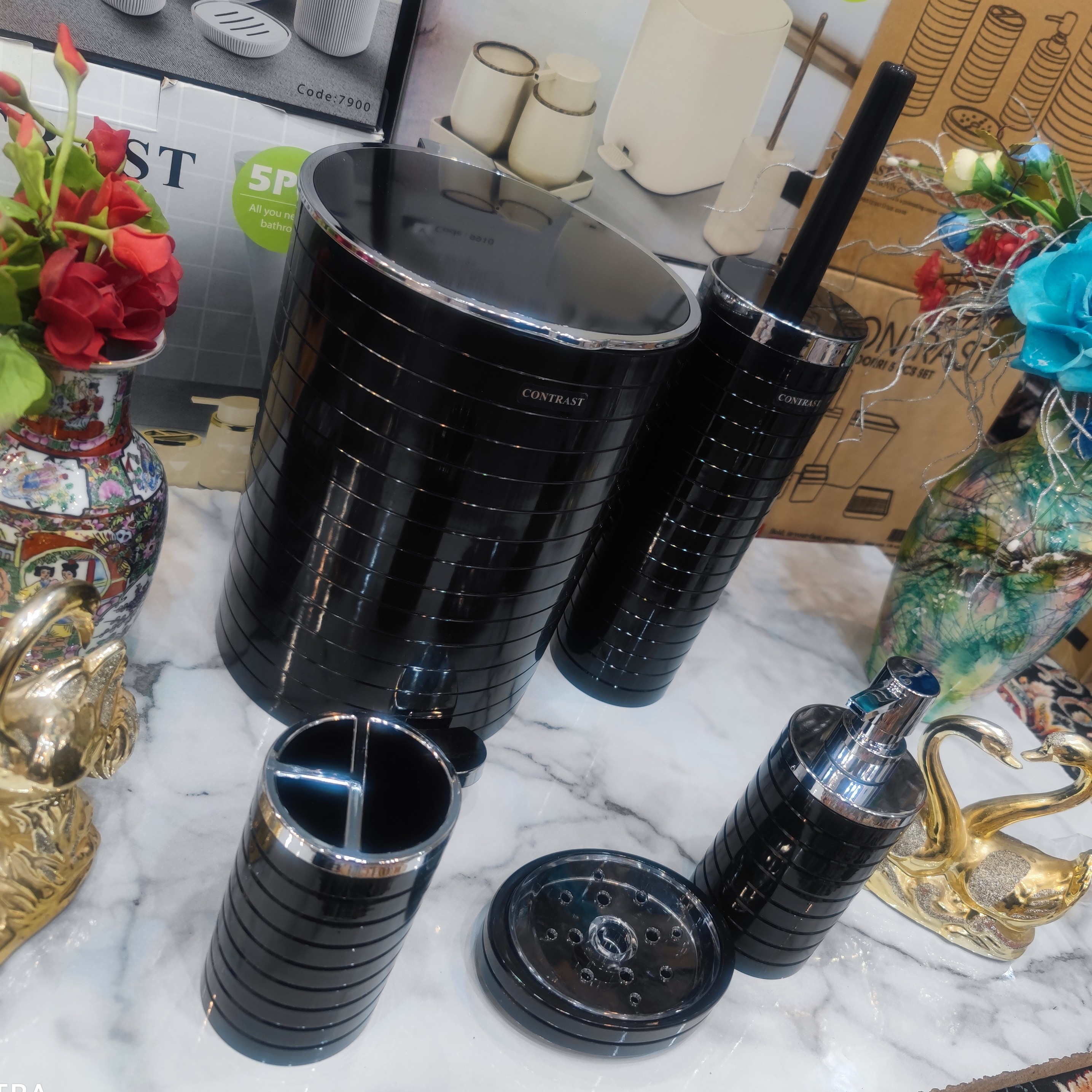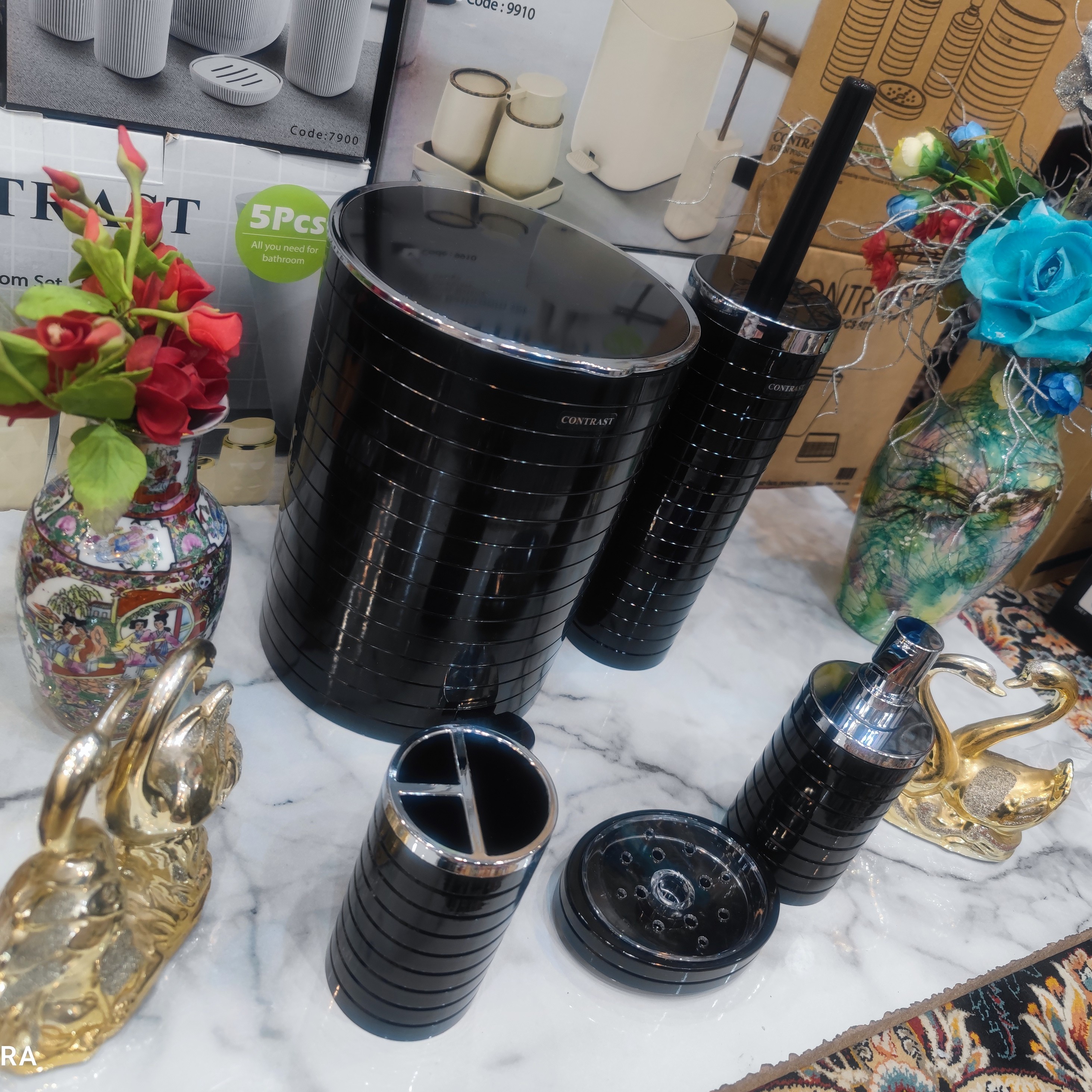 ست سرویس بهداشتی 5 پارچه طرح خط درشت برند کنتراست رنگ بسیار زیبا و پرطرفدار وخاص مشکی کروم نو آکبند به همراه ارسال سریع مبلمونسرا مدل 265740