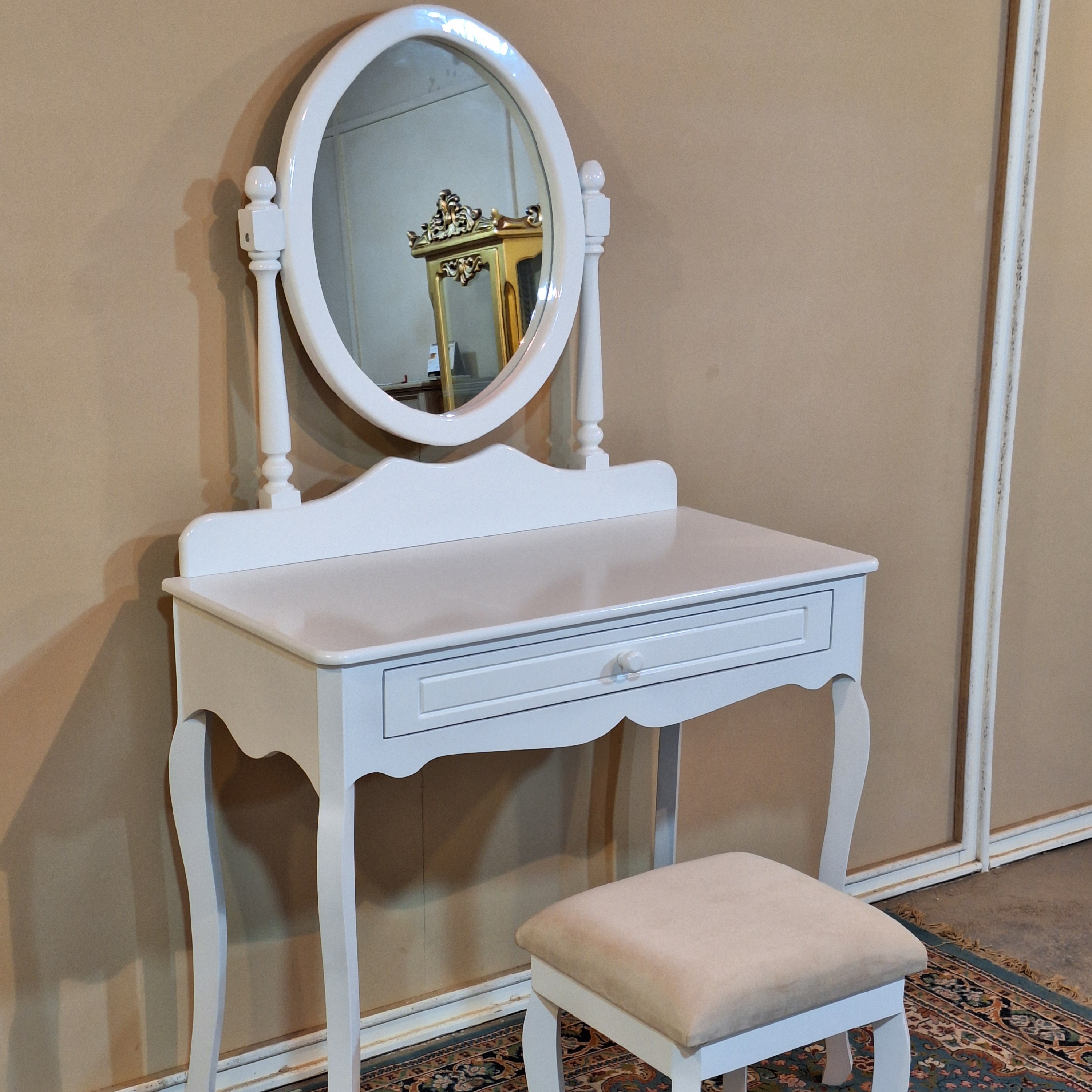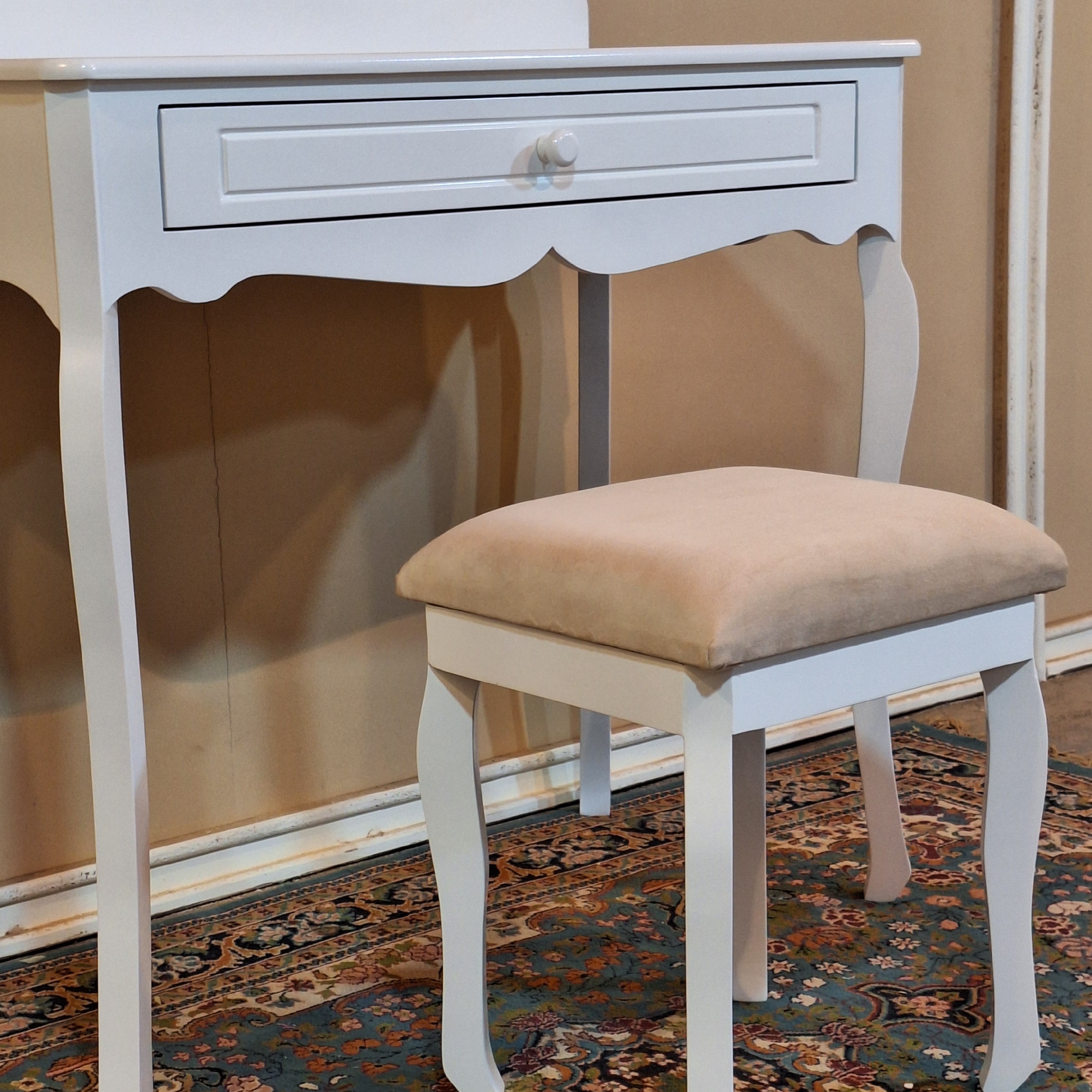 میزآرایش کلاسیک جدید دخترانه سفید سایز100 این میزآرایش شامل: میز و آینه و پاف 🪞 🥰 یعنی هر چیزی که برای یه آرایش و میکاپ عالی نیاز داری این میز فراهم میکنه😍 ترکیب پایه سم آهویی و آینه خراطی عالیه تو این کار و جذابیتشو چند برابر کرده 😉 رنگ میزآرایش سفیده ولی رنگ بندی کاملا دلخواه شماست 🌈 متریال 🪵 پایه ها چوب روس و بدنه ام دی اف خام ،رنگ پوششی و پلی استر ارسال به سراسر کشور داریم 🚛 هزینه ارسال به عهده مشتری و به صورت میباشد .
