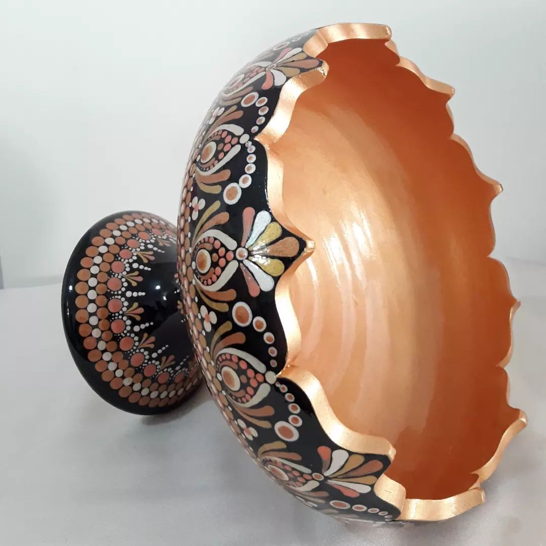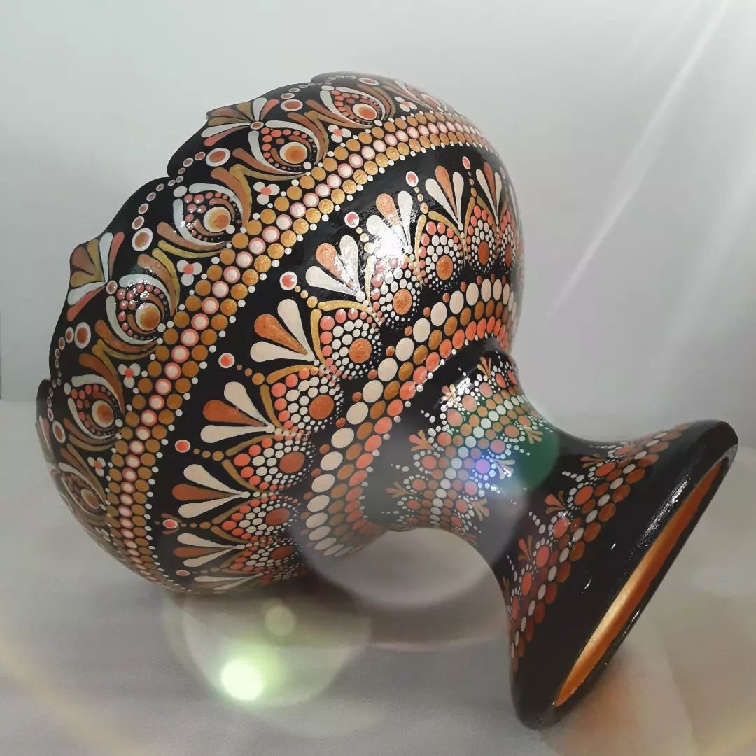 این محصول تماما کار دست میباشد تکنیک کار نقطهکوبی و رنگ بکار رفته اکریلیک هست با وارنیش رنگ کاملا ثابت و براق شده بنابراین قابل شستوشو با آب ولرم و اسکاچ نرم میباشد