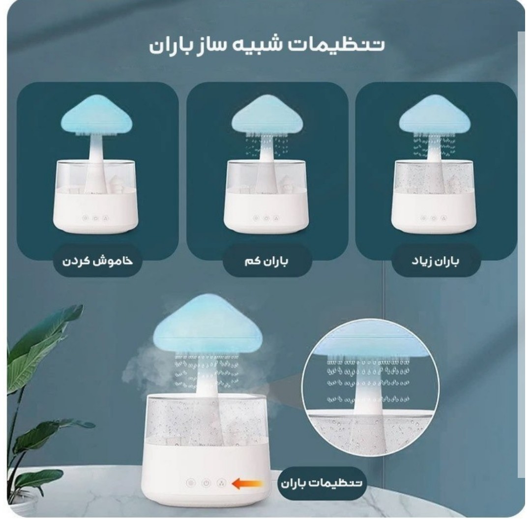 دستگاه بخور سرد و چراغ خواب قارچی بارانی ھمراه با اسپیکر دستگاه بخور و رطوبت ساز سرد طرح قارچی یک دستگاه بخور با چند قابلیت اضافه است که بیشتر برای زیباسازی دکوراسیون و به عنوان چراغ خواب مورد استفاده قرار میگیرد. قابلیتهای مختلف آن به وسیله کنترل از راه دور قابل تنظیم است. این دستگاه دارای 7 چراغ LED با 7 رنگ مختلف است که رنگ آنها به دلخواه قابل تغییر است. دستگاه به وسیله یک رابط Type-C به پاوربانک ، آداپتور یا لپ تاپ متصل می شود. تنظیمات و کنترل از راه دور از ویژگیهای مهم این محصول می توان به کنترل از راه دور و تنظیم و سفارشی سازی تمامی قابلیتهای آن اشاره کرد. برای مثال میتوان کار دستگاه را برای 5 ساعت تنظیم کرد تا بعد از گذشت زمان داده شده دستگاه بصورت خودکار خاموش شود. قطرات باران، رنگ نور و تغییر حالت نور نیز قابل تنظیم میباشند. شما میتوانید فقط از رقص نور، فقط از باران مصنوعی و یا از هر دو آنها باهم استفاده کنید. لازم به ذکر است که این دستگاه دارای قابلیت بخور سرد نیز می باشد اما این قابلیت آن بیشتر به صورت تزئینی می باشد و قدرت تولید بخار فراوان را ندارد.