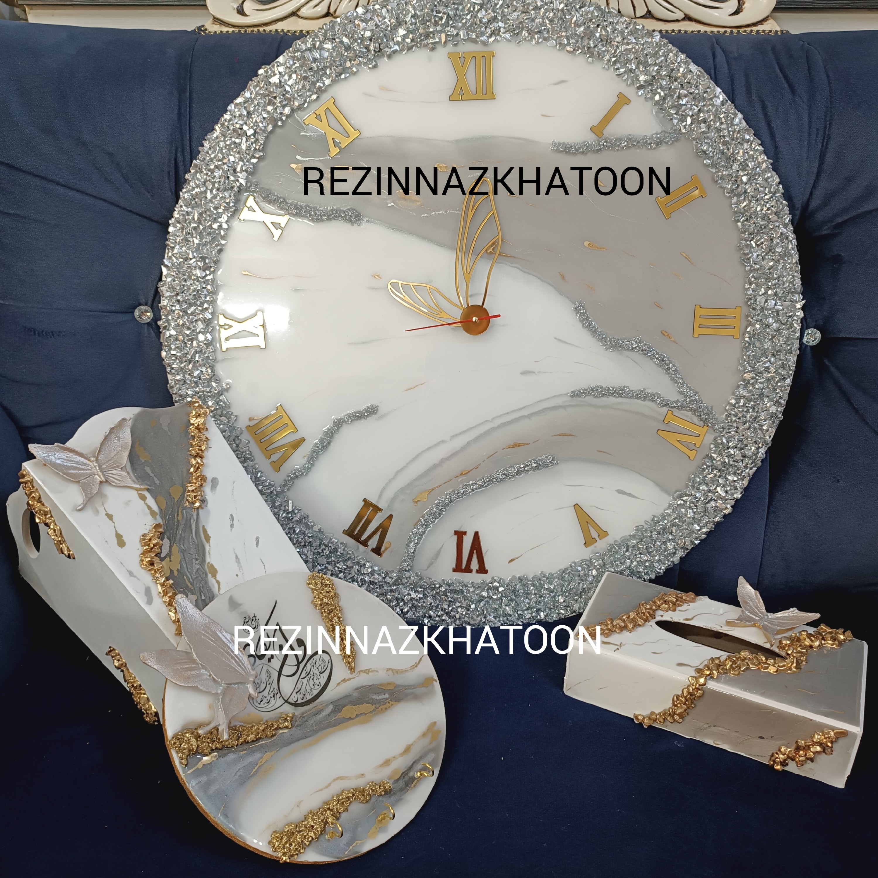 ساعت دیواری رزینی و جاکلیدی وان یکاد سفید نقره ای مبلمونسرا مدل 236957