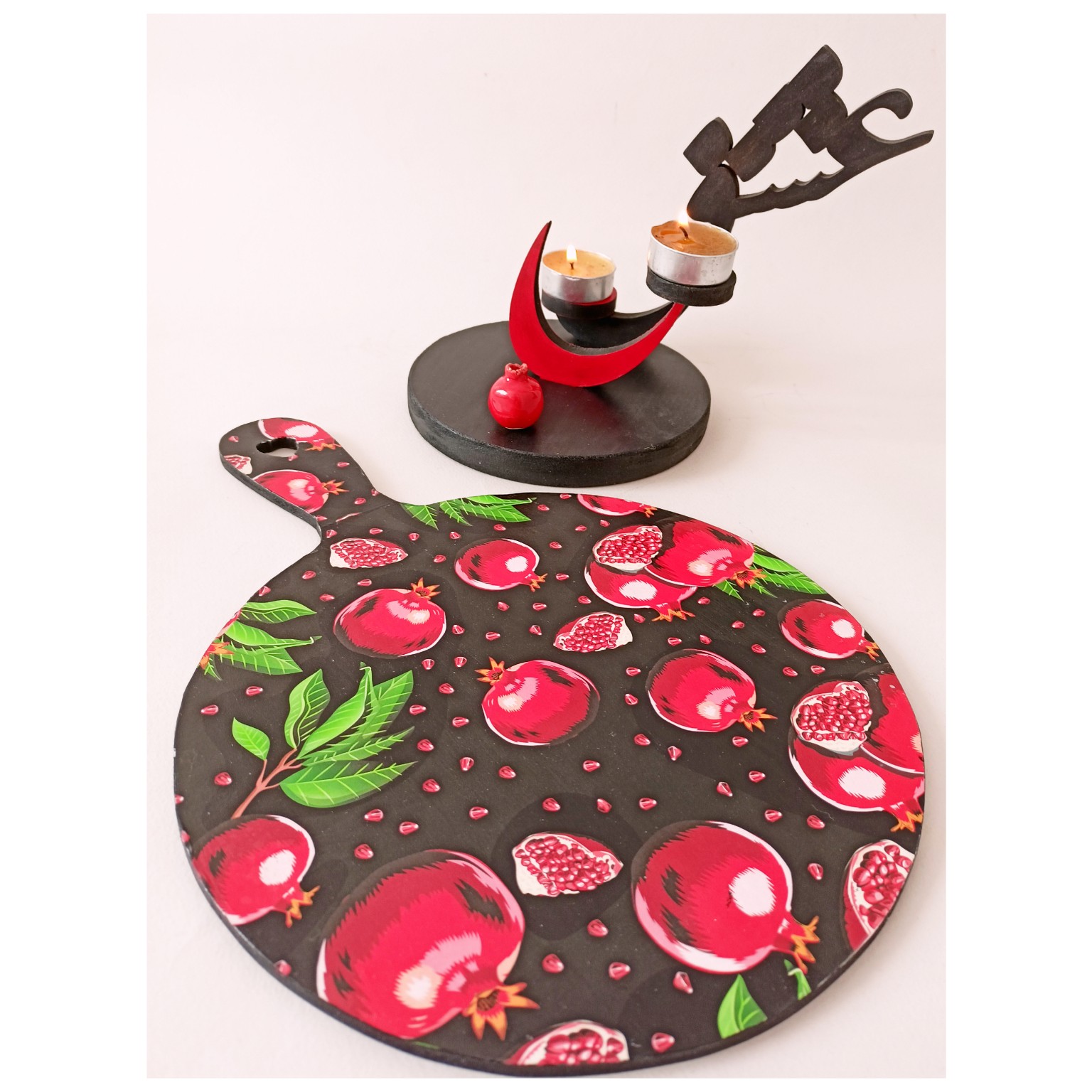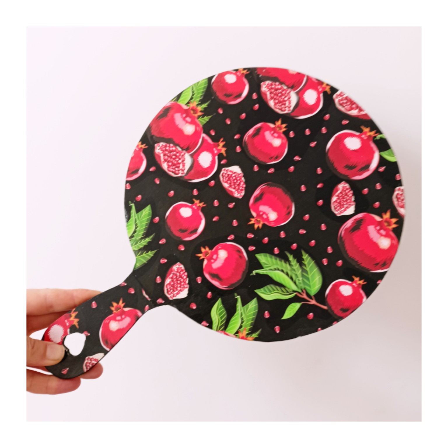 تخته سرو چوبی با طرح زیبای انار از محصولات هنری و دستساز گالری بارون هست که با رنگ مشکی،رنگ آمیزی شده و با تکنیک دکوپاژ تزئین شده است. در مرحله نهایی، این تخته دکوراتیو با مواد تثبیت کننده کاور شده و قابلیت شستشو دارد. بعد از شستشو با پارچه نخی آبگیری شود تا دوام بیشتری داشته باشد. از این تخته سرو خاص به عنوان تابلوی آشپزخانه هم میتوان استفاده کرد.مناسب برای سرو کیک، نان، پیتزا،ماگ و لیوان. با قرار گرفتن روی پایه به عنوان تابلوی دکوری میتوان فضای آشپزخانه را آراسته کرد. ابعاد تخته چوبی فانتزی میباشد. زیر فنجانی از این طرح شیک هم قابل اجراست. تخته سرو هدیه است برای دوستداران هنر مدرن و جهیزیهای خاص.