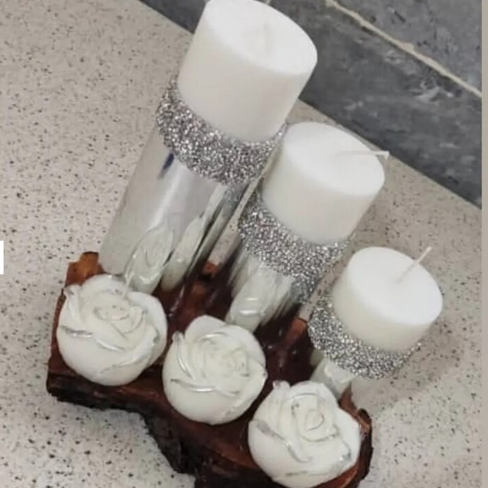 شمع استوانه سه تایی وگل رز سفیدطلایی مبلمونسرا مدل 283562
