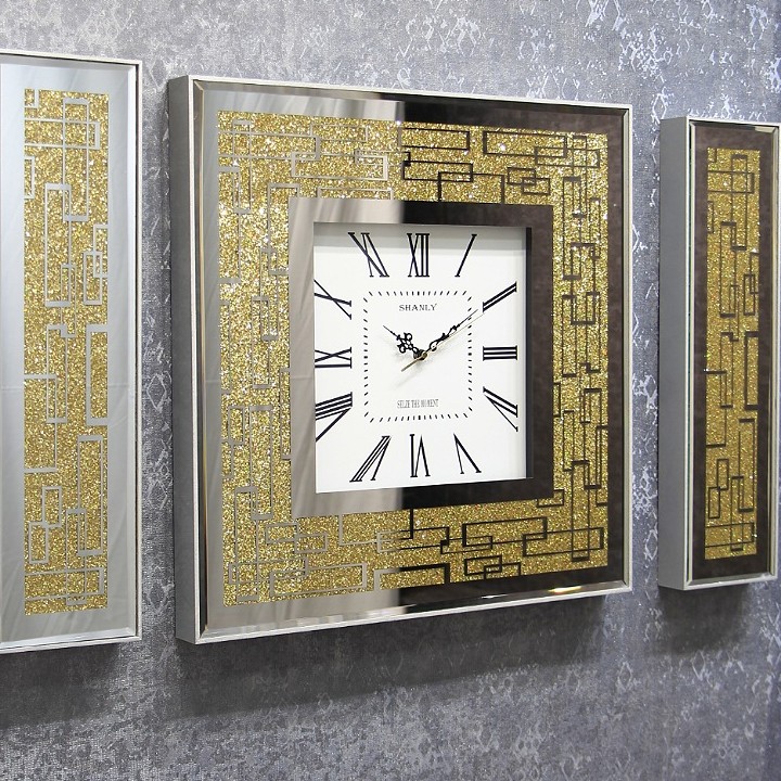 ساعت دیواری آیینه ای 3 تیکه طرح مستطیل نامنظم رنگ سفید طلایی مبلمونسرا مدل 237297