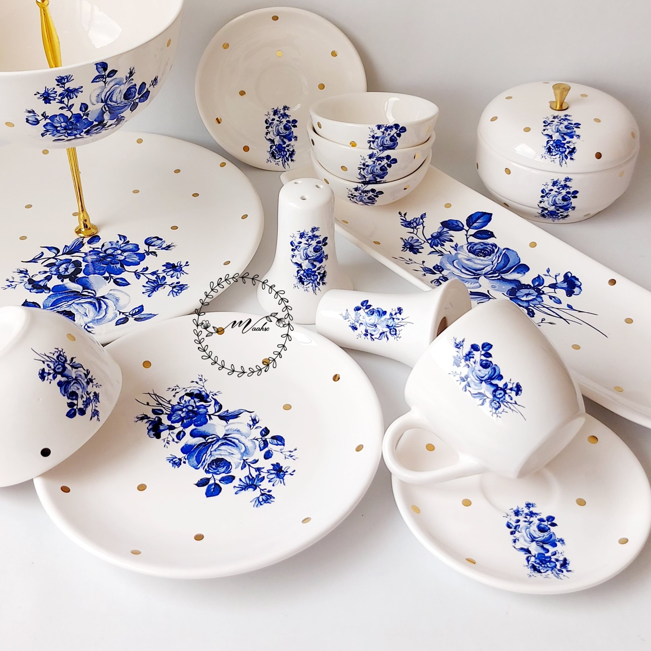 سرویس پذیرایی 26 پارچه سرامیکی طرح رز آبی طلاکوب مبلمونسرا مدل 275825