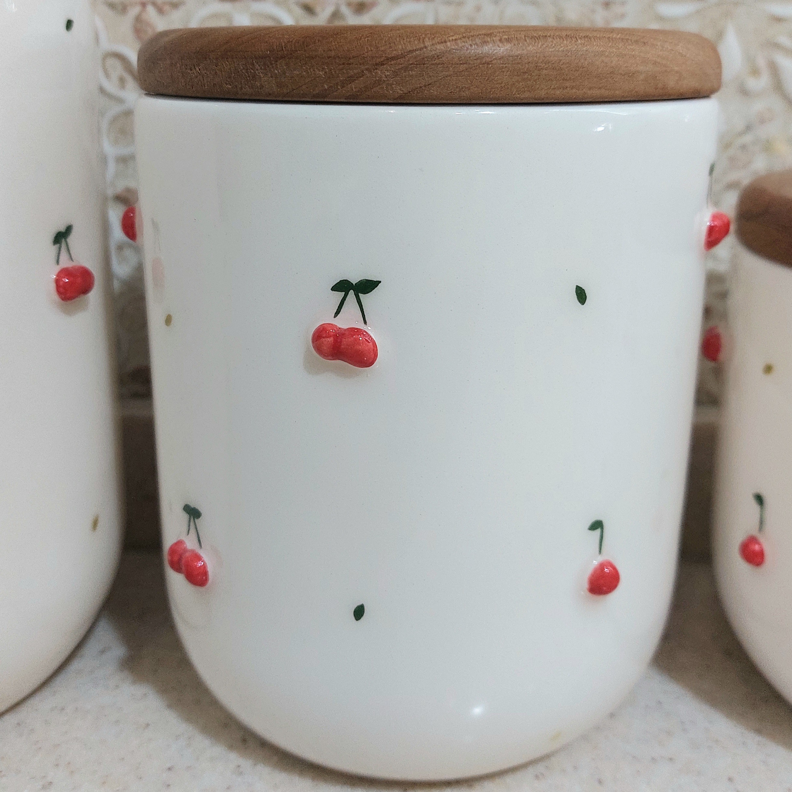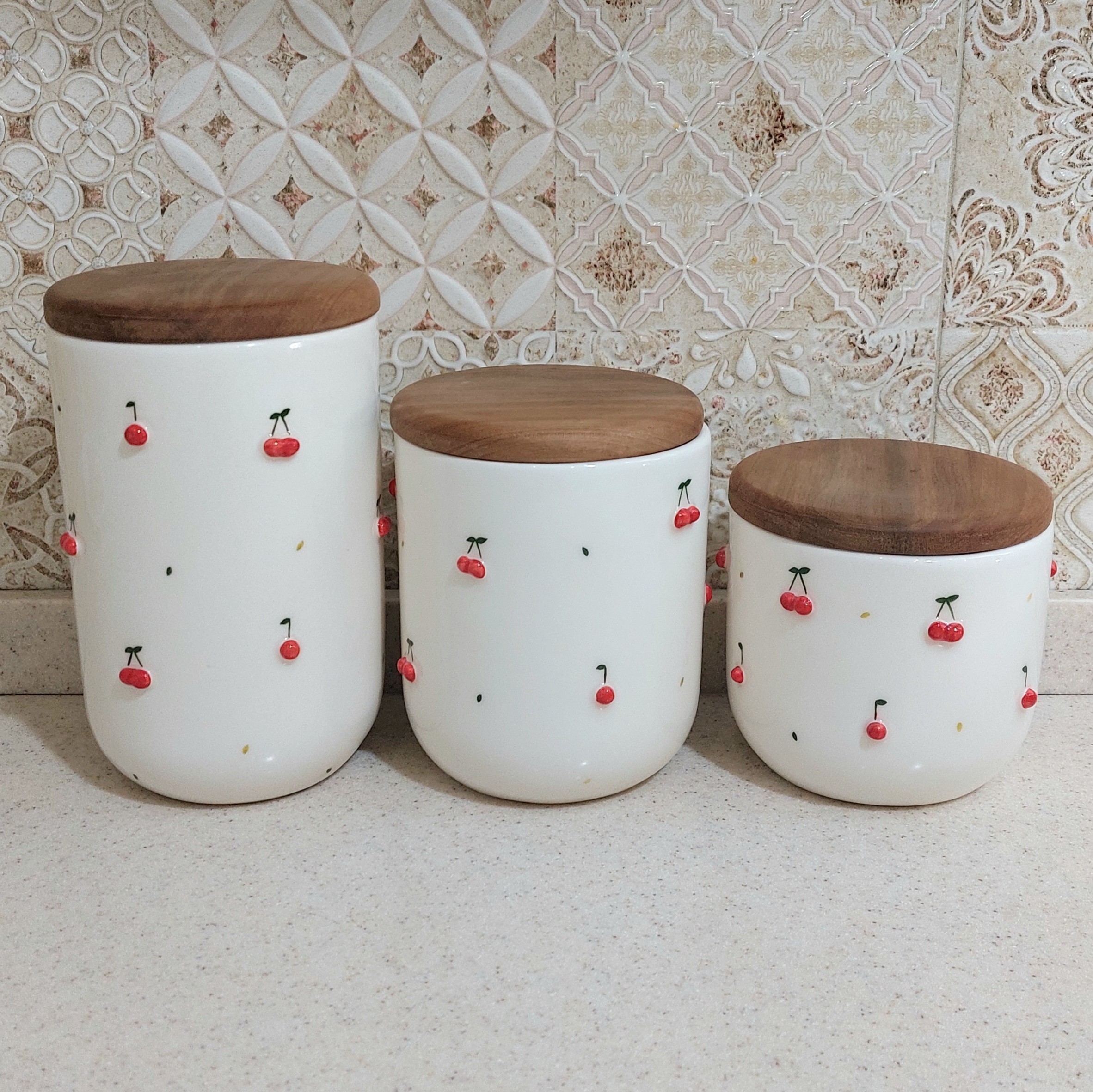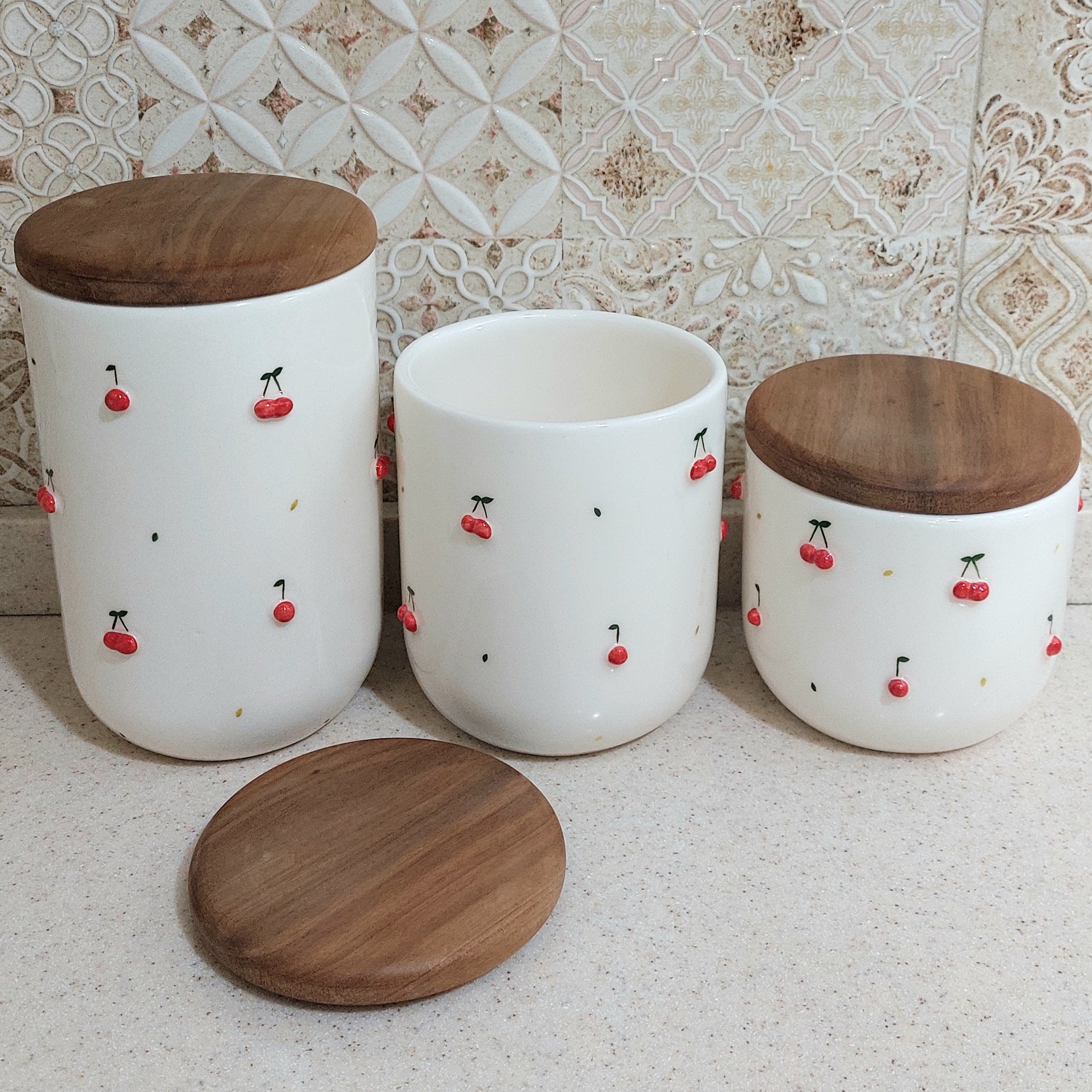 بانکه آلبالو برجسته 3تایی قطر دهانه 11سانت ارتفاع 9 و 12 و 16سانت جنس سرامیکی کار کاملا دستسازه با درب های چوبی با کیفیت بالا