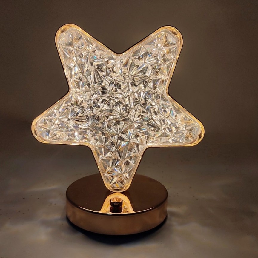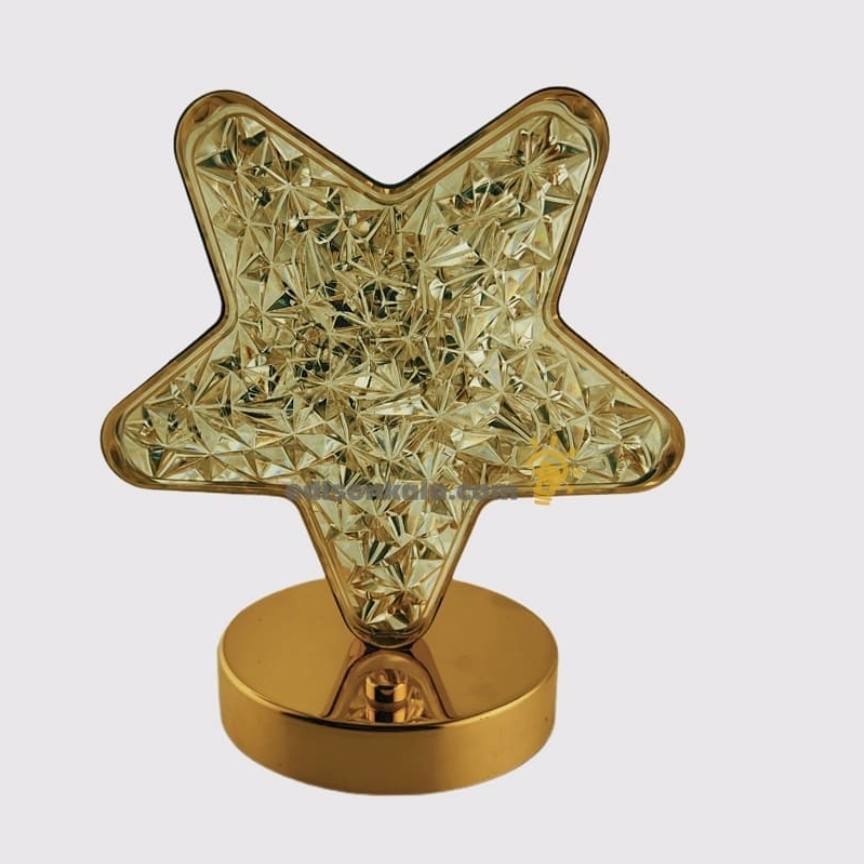 چراغ خواب رومیزی کریستالی ستاره از چراغ های شب خواب مناسب کنار تخت خواب می باشد. نوردهی این چراغ به صورت سه حالته در رنگ های مهتابی، آفتابی و استاندارد می باشد. با هر بار لمس کردن دکمه روی چراغ رنگ نور چراغ عوض می شود. این چراغ خواب با هر بار شارژ می تواند تا 12 ساعت روشن بماند. مدت زمان شارژ آن بستگی به شدت نور استفاده از آن و رنگ نور مورد استفاده دارد. شدت نور چراغ با نگه داشتن لمس روی دکمه کم یا زیاد می شود. بدنه این چراغ فلزی با آبکاری طلایی رنگ میباشد و طلق رویه کریستالی چراغ پلاستیکی میباشد که ظاهر تفاوتی با شیشه ندارد ولی این مزیت که در صورت ضربه مقاومت بالاتری نسبت به شیشه دارد و نمیشکند . همچنین حالت کریستالی چراغ باعث زیبایی هرچه بیشتر این چراغ می شود. این چراغ در طرح های مختلف نظیر ماه، ستاره، گل، طاووس، حلال و … تولید می شود.