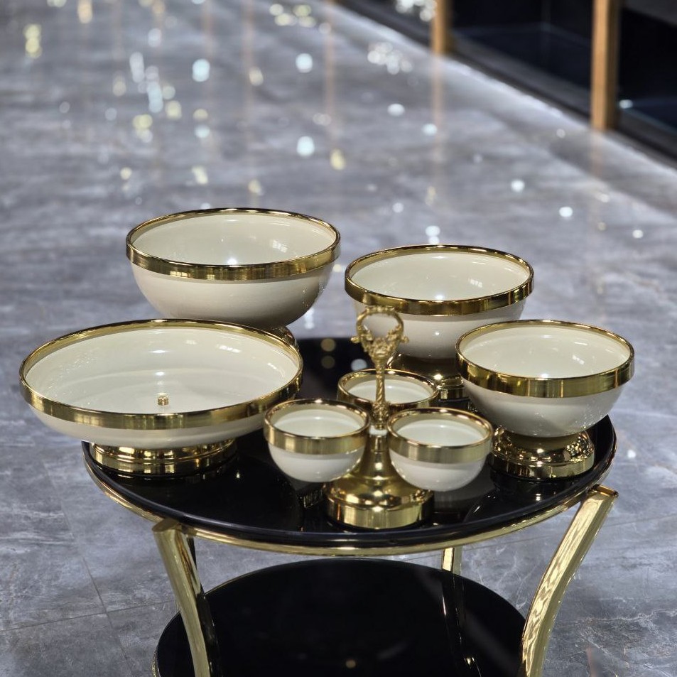 ست پذیرایی 5 تیکه شامل شیرینی خوری میوه خوری آجیل خوری شکلات خوری اردو خوری ست پذیرایی شیک وساده و قیمت مناسب از مزایای این مدل هست