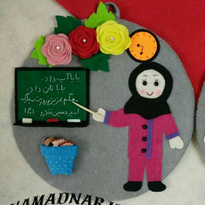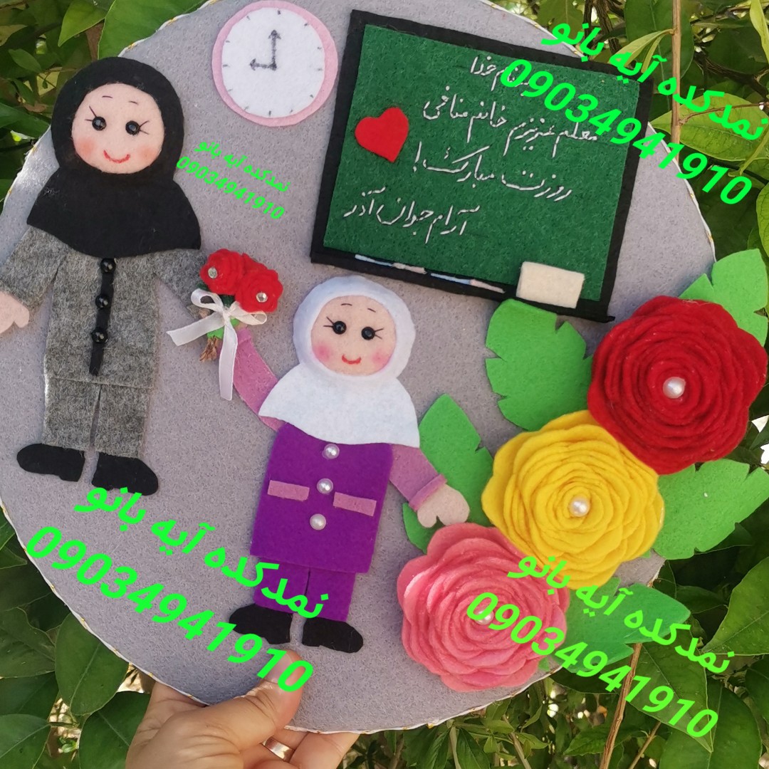 تابلو نمدی با نوشته های یادگاری و یادآوری خاطره های دوران ابتدایی همراه با تبریک روز معلم با اسم دانش آموز عزیز💞