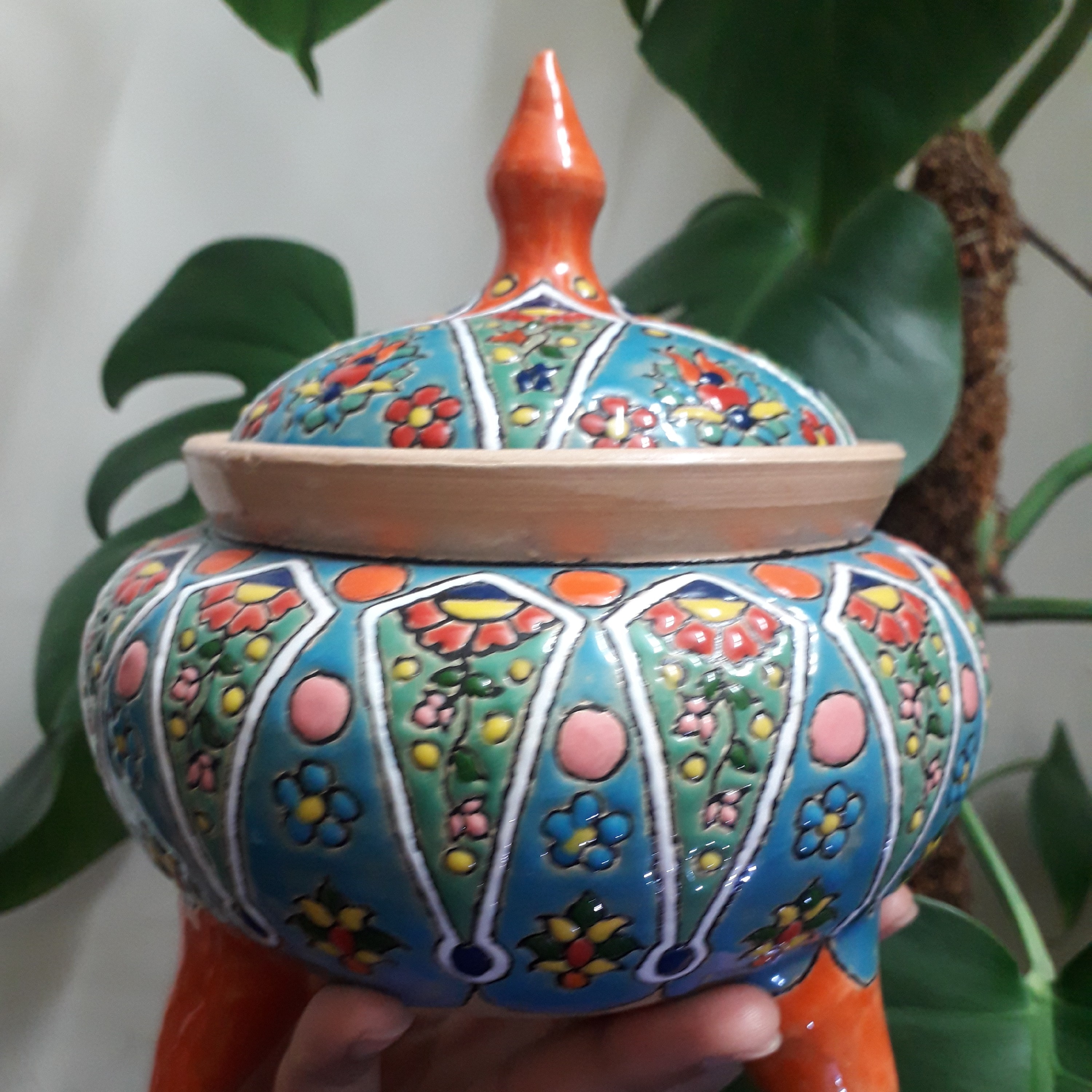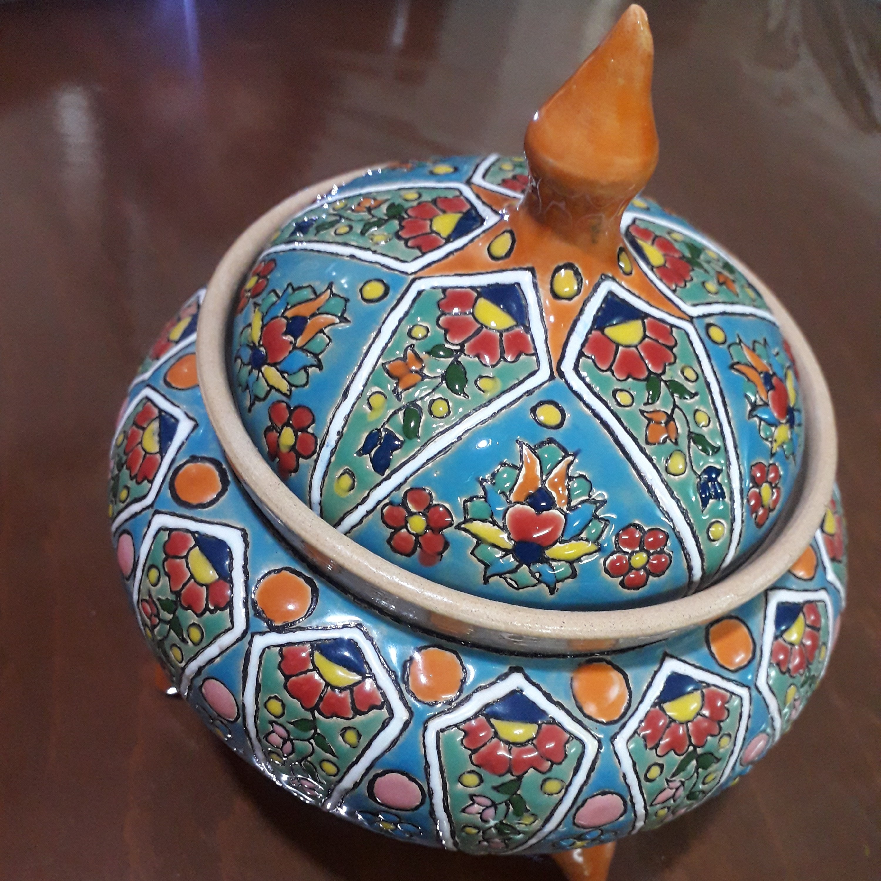 ظرف شکلات خوری سفالی میناکاری سه پایه زیبا و قابل شستشو 🥰دهنه 12 سانتی وارتفاع12 و پهنای 15 سانتی لطفا قبل از سفارش موجودی بگیرید🙏
