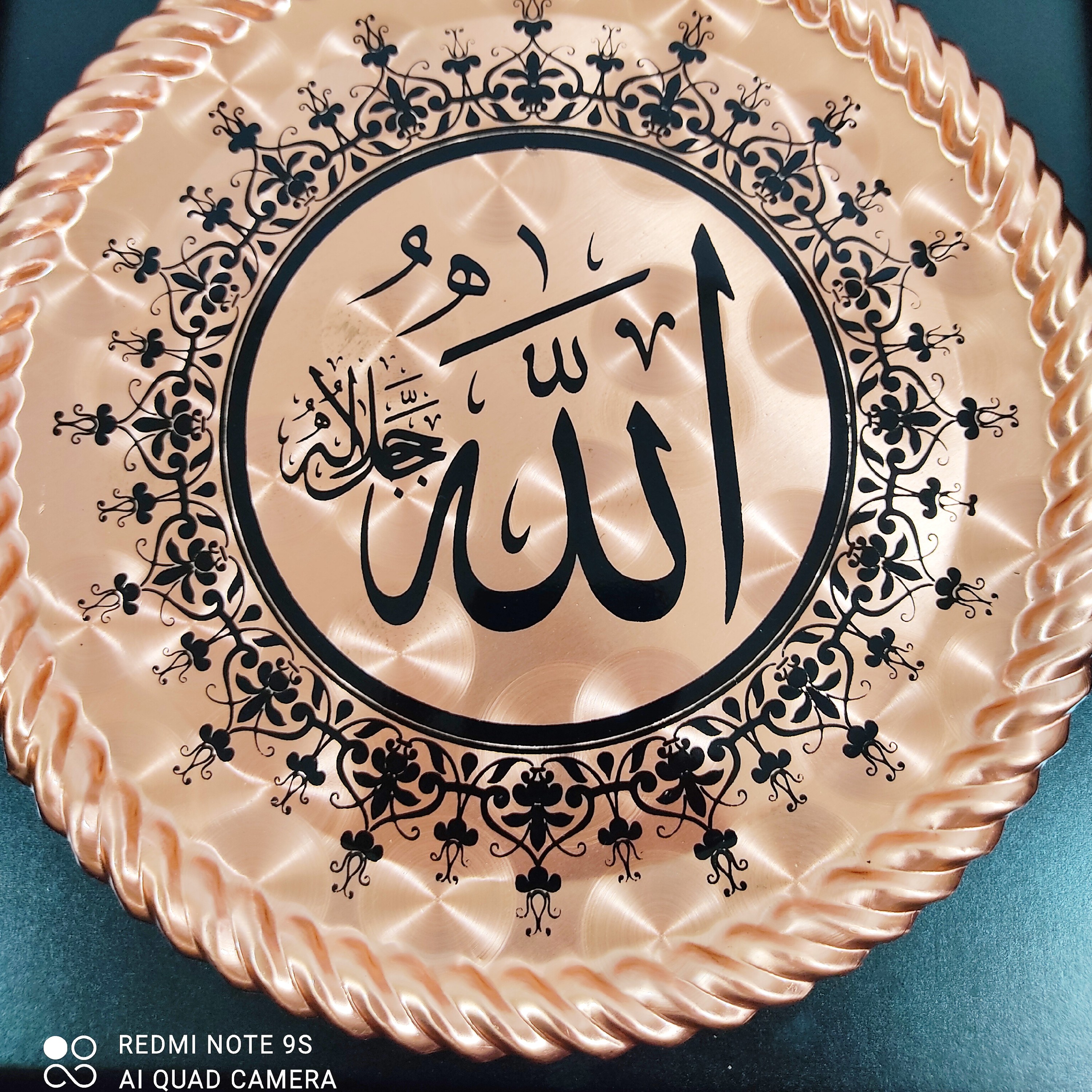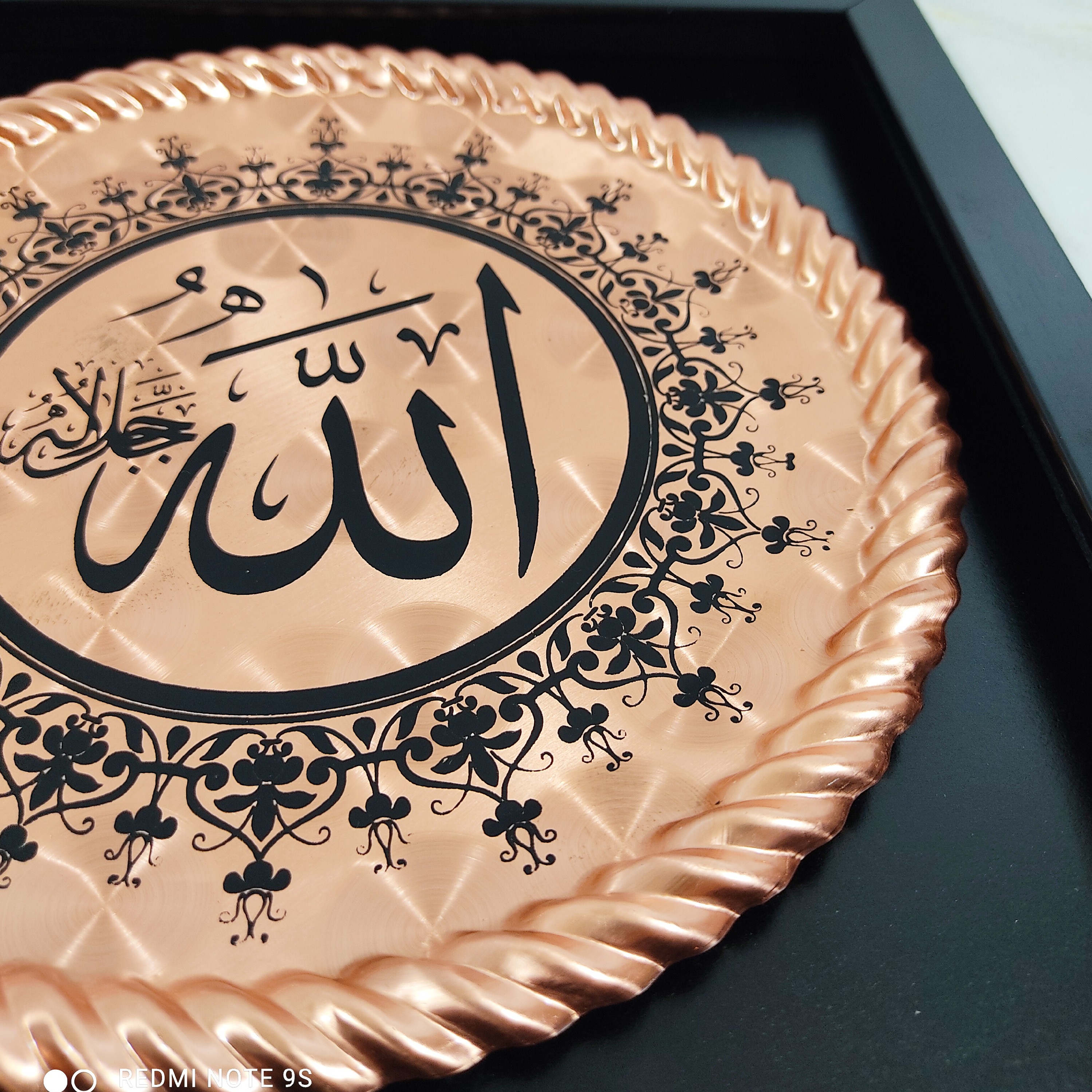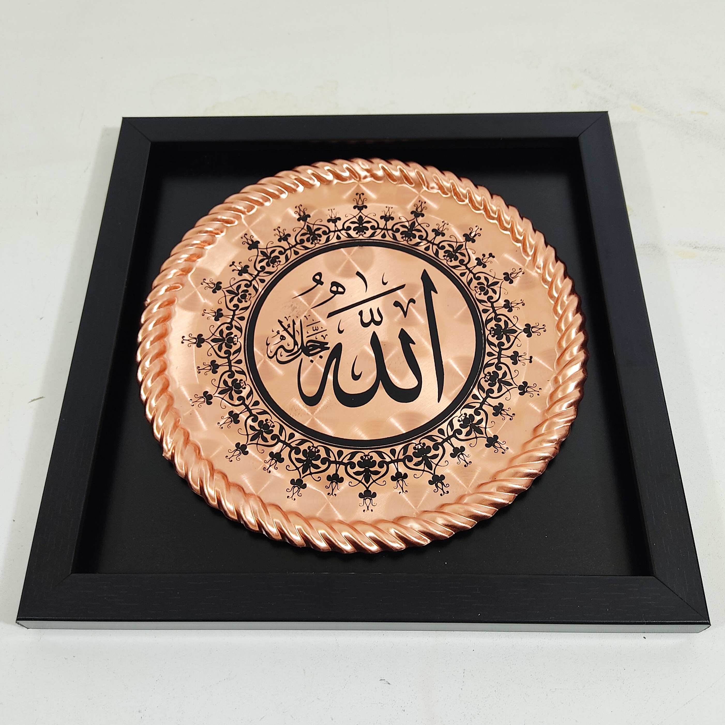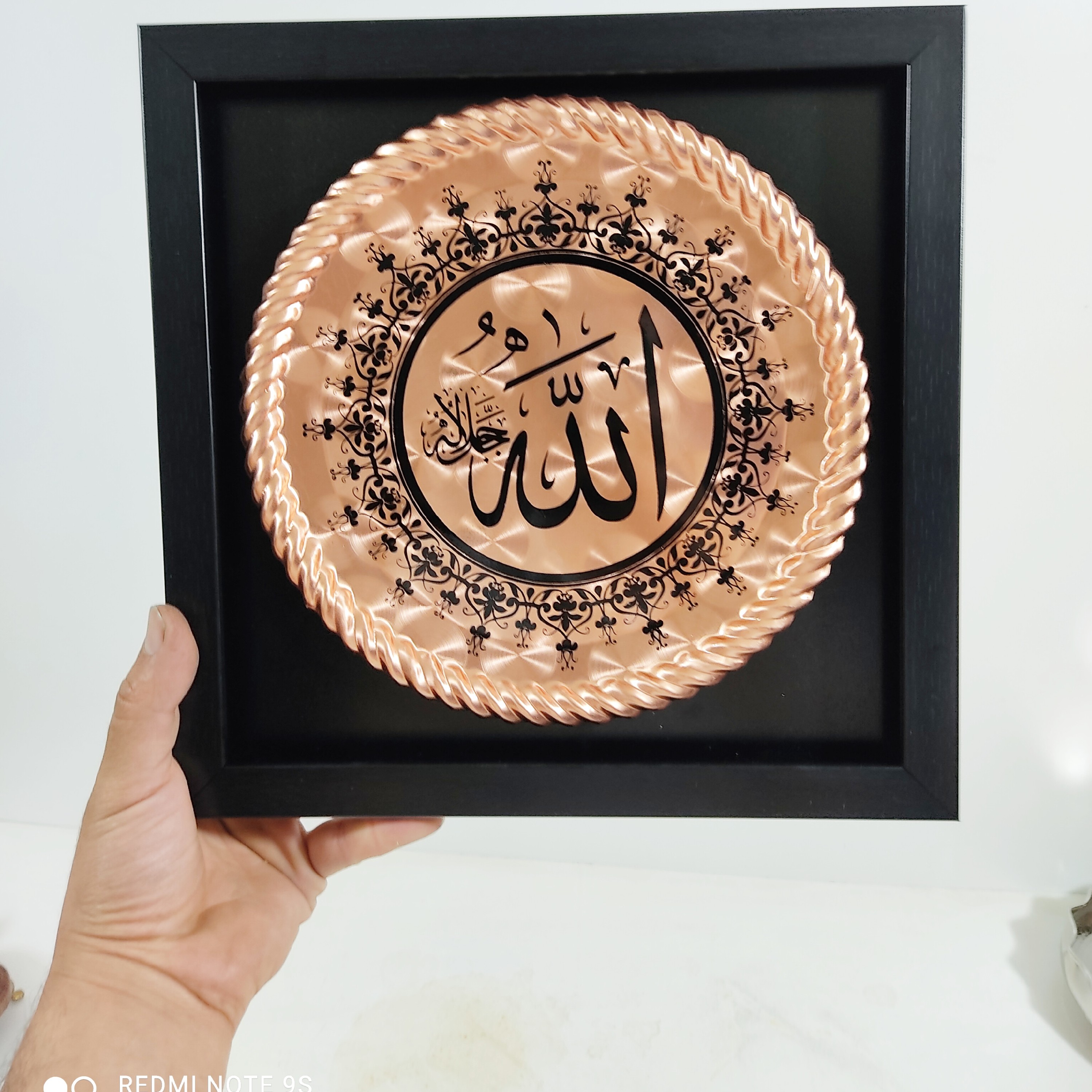 تابلو مسی یا دیوارکوب مسی با نام الله مربع 30 در 30 سانتی متر مناسب کادو دارای جای آویز ورق مسی بسیار خالص موجود در 33 طرح الله وانیکاد و چهارقل