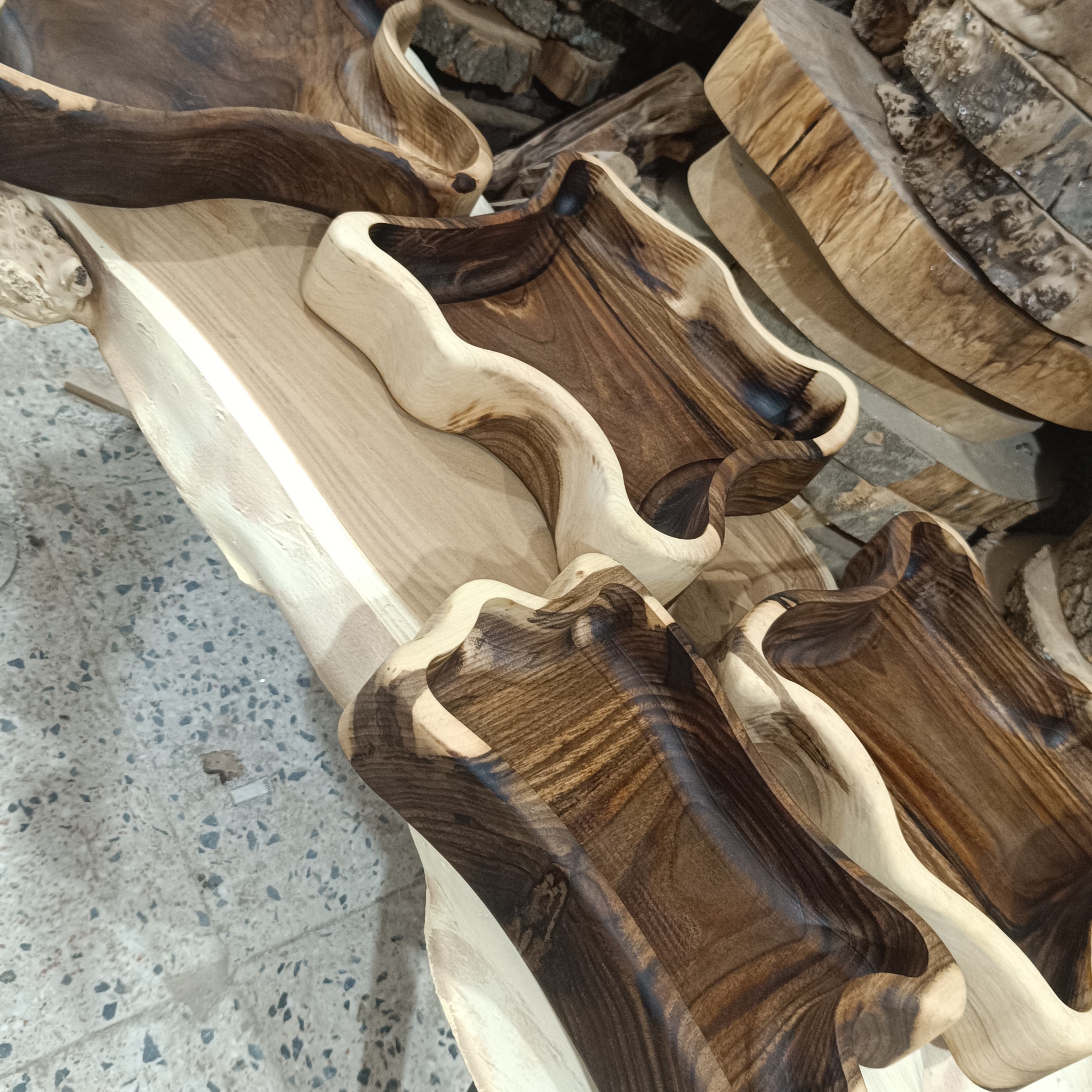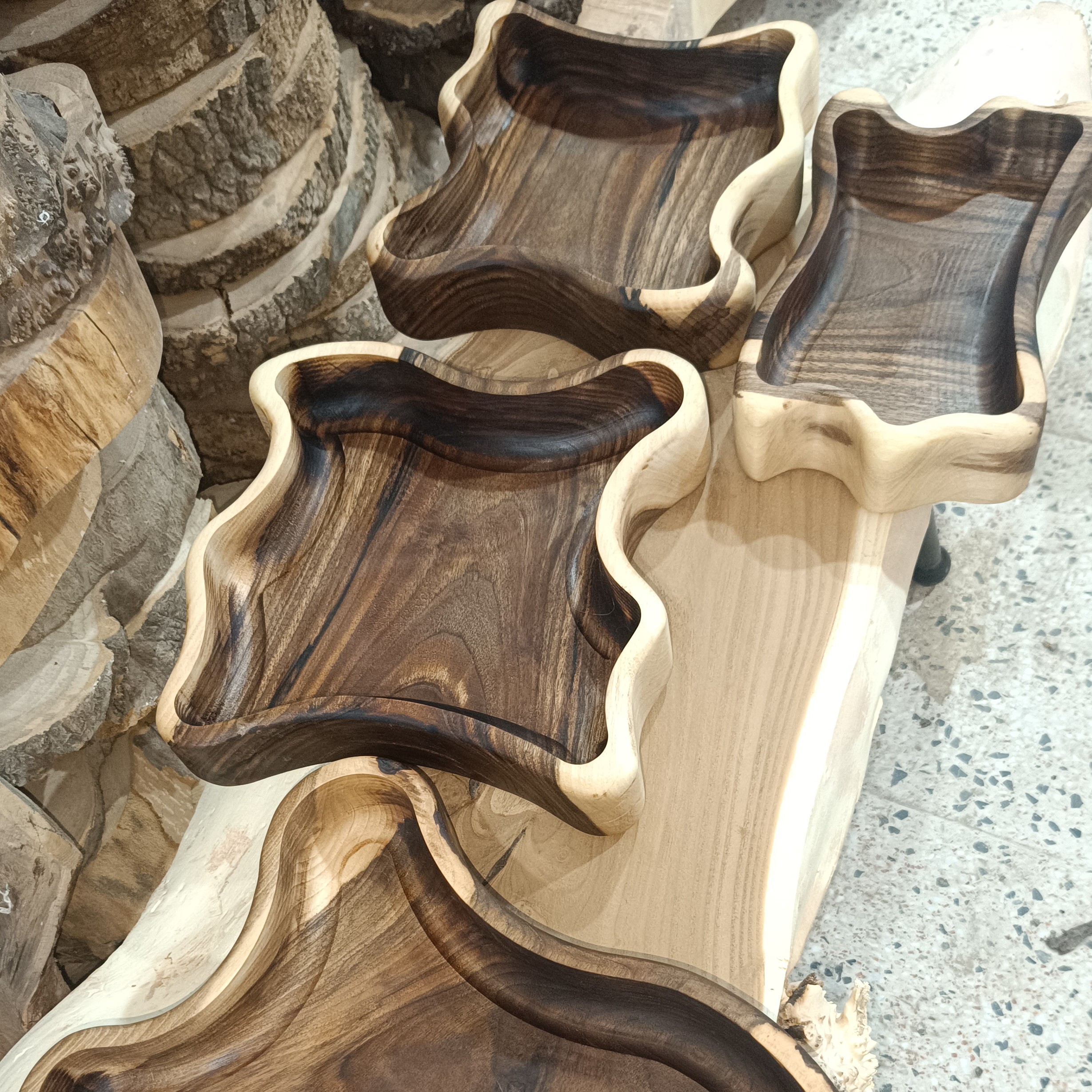 ست سرویس پذیرایی چوبی چوب گردو پوشش روغن آب گریز یکعدد آجیل خوری یک عدد شیرینی خوری یک عدد میوه خوری و شکلات خوری