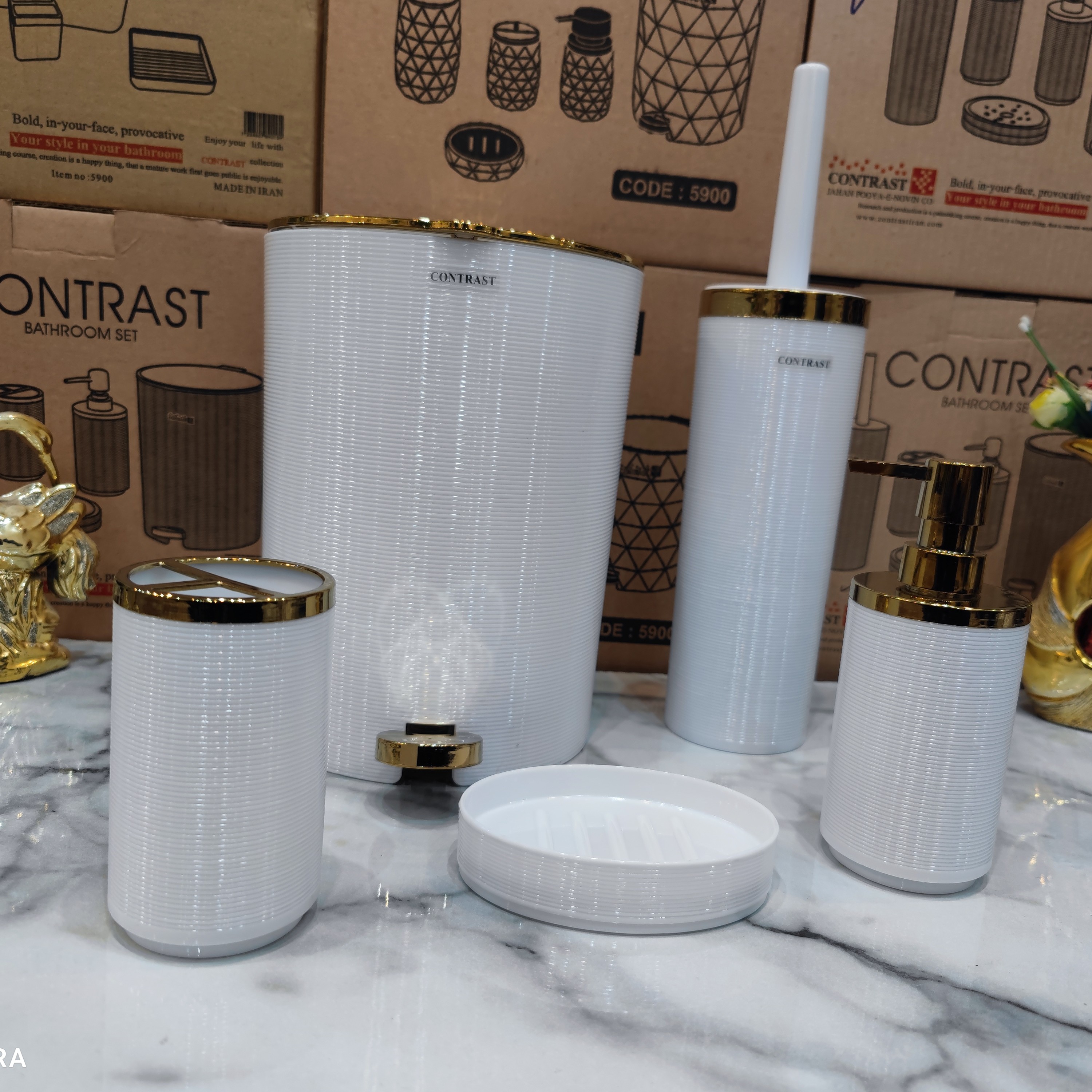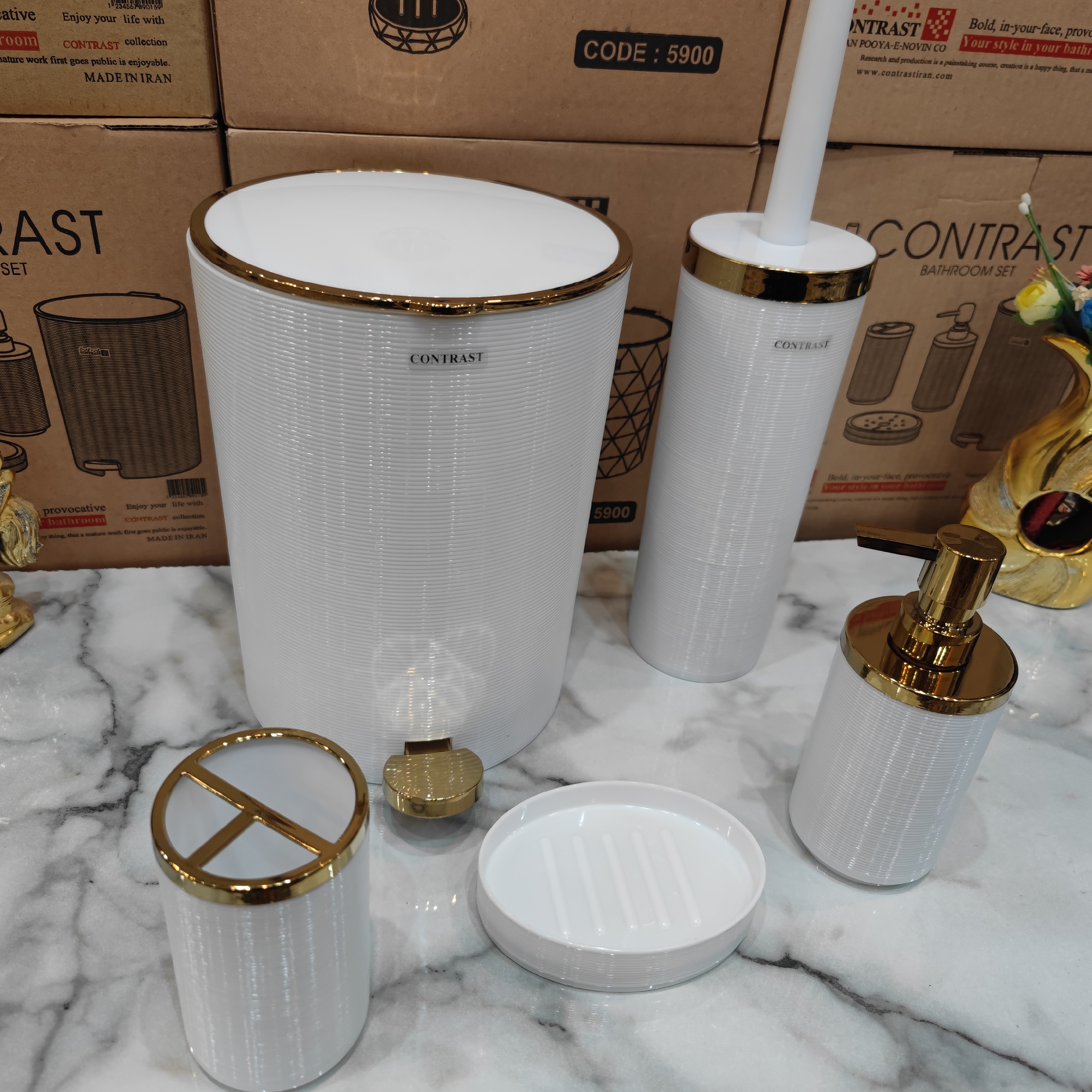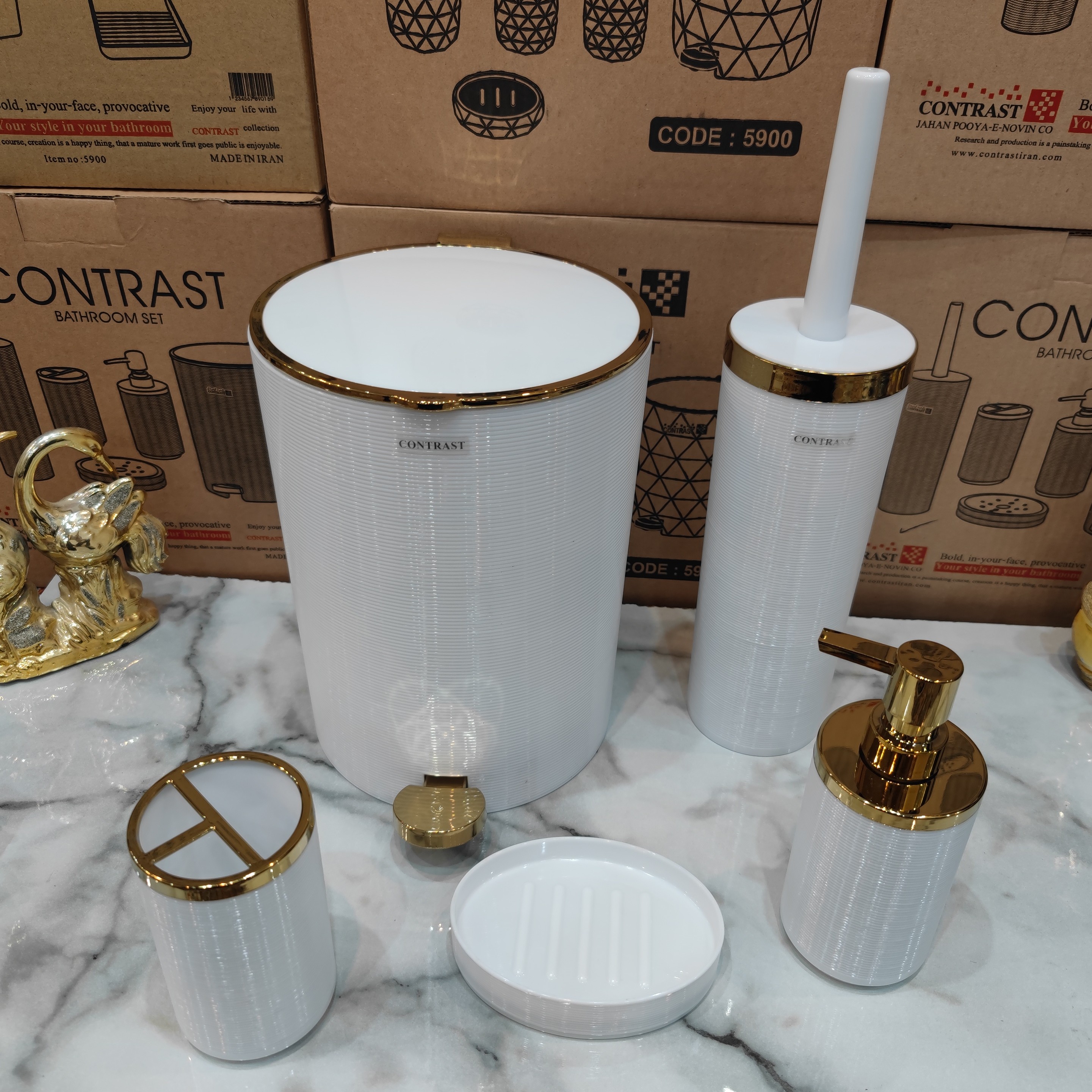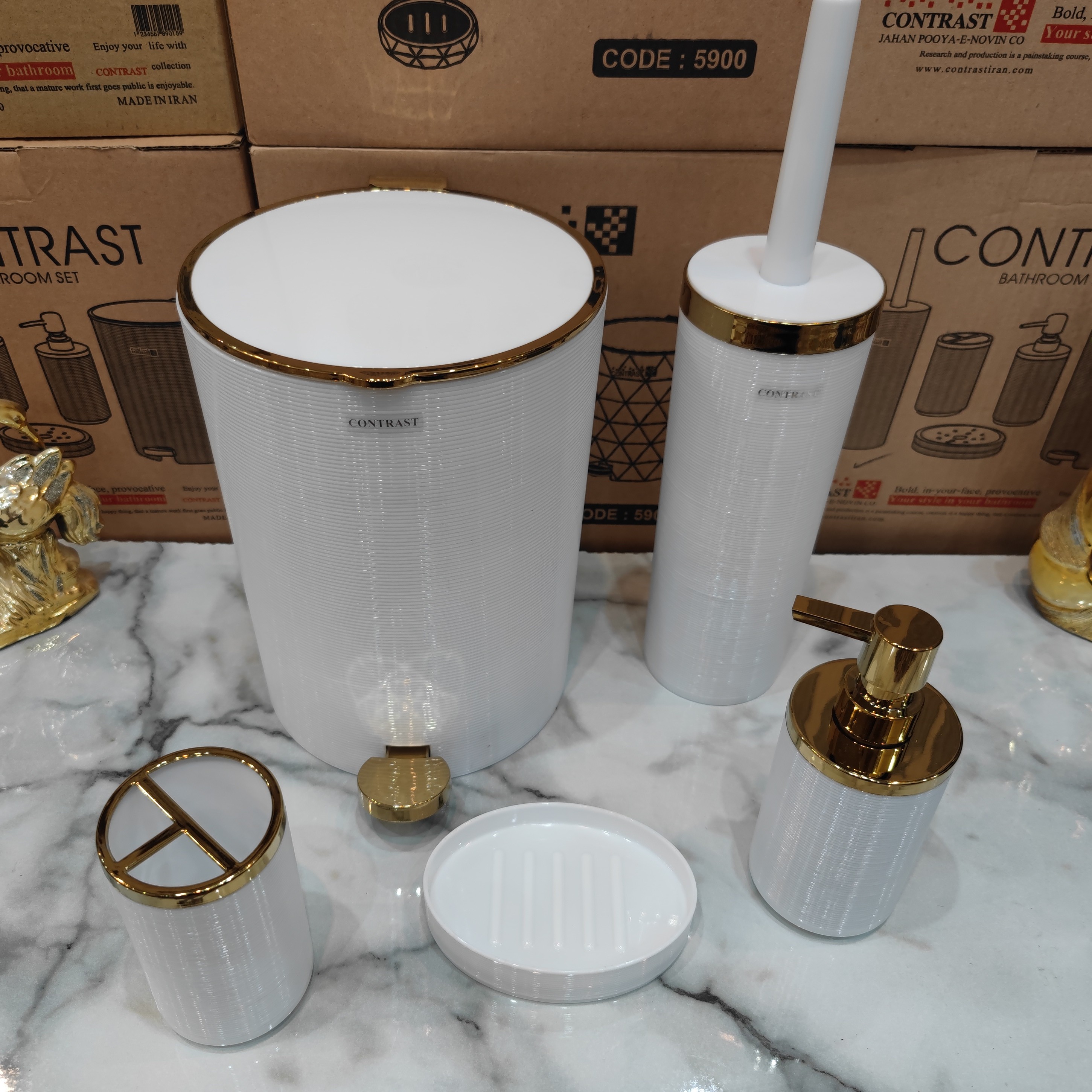 ست سرویس بهداشتی 5 پارچه طرح شکیل خط ریز برند کنتراست رنگ زیبا و پرطرفدار و جذاب سفید طلایی نو آکبند مبلمونسرا مدل 265212