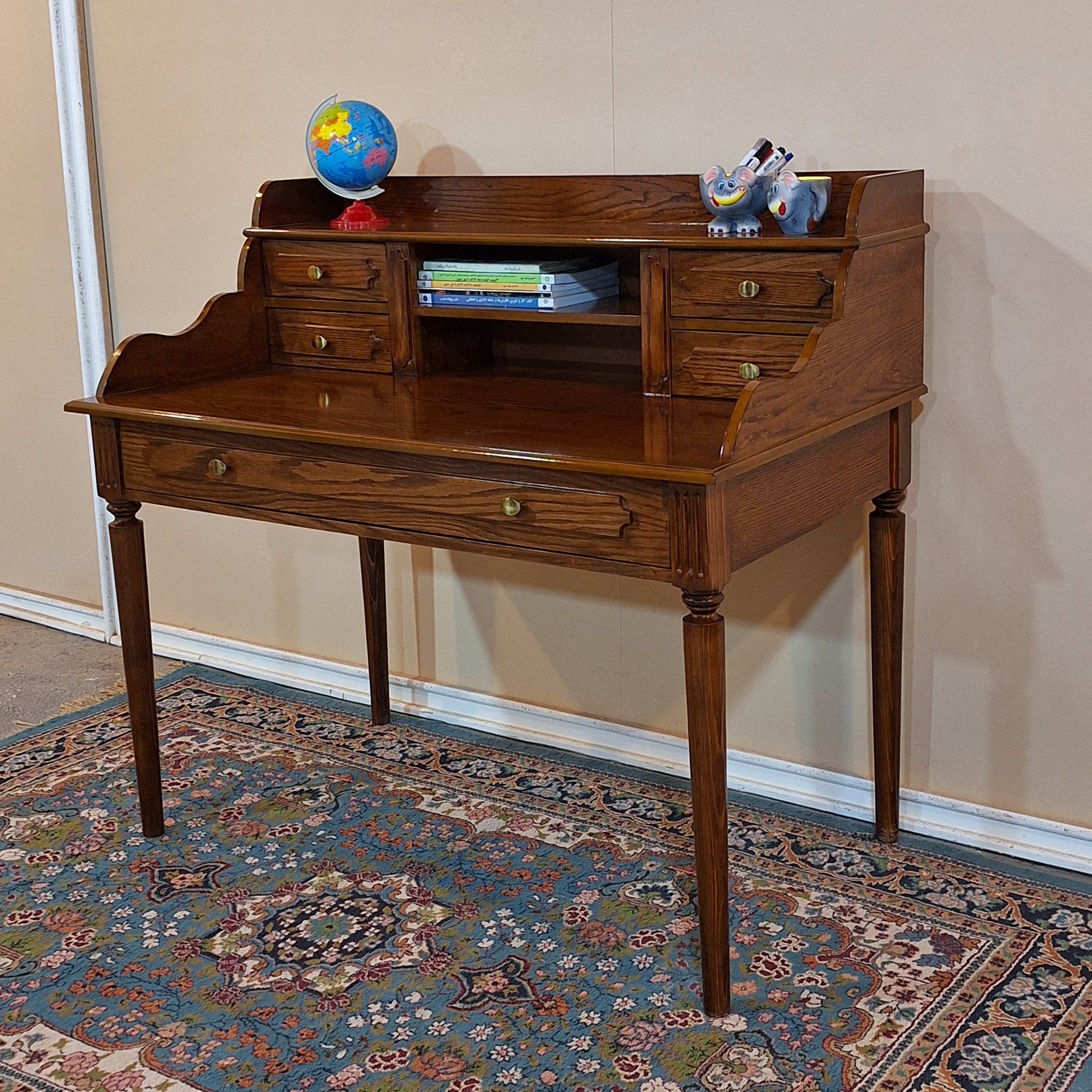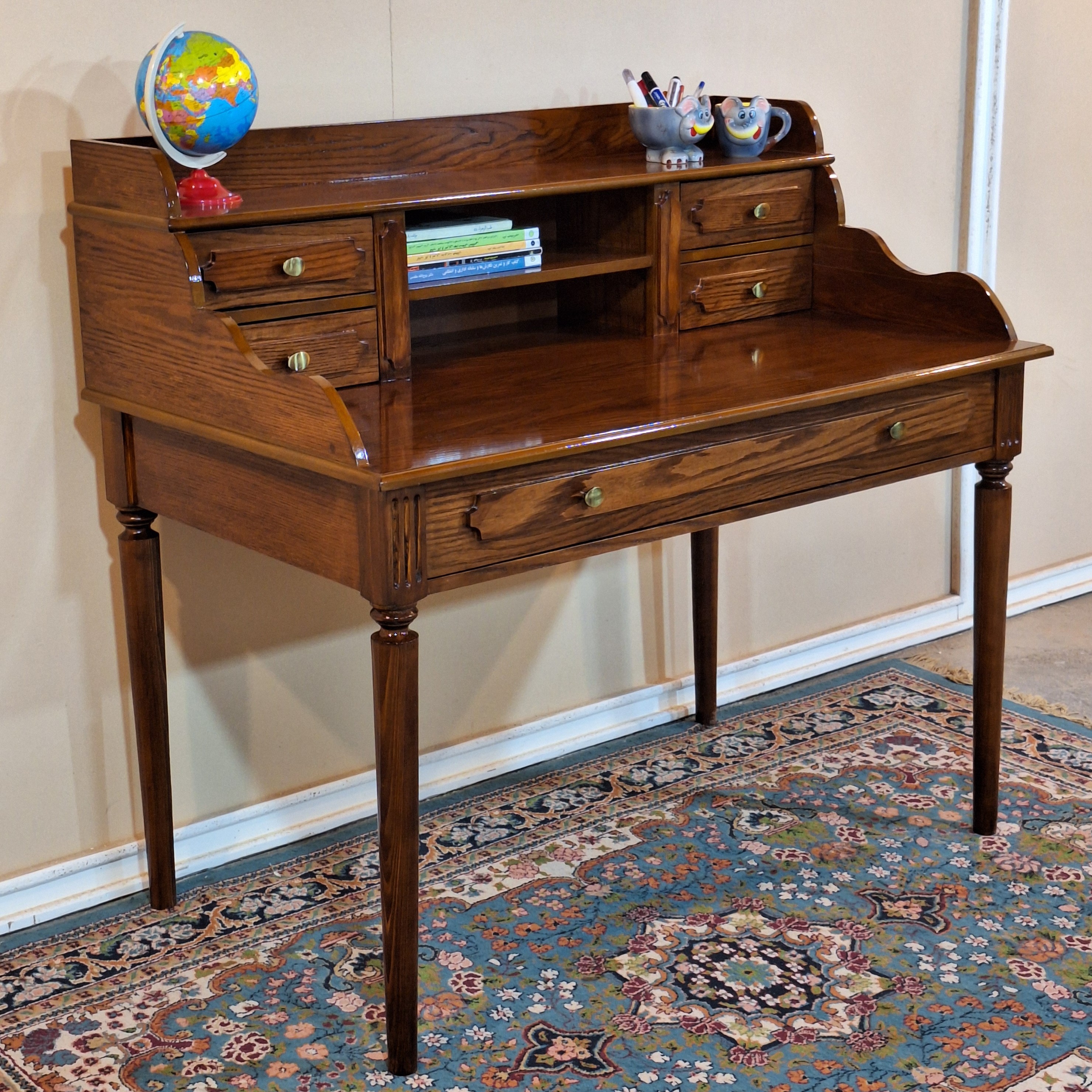 میزتحریر کلاسیک کار پرفروش و پر طرفدارمون با ابعاد: 120/60/107 جنس: پایه ها چوب روس و بدنه ام دی اف روکش چوب طبیعی بلوط ، ریل کشو بزرگ ساچمه ای سه زمانه پهن ،ریل کشو کوچک چوبی با دستگیره انتخابی صندلی ضربدری باچوب راش درجه یک رنگبندی به صورت سفارشی دلخواه شماست. ارسال به سراسر کشور داریم هزینه ارسال به عهده مشتری و به صورت میباشد.