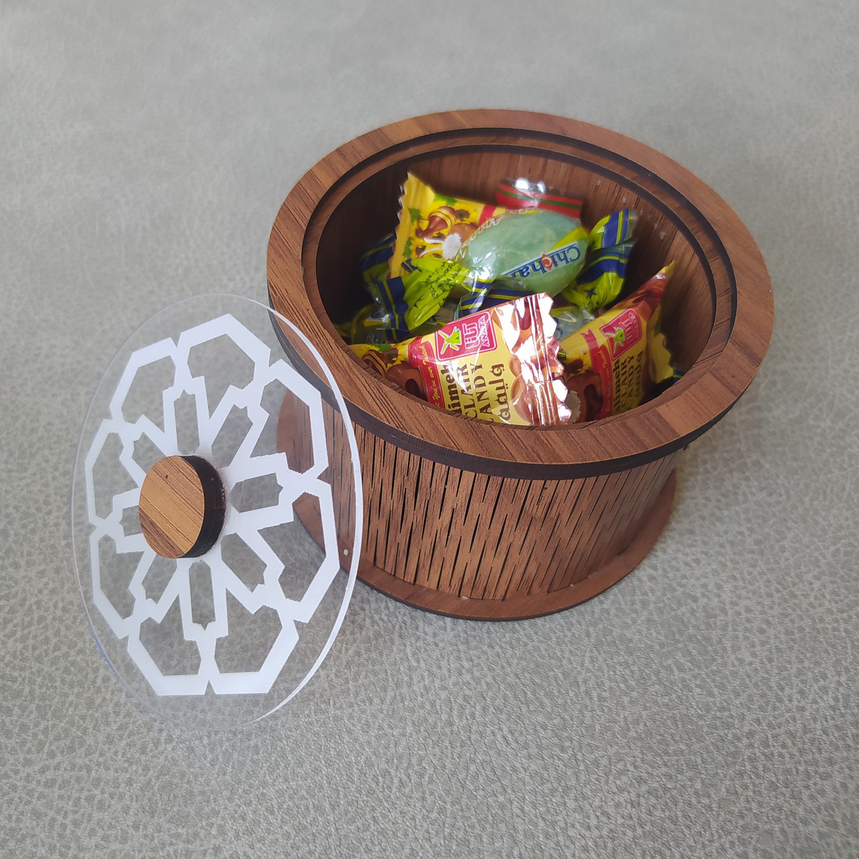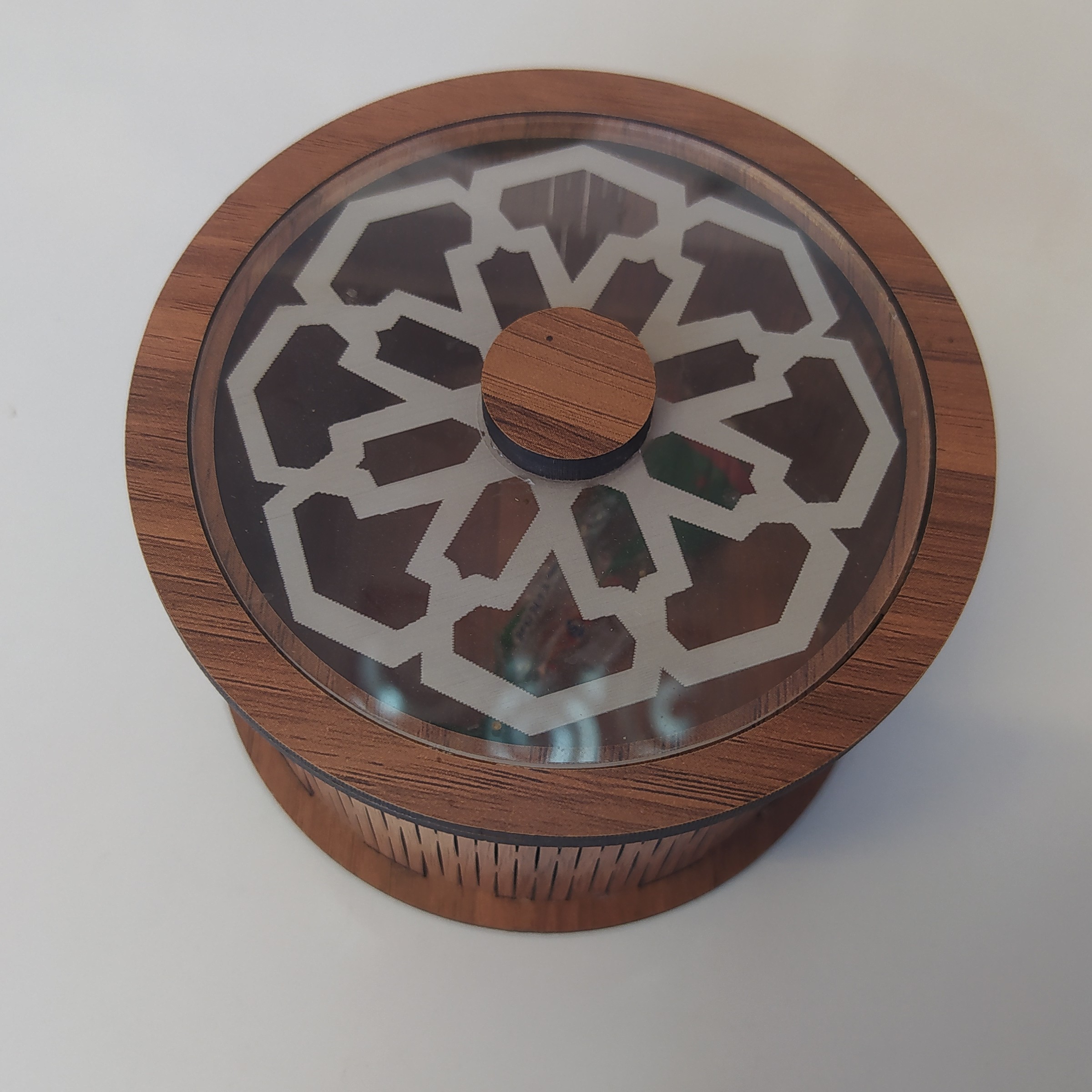 قندان چوبی رنگ فندقی با درب شفاف وطرح اسلیمی شفاف