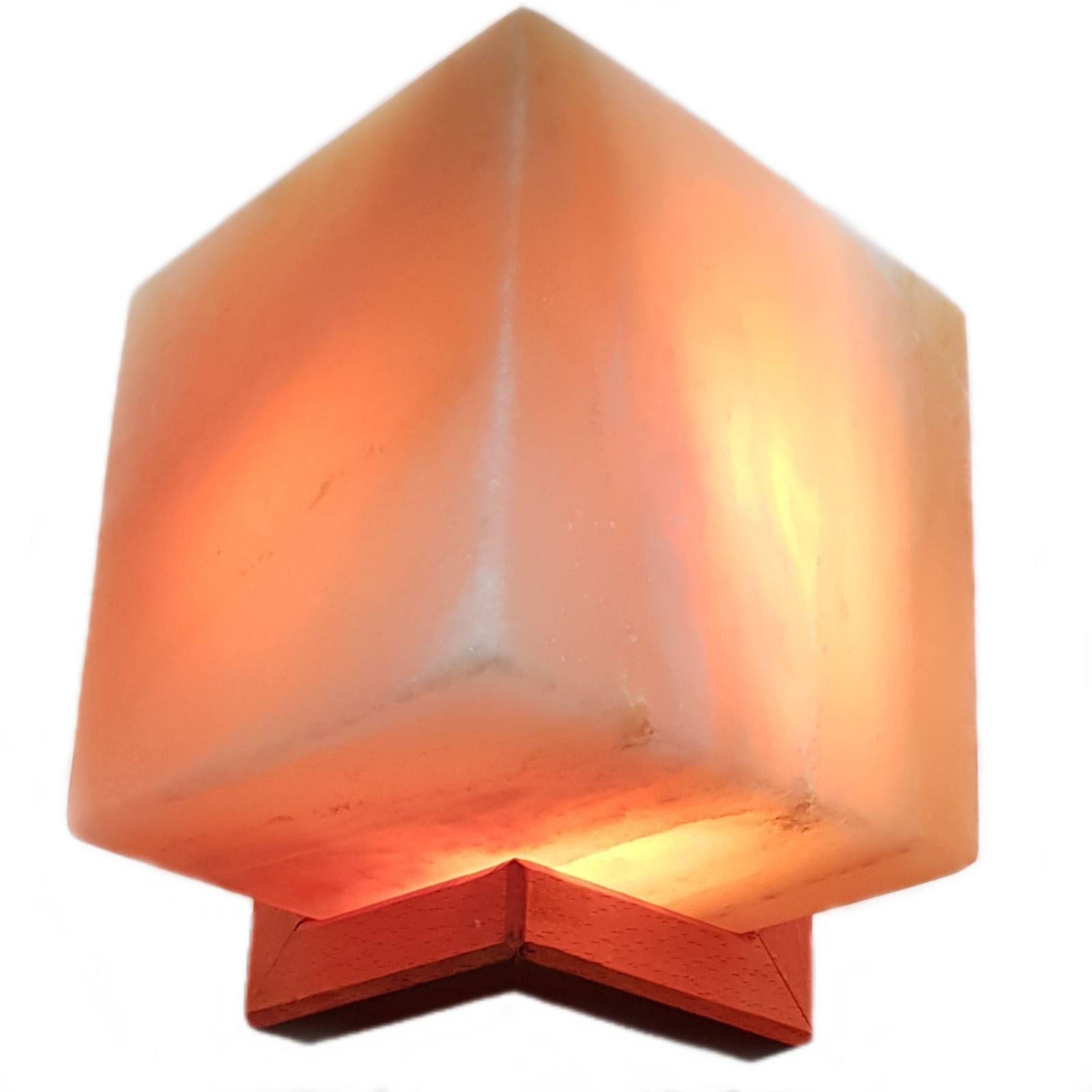 چراغ خواب سنگ نمک طرح مکعب با پایه چوبی مناسب برای اتاق خواب ، آشپزخانه و پذیرایی میباشد.چون سنگ نمک طبیعی است رگه های موجود در سنگ بصورت تصادفی میباشد که این امر خود زیبایی محصول را دو چندان میکند.