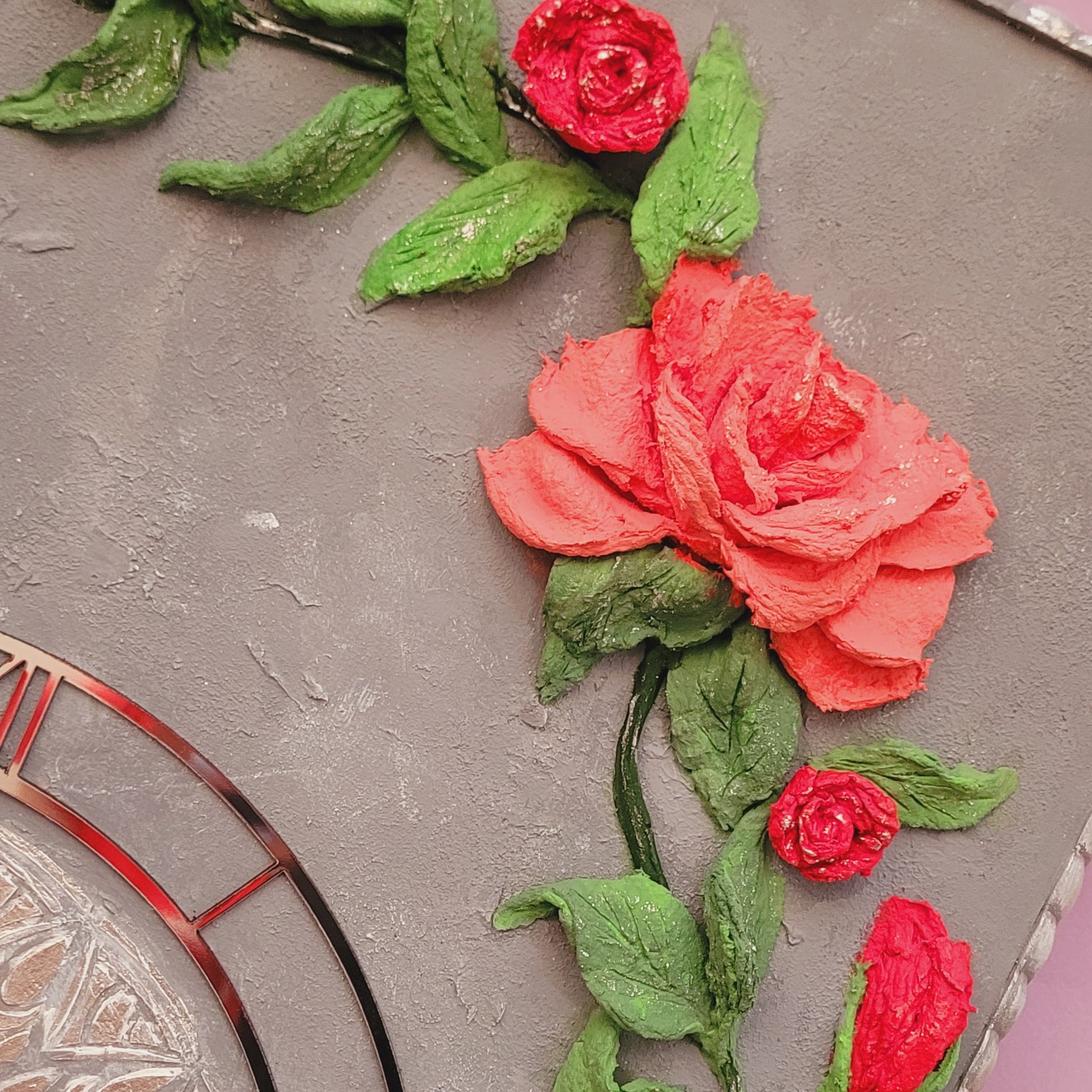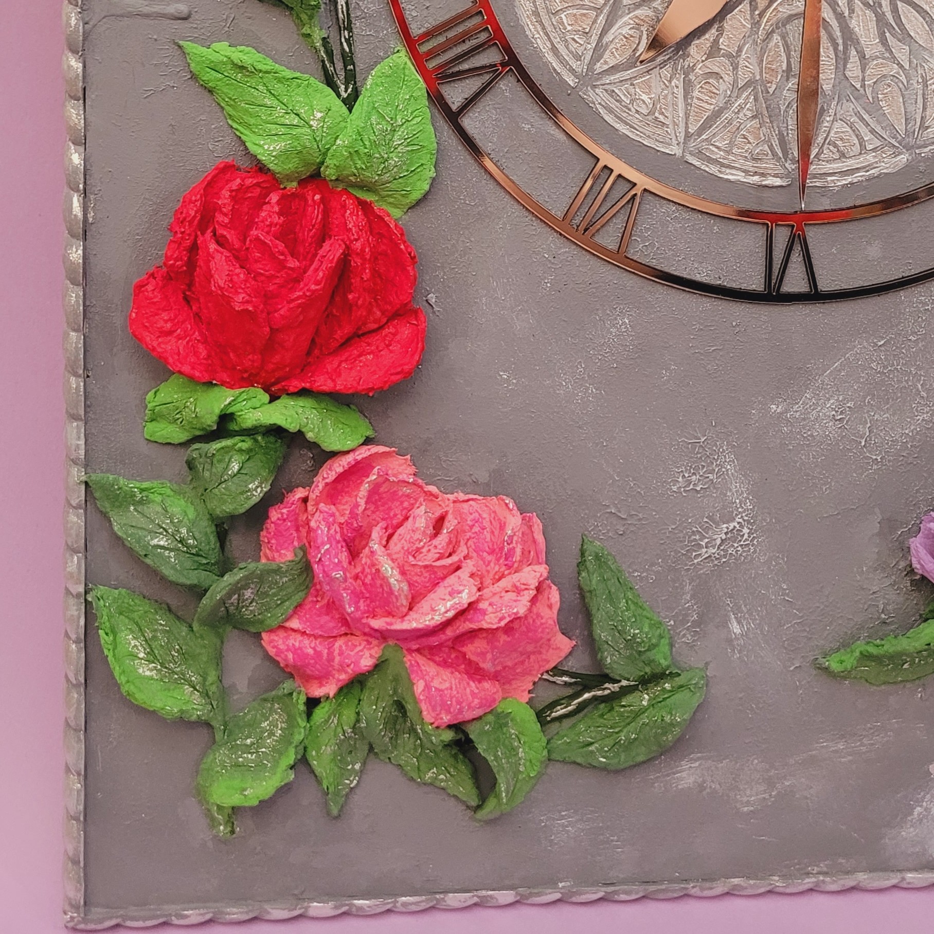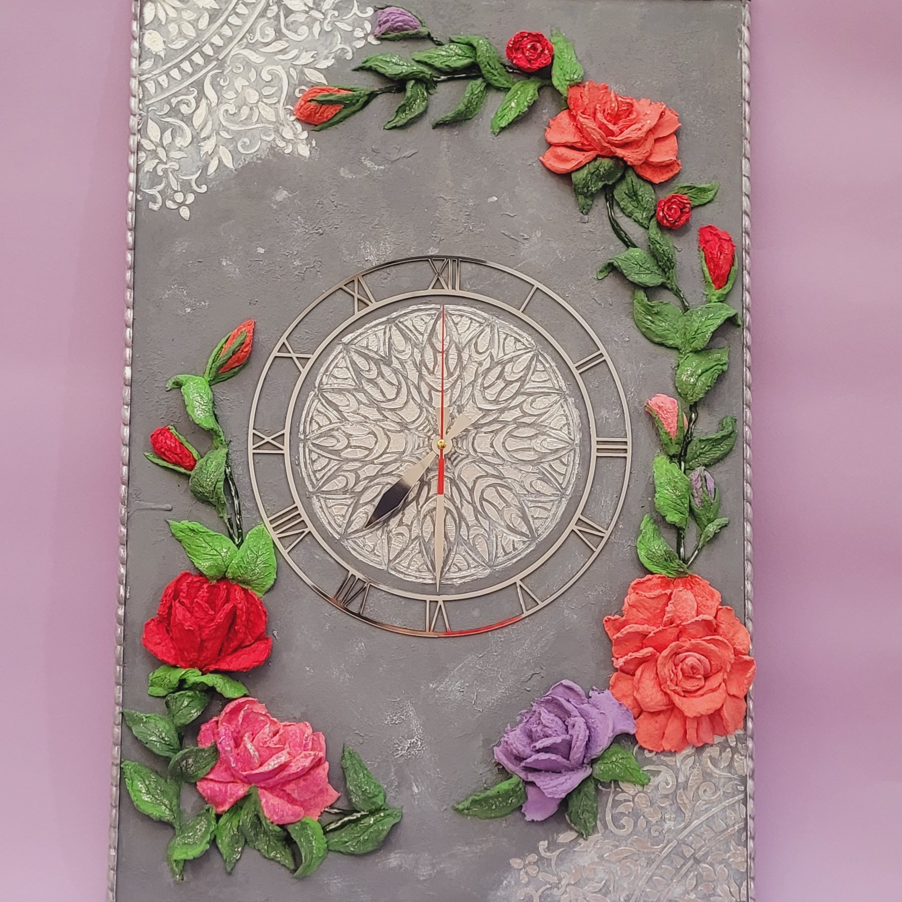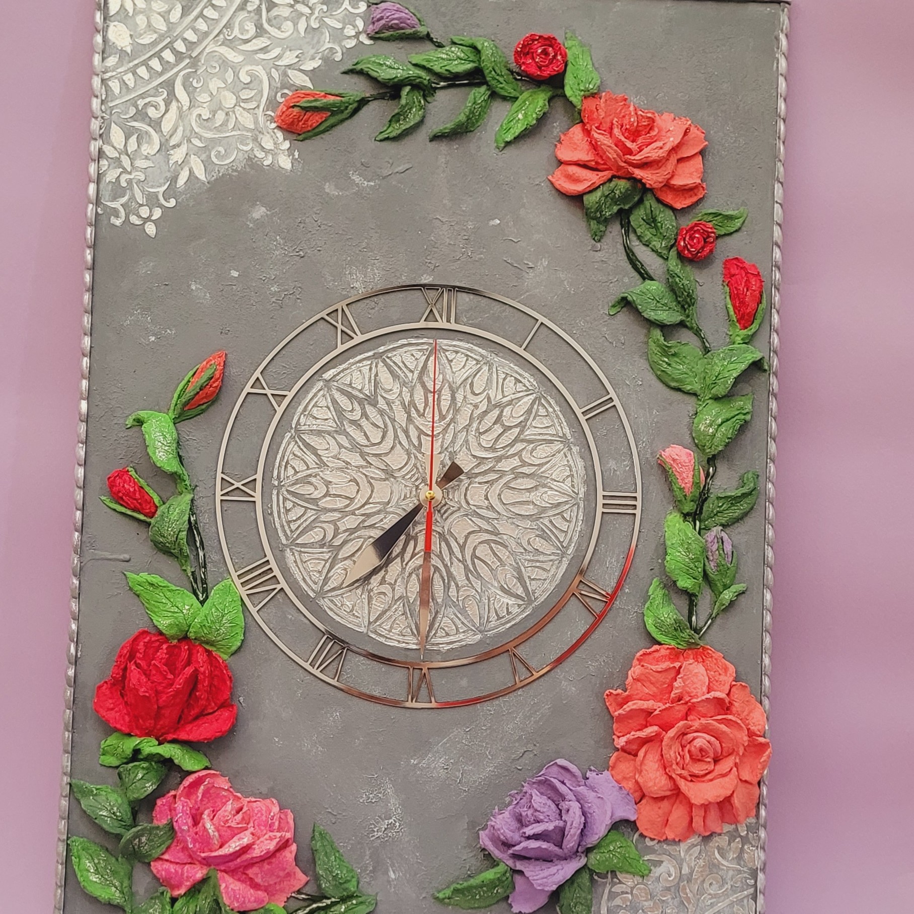 ساعت مستطیل در ابعاد 60در40 سانت به همراه موتور ارام گرد. گلها کاملا برجسته بوده و کلا کار دست هست . همه گلها به روش استاکو کار شدن