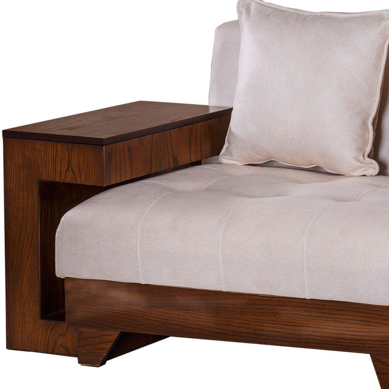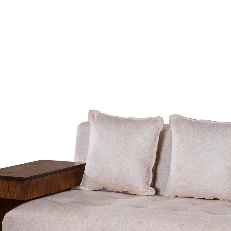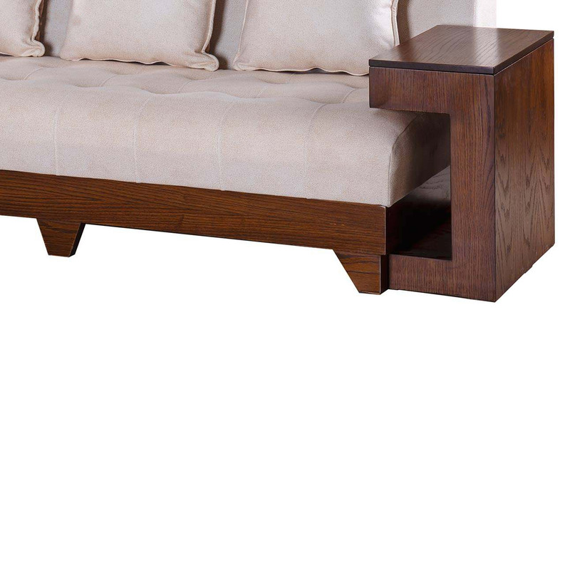 مبل راحتی 3 نفره مدل MA305 دارای طراحی زیبا و منحصر بفردی می باشد . پارچه به کار برده شده در این محصول از جنس چرم پارچه و دارای کیفیت بالایی است که قابلیت شستشونیز دارد . در سازه اصلی این کالا چوب کلاف روسی به کار رفته است.از دیگر ویژگی های این محصول دسته های چوبی مبل است که جدا می شوند و به عنوان میز عسلی مورد استفاده قرار میگیرد. این دسته با توجه به اینکه فضای کمی را اشغال می کند ولی دارای باکس برای نگهداری وسایل می باشد که از ویژگی های خیلی خوبه این محصول بشمارمیرود. کوسن های این مبل علاوه بر زیبایی به عنوان تکیه گاه نیز استفاده میشود. این کوسن ها دو رو هستند و یک روی آن دارای رنگ همانند خودمبل یعنی کرم و یک روی آن دارای رنگ متضاد یعنی قهوه ای می باشد . و این تضاد باعث زیبایی بیش از حد این محصول شده است . رنگ تیره چوب بکاررفته در این مبل باعث میشود که به راحتی با هر دکوراسیونی ست بشود . این مبل دو نفره مدل MA305 دارای ارتفاع استاندارد بوده که هنگام نشستن زانو ها دارای زاویه 90 درجه می باشند که باعث میشود به کمر فشاری وارد نشود.