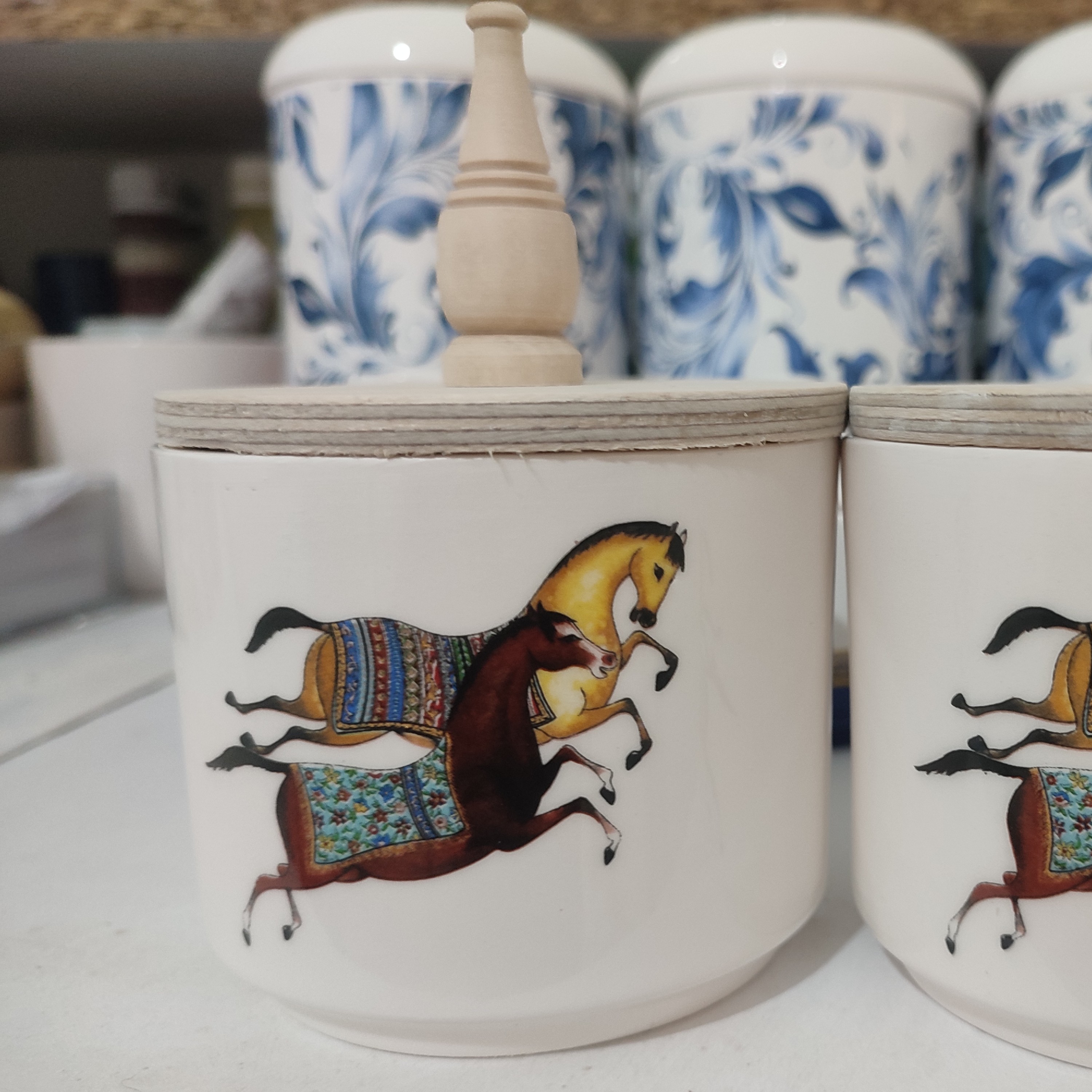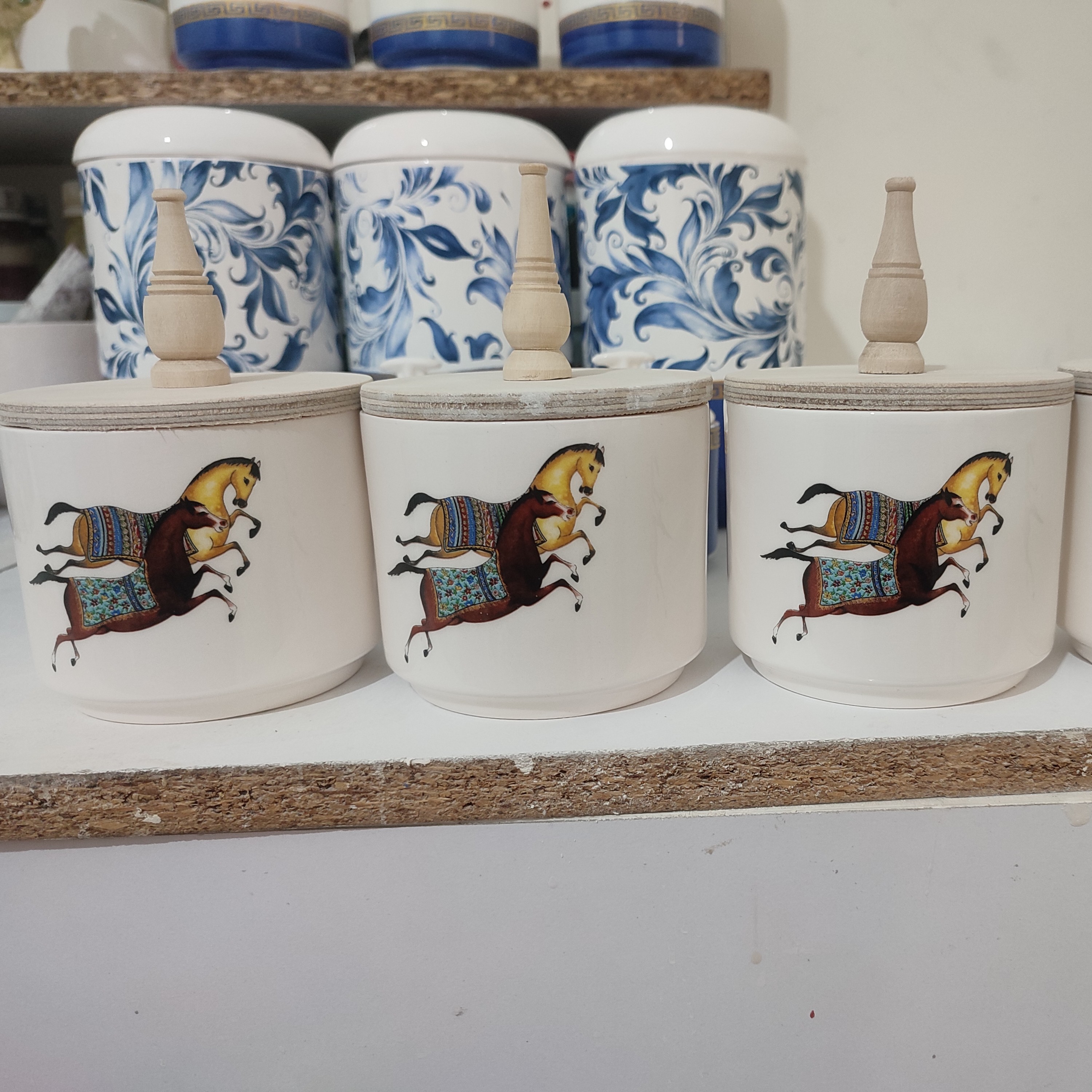 جا ادویه جنس سرامیک دستساز سه بار پخت در کوره طرح ثابت درب چوبی ارتفاع 8/5سانت طرح هرمس موجود و آماده ارسال ست