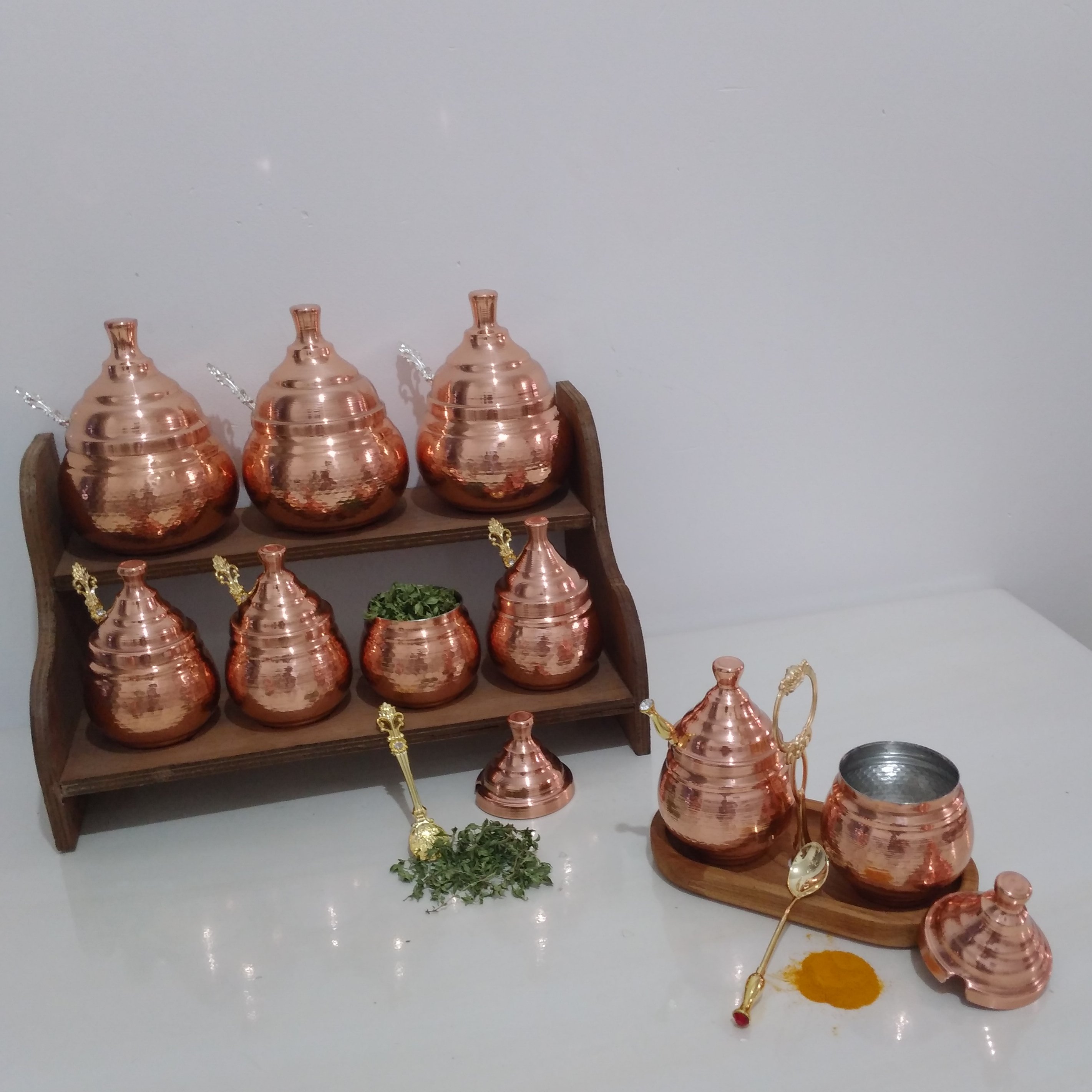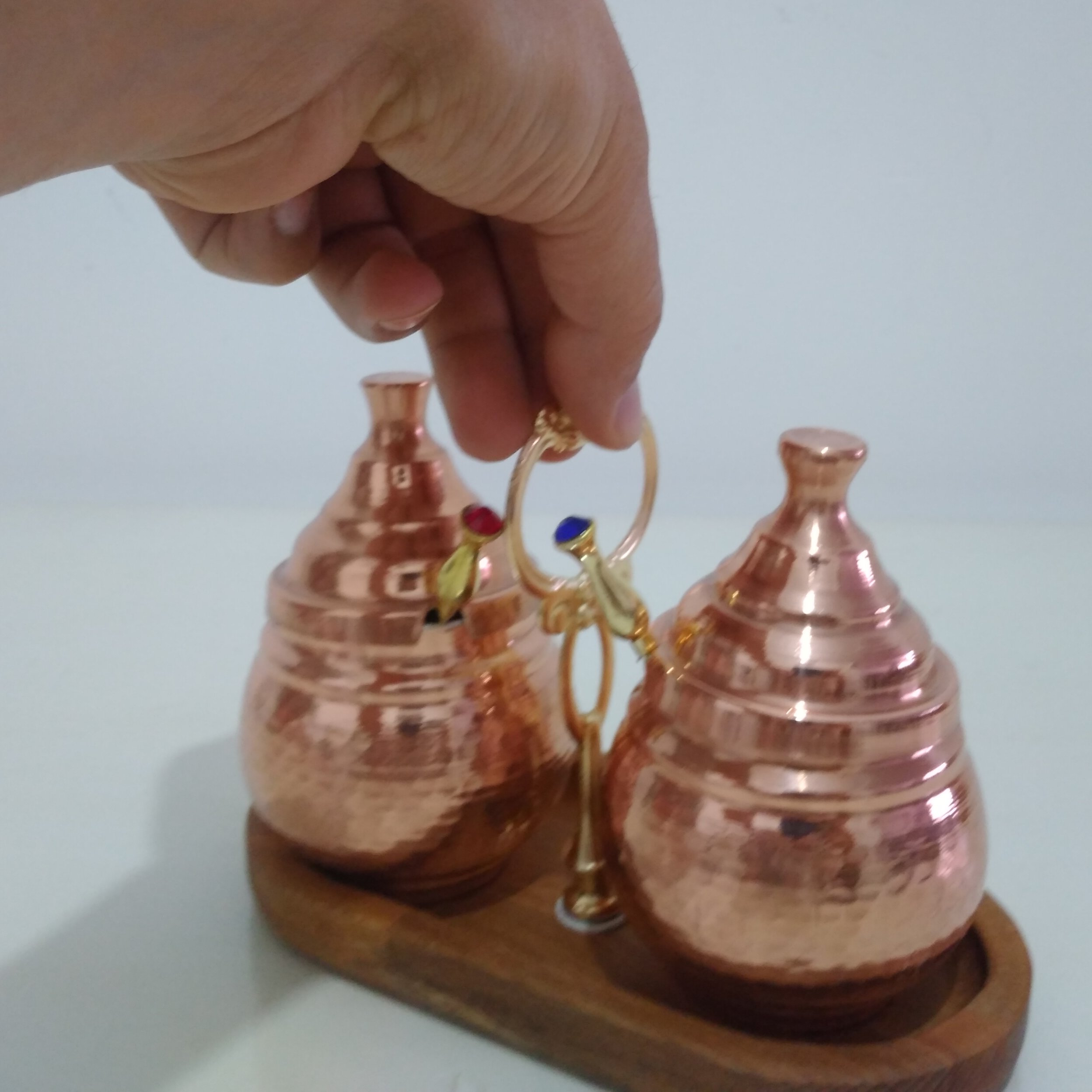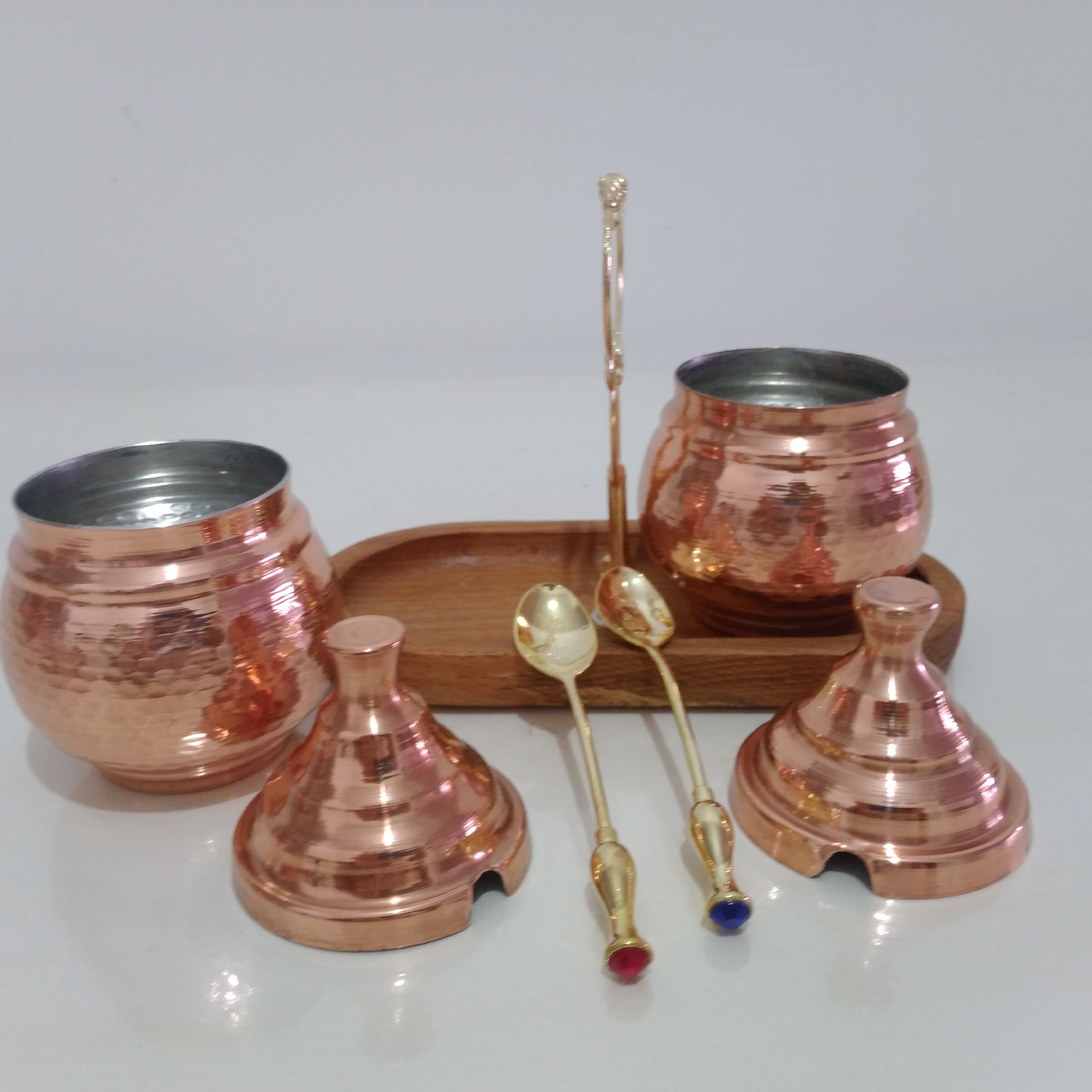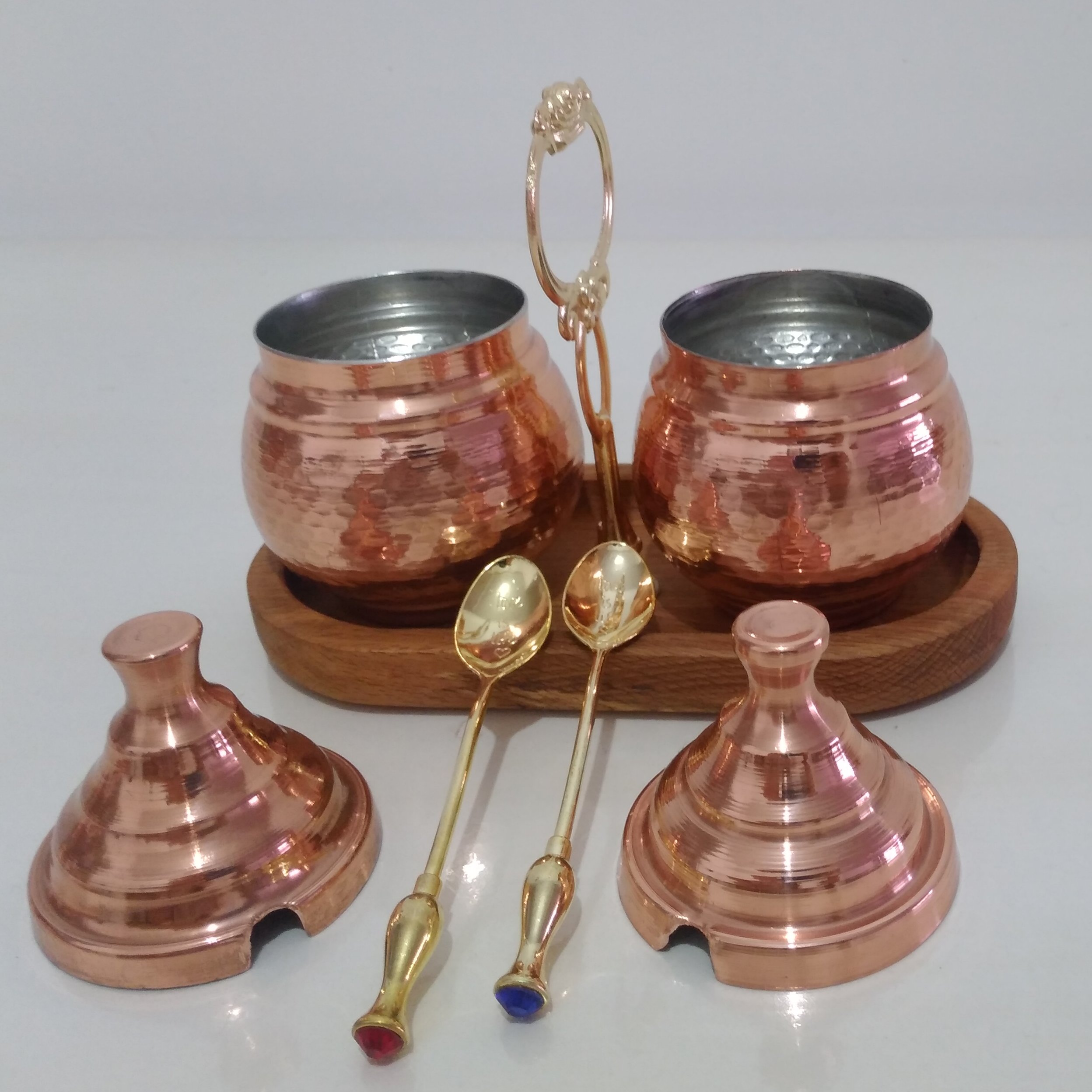 جا ادویه ای دوتایی مسی قاشق دار با استند چوبی نانو شده مبلمونسرا مدل 290217