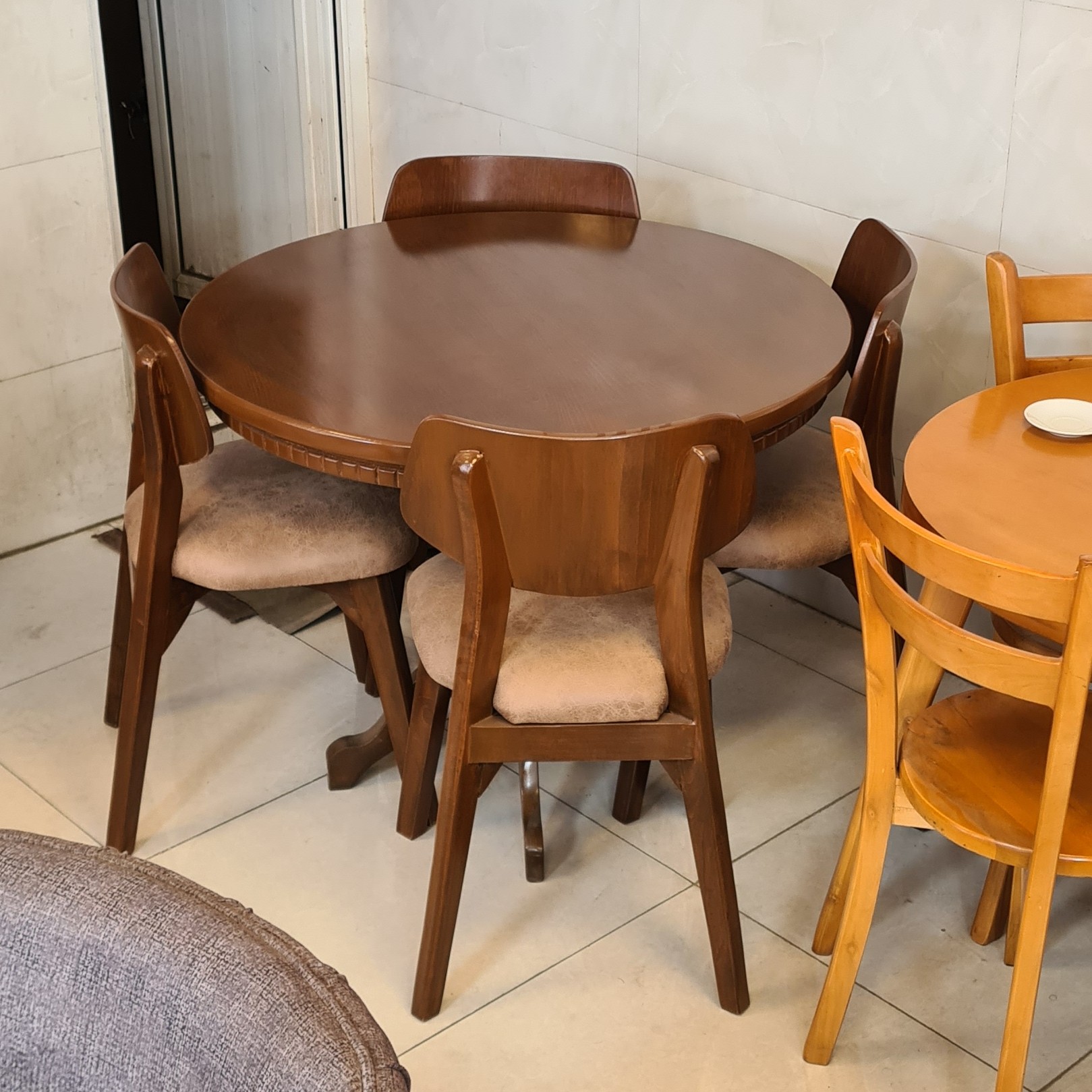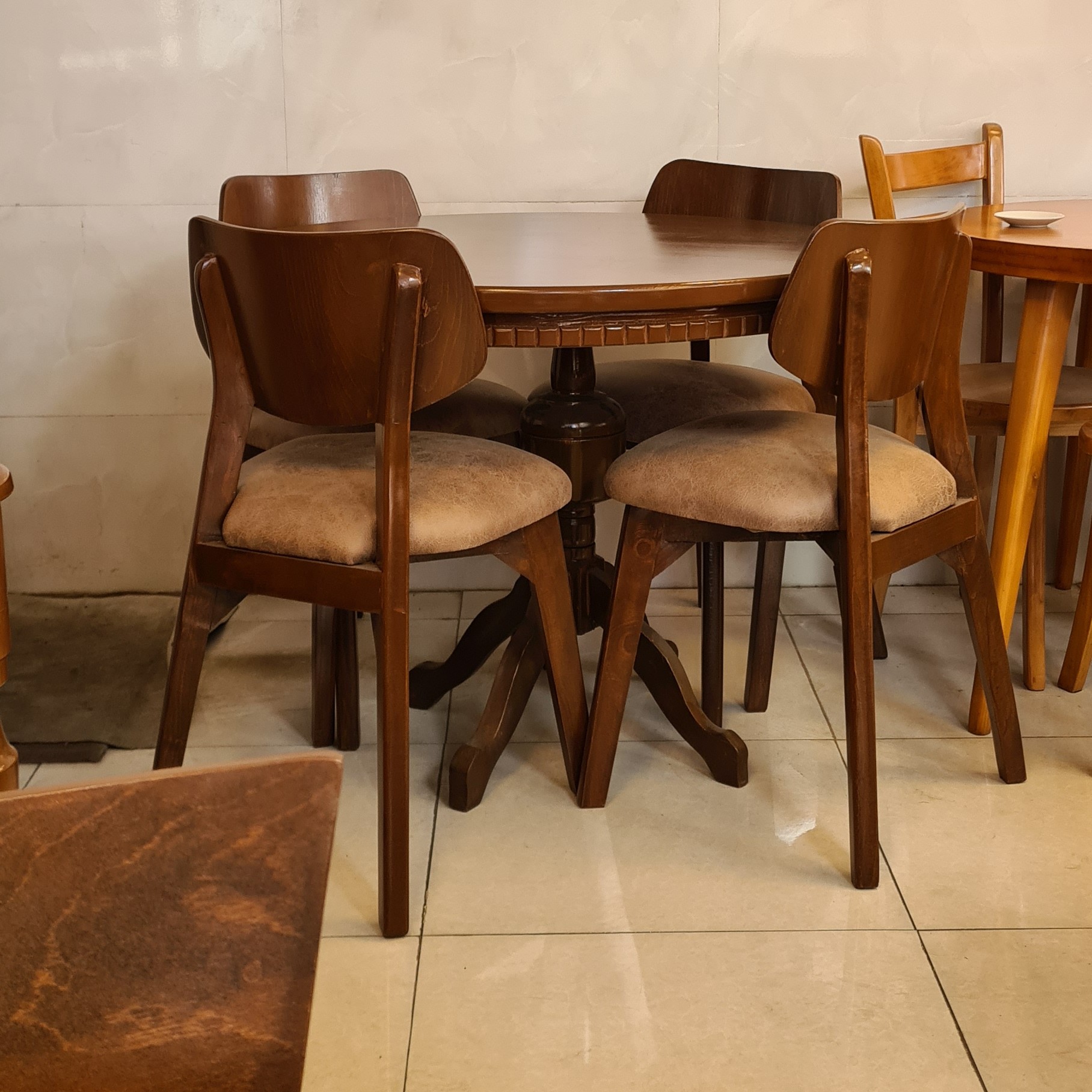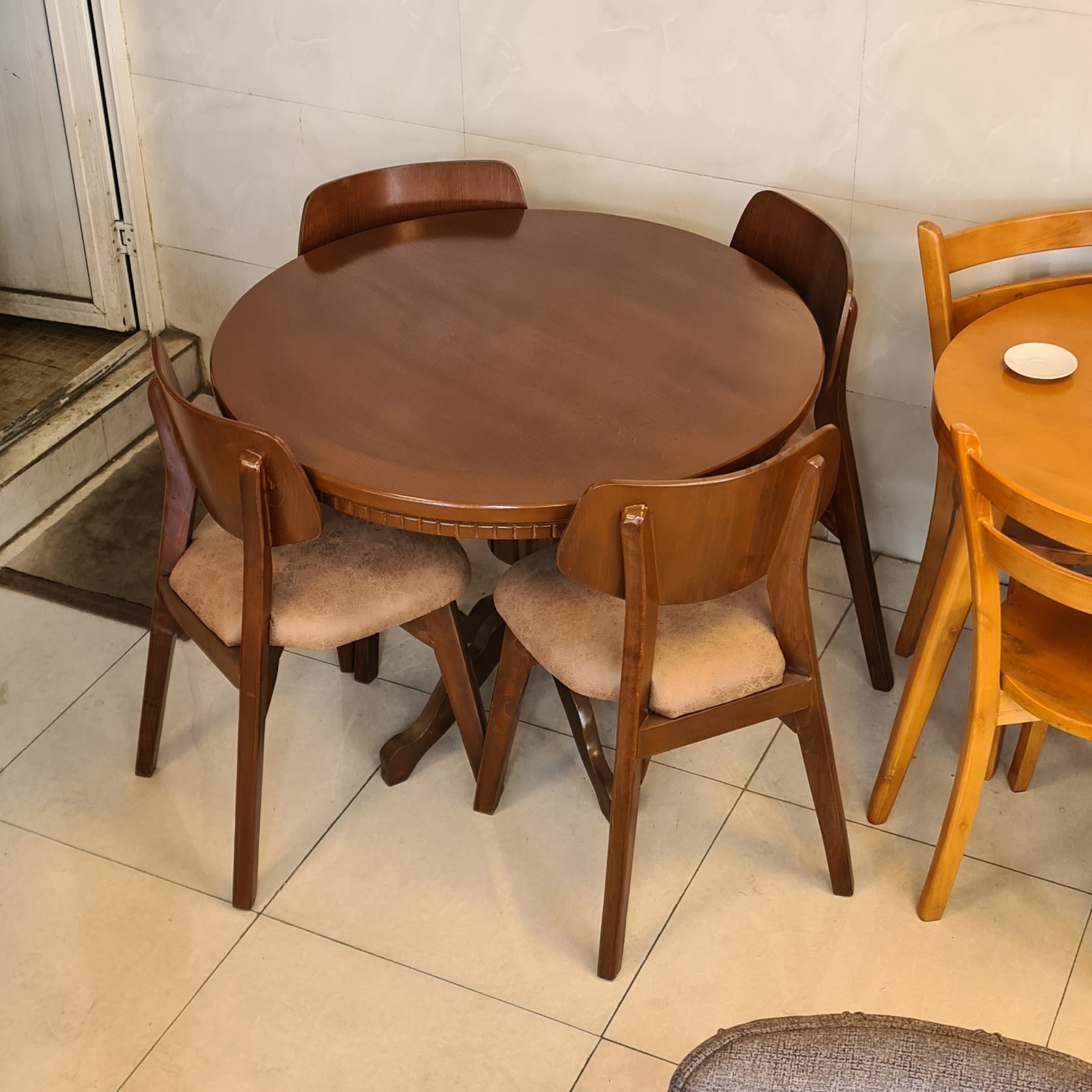 میز و صندلی ناهار خوری 4 نفره میزه گرده قلعه به همراه صندلی های اسپانیایی 🔴جنس صفحه میز :MDF روکش راش 🔴جنس پایه میز :چوبه روسی 🔴قطر میز : یک متر 🔴ارتفاع میز :80 سانتیمتر 🟢جنس چوبه صندلی: چوبه توسکا 🟢پارچه نشیمن : به انتخاب مشتری قابل تغییره رنگ چوب : فندقی تیره، فندقی روشن موجوده 🔴برای تغییره رنگه چوب 7 روز کاری زمان لازمه 🟢هزینه و باربری و اسنپ به عهده مشتری عزیز میباشد🌹❤️