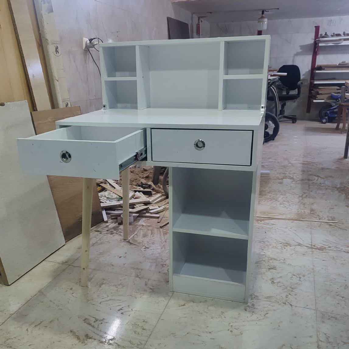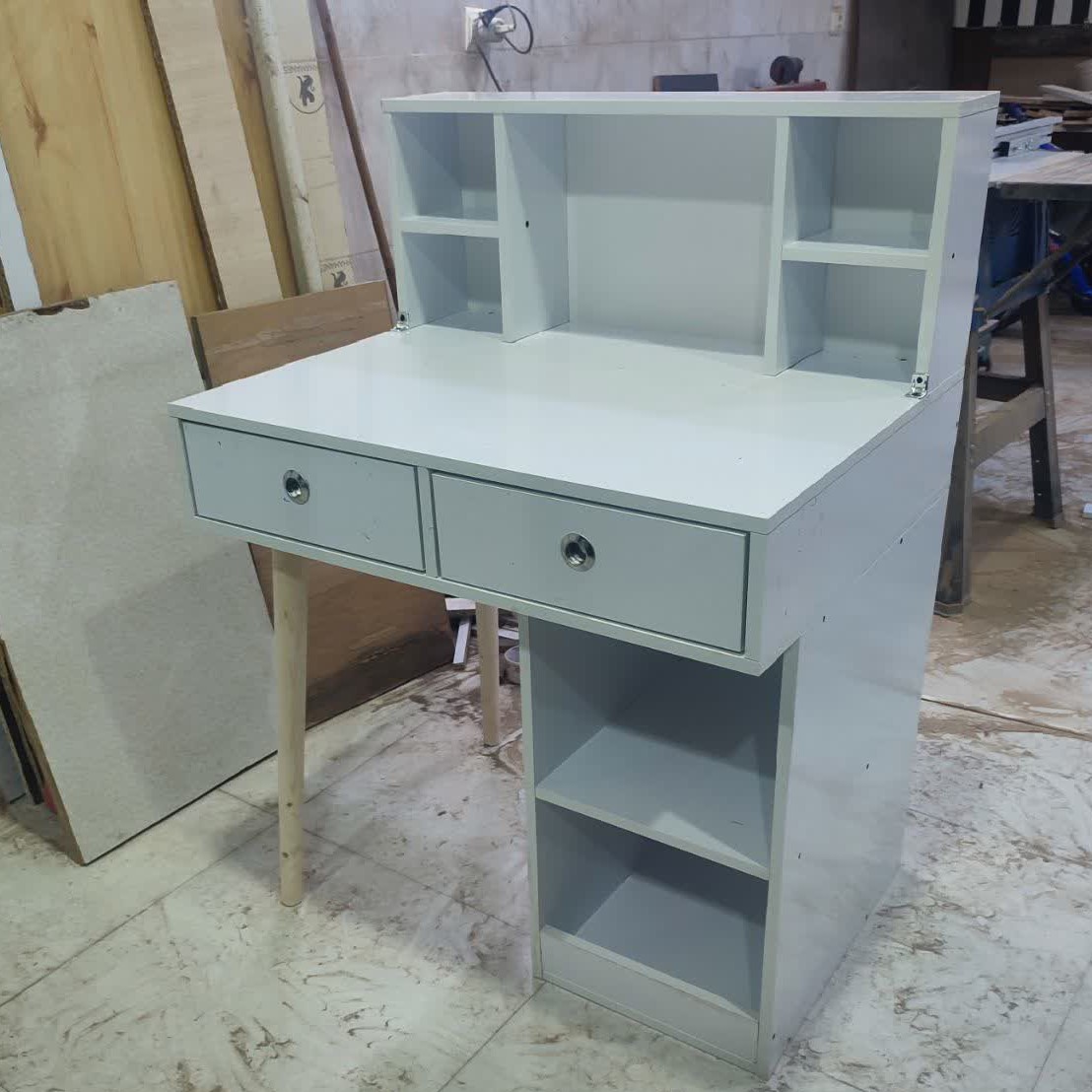 میز تحریر مدرن پایه مخروطی دارای دو کشو و چند قفسه در زیر میز و یک کتابخانه رومیزی در بالای میز، یک کتابخانه جذاب و جادار که اتاق یا محل کار شما را زیبا تر می کند جنس این کار از ملا مینه درجه یک، نوار پی وی سی برای محافظت بیشتر کار در برابر رطوبت و اتصالات تمام پیچ برای استحکام بیشتر کار می باشد کارهای سفارشی با ابعاد دلخواه هم پذیرفته می شود ارسال توسط باربری فقط به مراکز استان ها و شهر هایی که باربری مستقیم از مشهد دارند صورت می گیر و هزینه باربری بصورت و بر عهده مشتری محترم می باشد و هزینه پرداختی در باسلام صرفا جهت بسته بندی محصول می باشد صنایع چوب دارچین مشهد، عبادی18, بین حسین باشی 16و18 09054548970