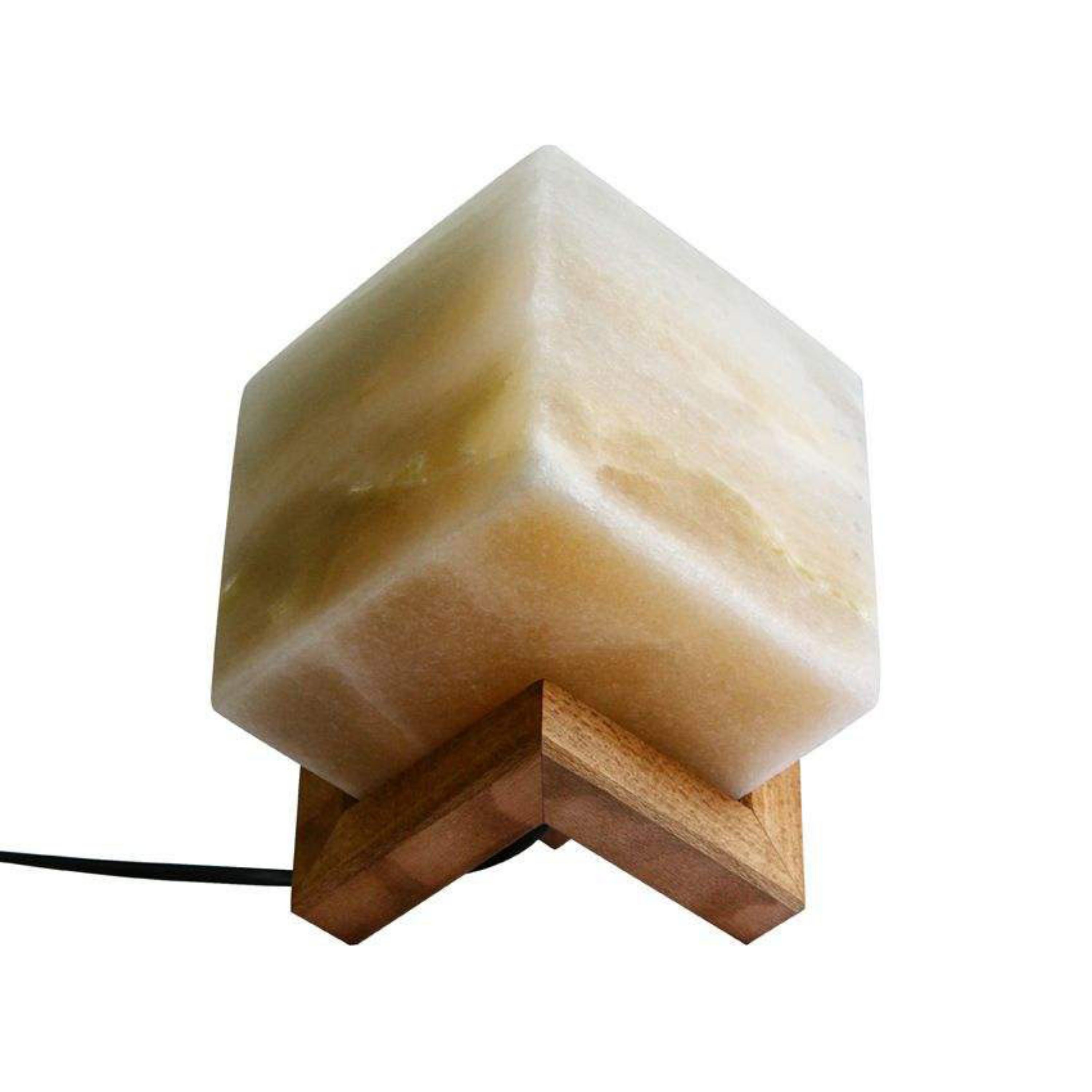 چراغ خواب سنگ نمک طرح مکعب با پایه چوبی مناسب برای اتاق خواب ، آشپزخانه و پذیرایی میباشد.چون سنگ نمک طبیعی است رگه های موجود در سنگ بصورت تصادفی میباشد که این امر خود زیبایی محصول را دو چندان میکند.