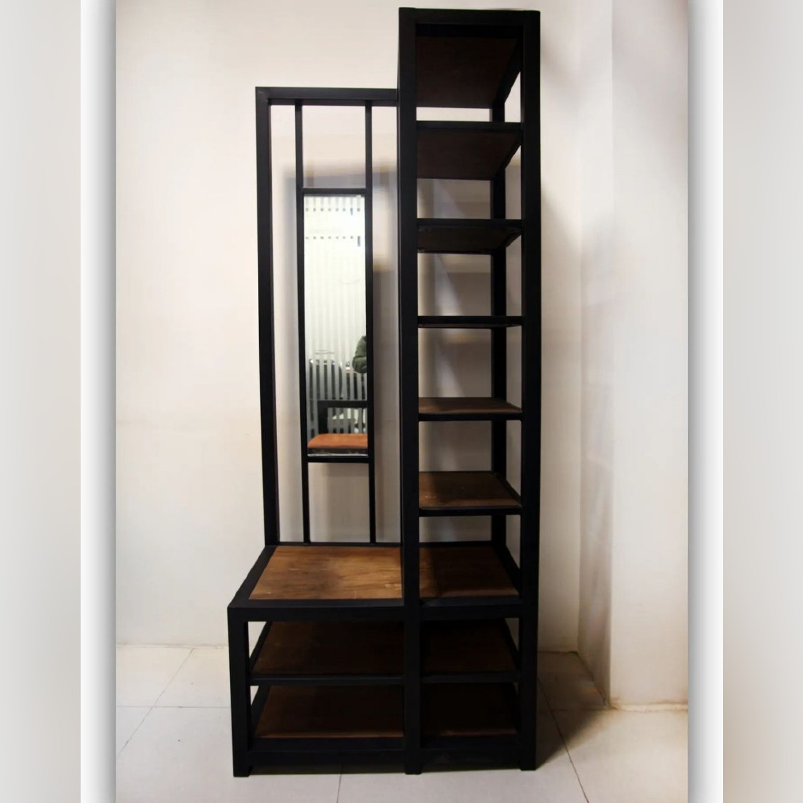 جاکفشی مدرن فلزی سازه فلزی و کفی ام دی اف روکش دار رنگ استاتیک و مقاوم در برابر خط و خش رنگ مشکی مات سبک و جابجایی آسان استحکام بالا و با دوام مدرن و کاربردی چند منظوره 1.جاکفشی 2.آیینه قدی 3.قابلیت اضافه کردن کمد 4.فضا برای قرار دادن گلدان 5.کمجا طراحی خاص و منحصر به فرد