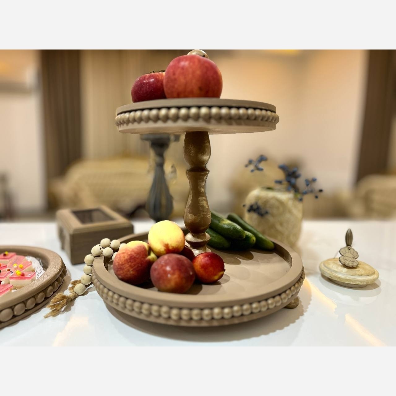 ظرف چوبی پذیرایی شیرینی و تنقلات و فینگر فود و میوه ...صفحه پایین سی و شش و سایز صفحه بالا بیست و پنج سانت ارتفاع سراسری پنجاه و سه سانت محصول در هر رنگ و پتینه ای قابل اجراست لطفا و حتمااا اسلاید ها را ورق بزنید و رنگ های متنوع کار را مشاهده بفرمایید ست کامل محصول هم در هر رنگی قابل اجراست در اسلاید ها مشاهده بفرمایید هزینه بصورت