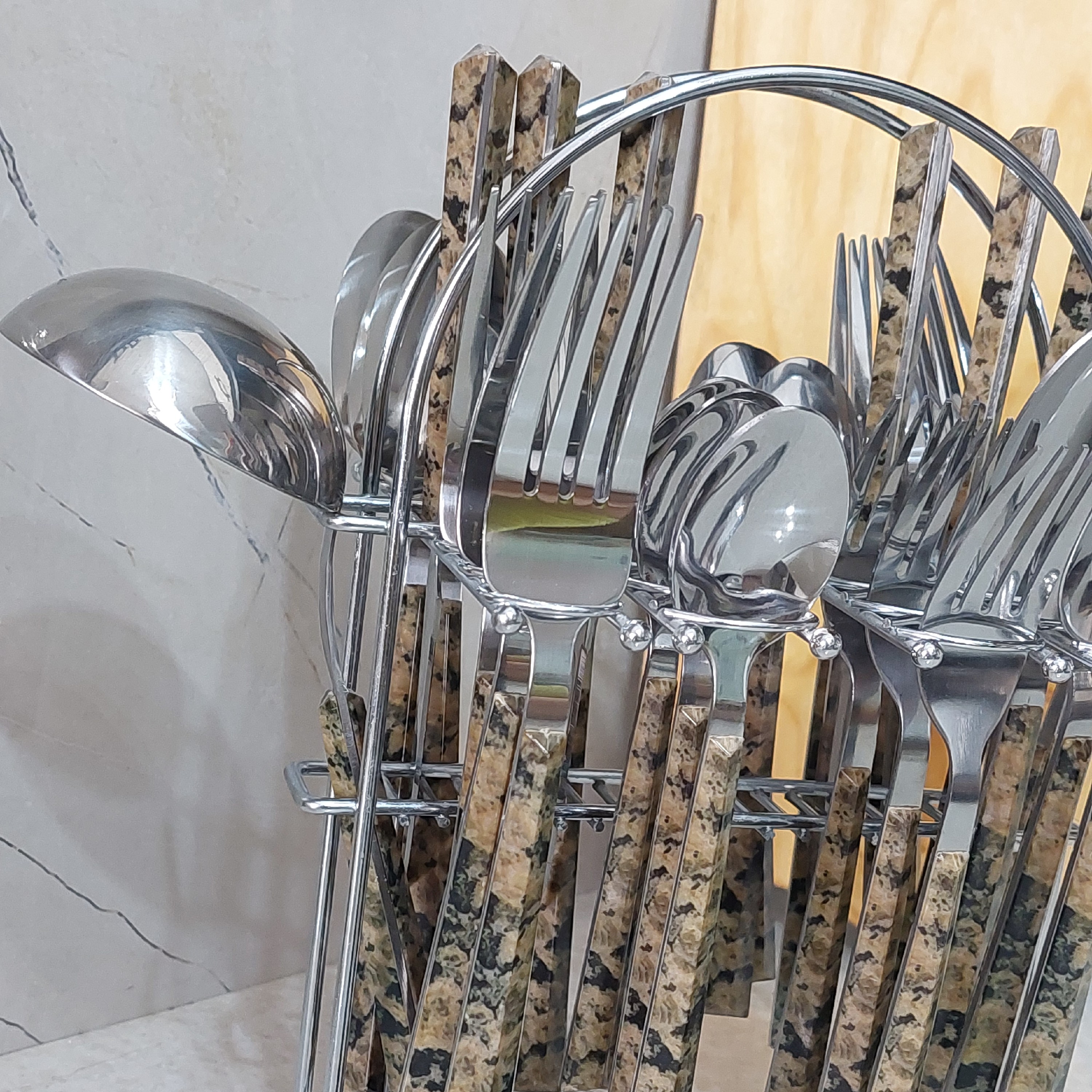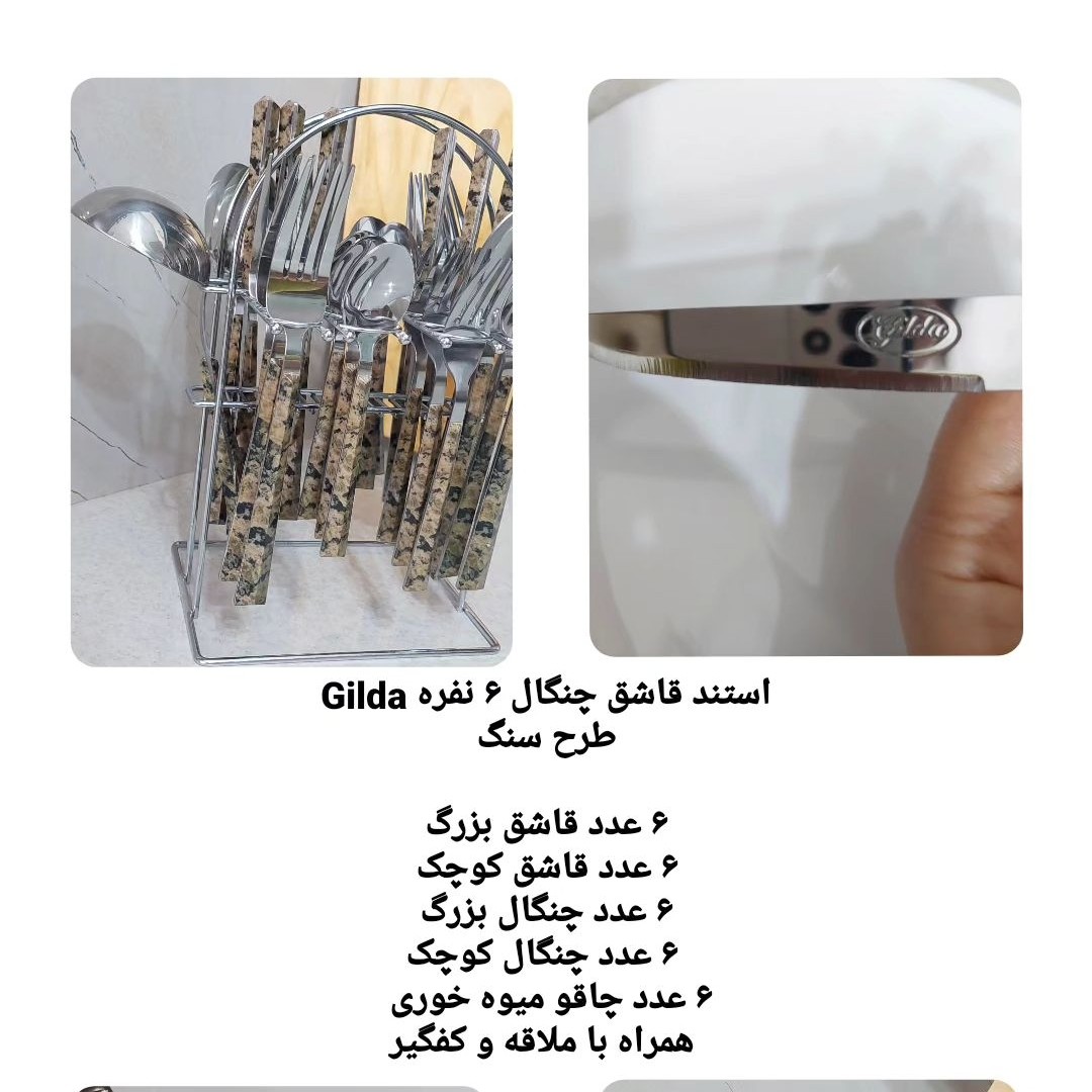 این سرویس شامل 6عدد قاشق غذاخوری 6عدد چنگال بزرگ 6عدد قاشق کوچک 6عدد چنگال کوچک 6عدد چاقو میوه خوری یک عدد کفگیر و یک عدد ملاقه می باشد. همه ی محصولات روی استند فلزی قرار میگیرند. جنس دسته ها پلاستیکی با روکش طرح سنگ می باشد. قابل شست و شو در ماشین ظرفشویی نمی باشد. جنس استیل درجه یک از برند گیلدا است.