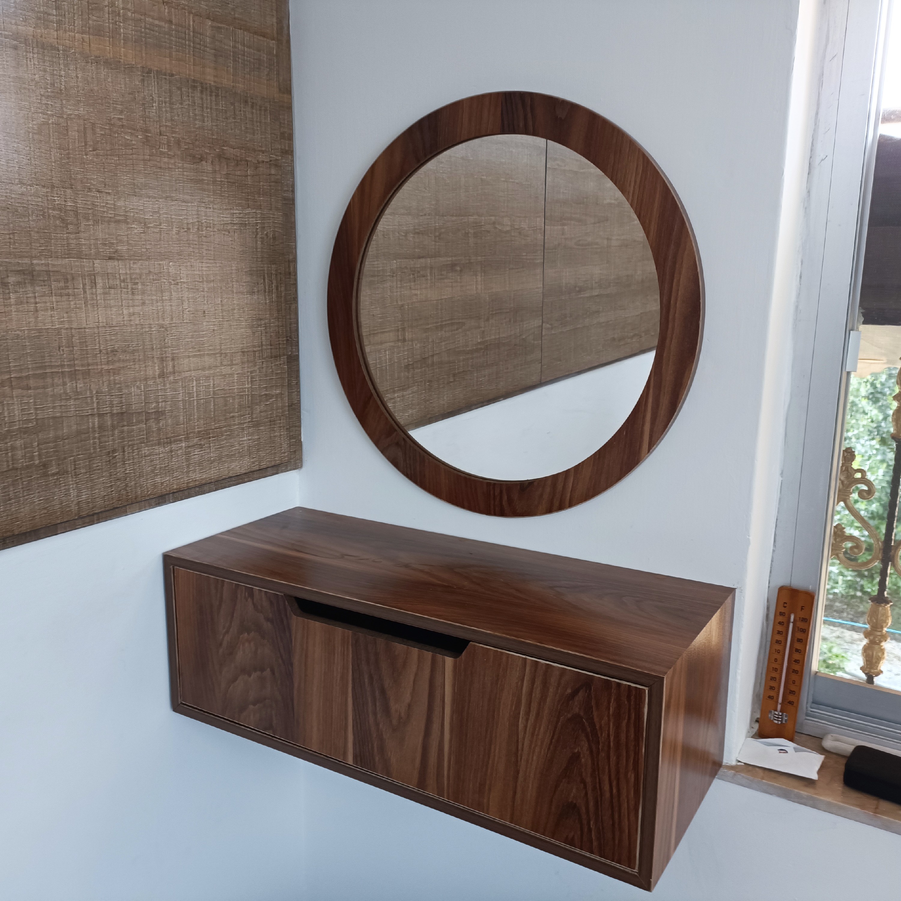 میز کنسول دیواری زیبا و کم جا به همراه آیینه . جنس تمام mdf درجه یک. در ابعاد عمق30 ارتفاع 30 و عرض 80 سانت.