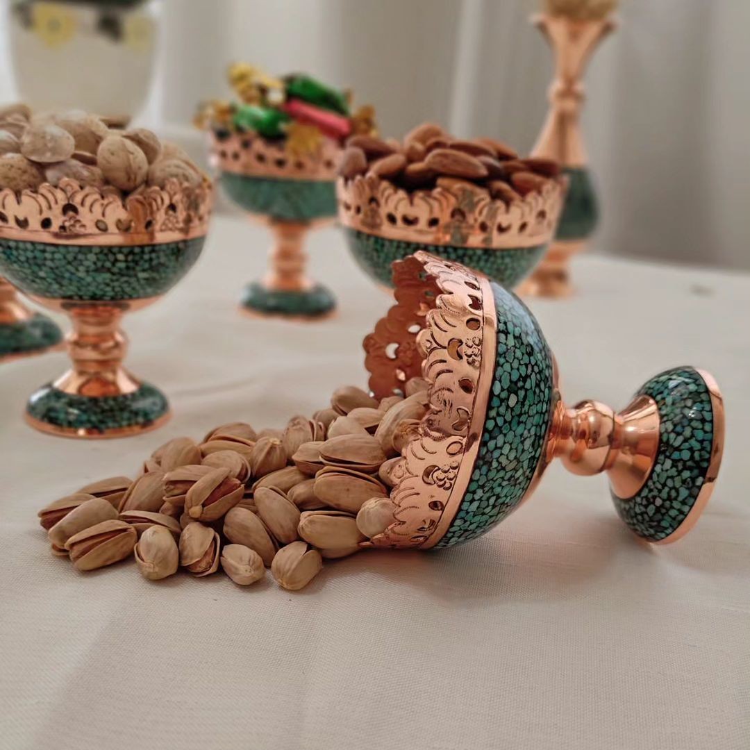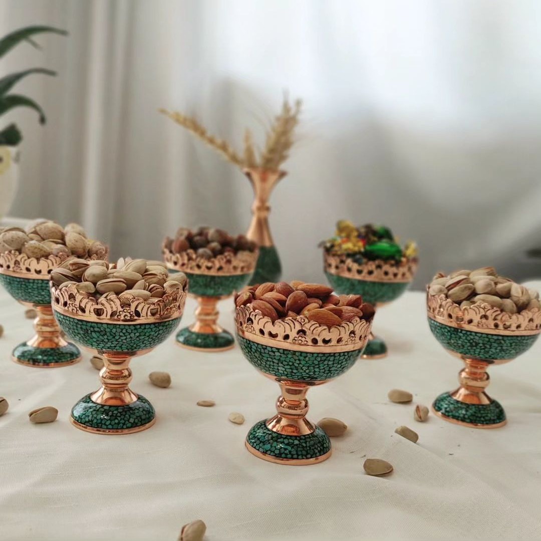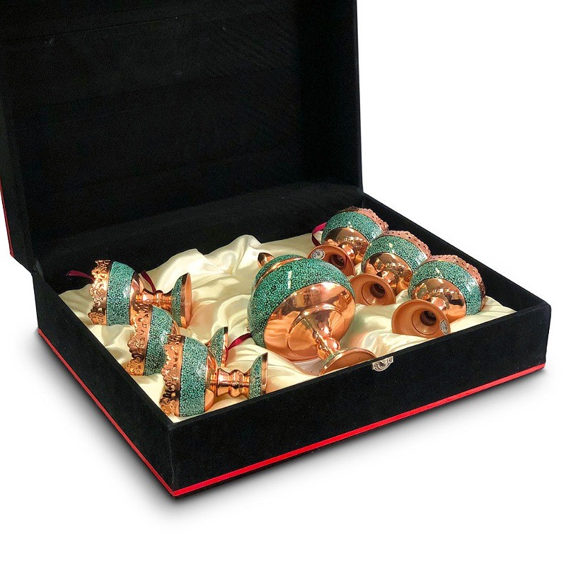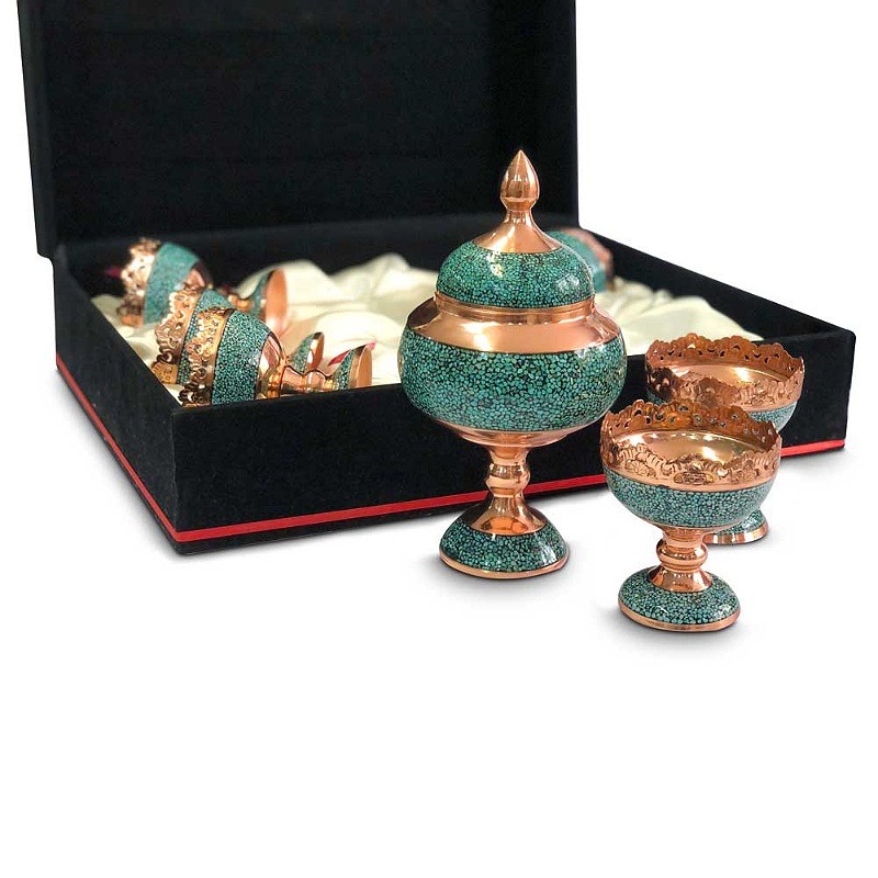ست آجیل خوری و شکلات خوری فیروزه کوبی شامل 6 عدد آجیل خوری فیروه کوب با ارتفاع 13 سانتی و یک عدد شکلات خوری پایه دار 25 سانتی می باشد که داخل یک جعبه مخمل فوق العاده شیک چیدمان شده است . این ست به عنوان هدایای مدیریتی نفیس گزینه بسیار مناسبی است، زیرا علاوه بر زیبایی و ارزشمند بودن آن بسیار کاربردی است و می تواند بر روی میزکار و یا در جلسات کاری به عنوان یک هنر ایرانی نظر هر بیننده ای را جلب نماید.