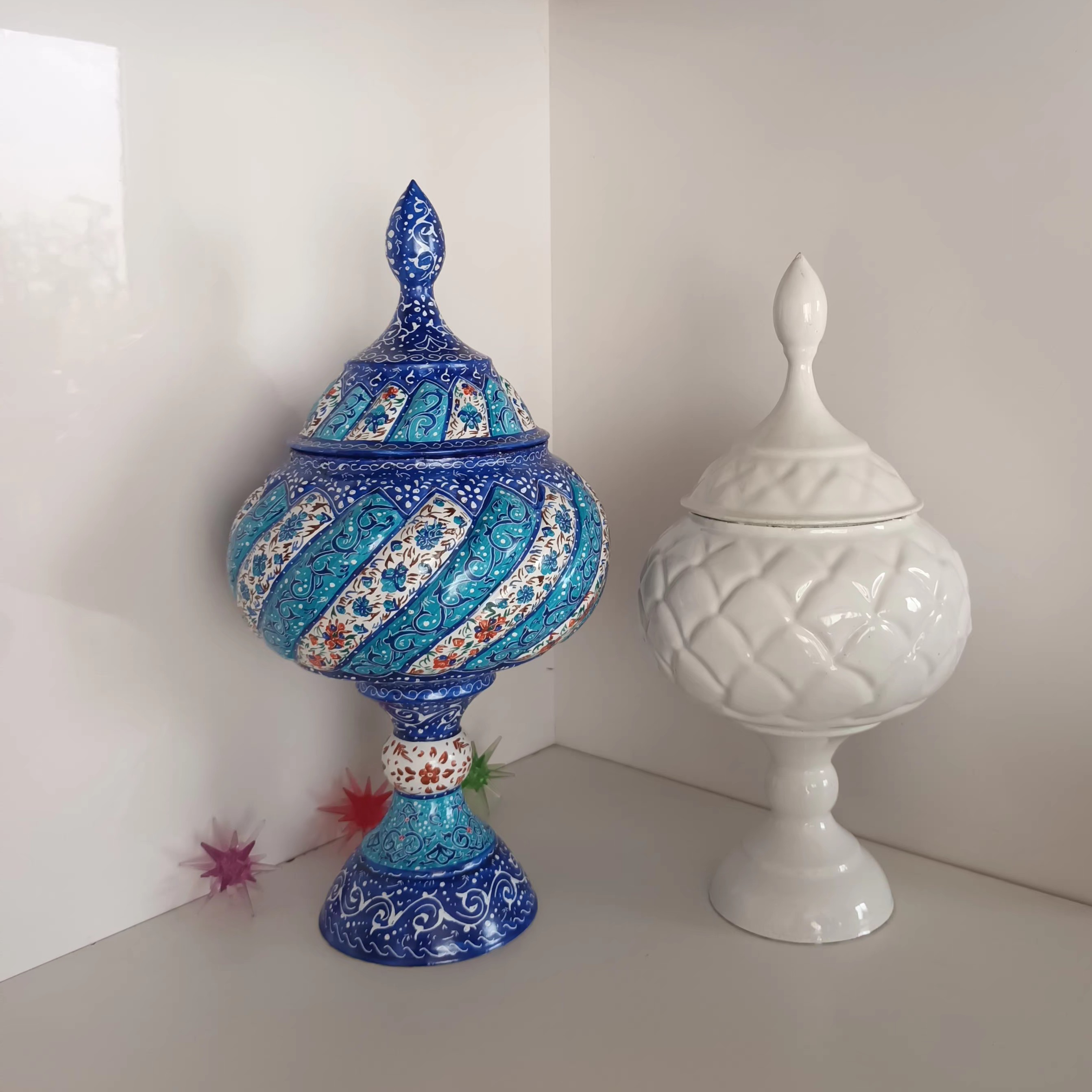 عکس آخر مقایسهی دو تا سایز 22 (ارتفاع27 سانت) و سایز 25(ارتفاع 30 سانت) هست.اگر برای پذیرایی مد نظرتون هست،سایز 25 مناسبتر هست.