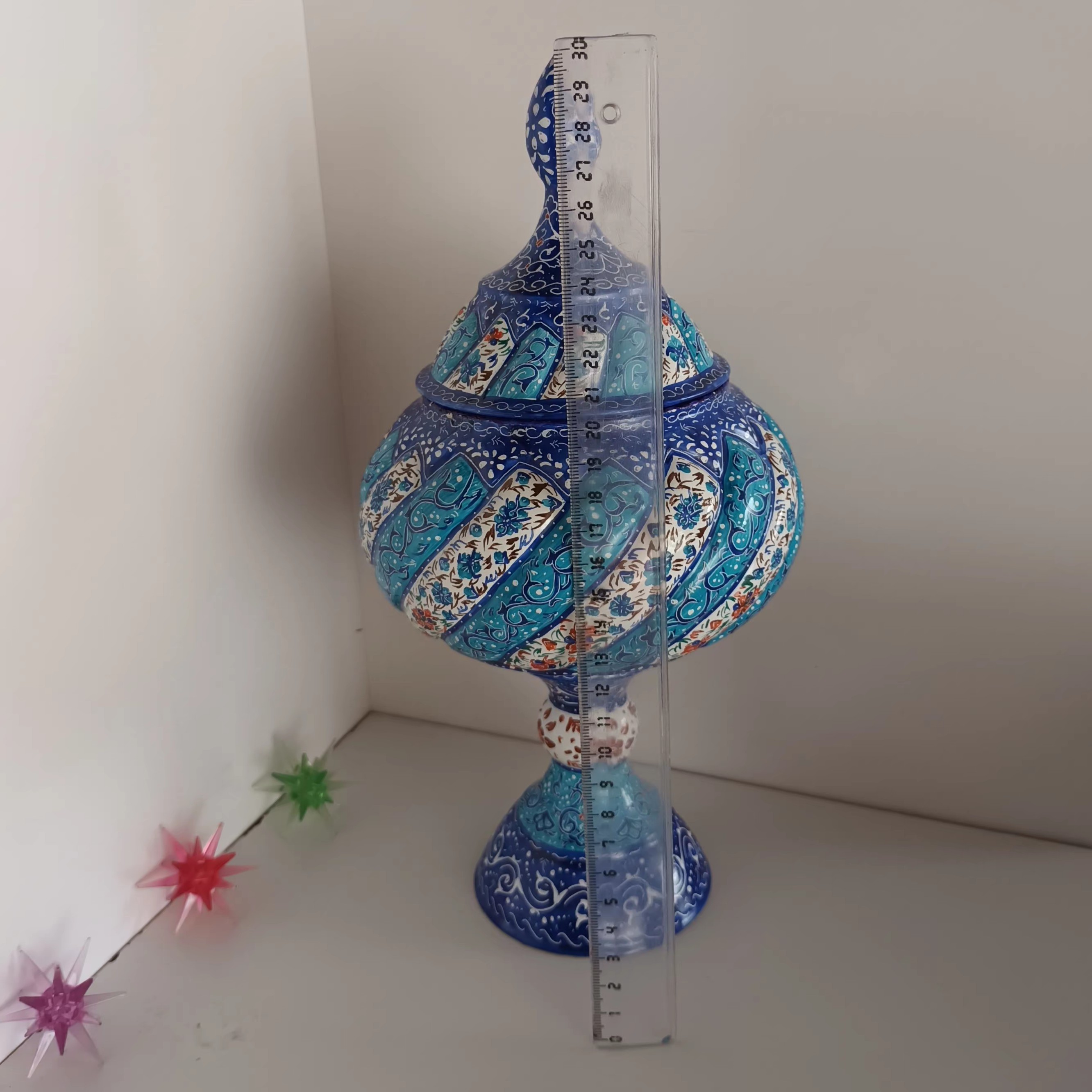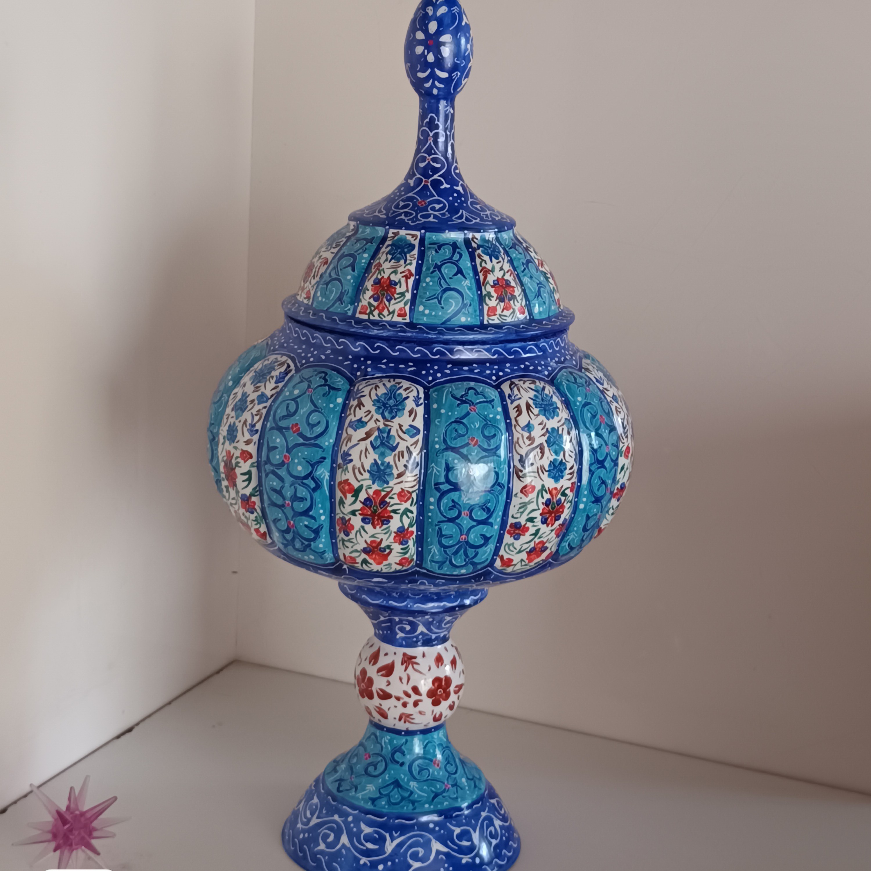 زیر ساخت کار از مس میباشد.ارتفاع محصول حدود 30 سانت هست.کار مدلهای متنوعی داره که میتونید با غرفه دار هماهنگ کنید و یا کار رو ست سفارش بدید.