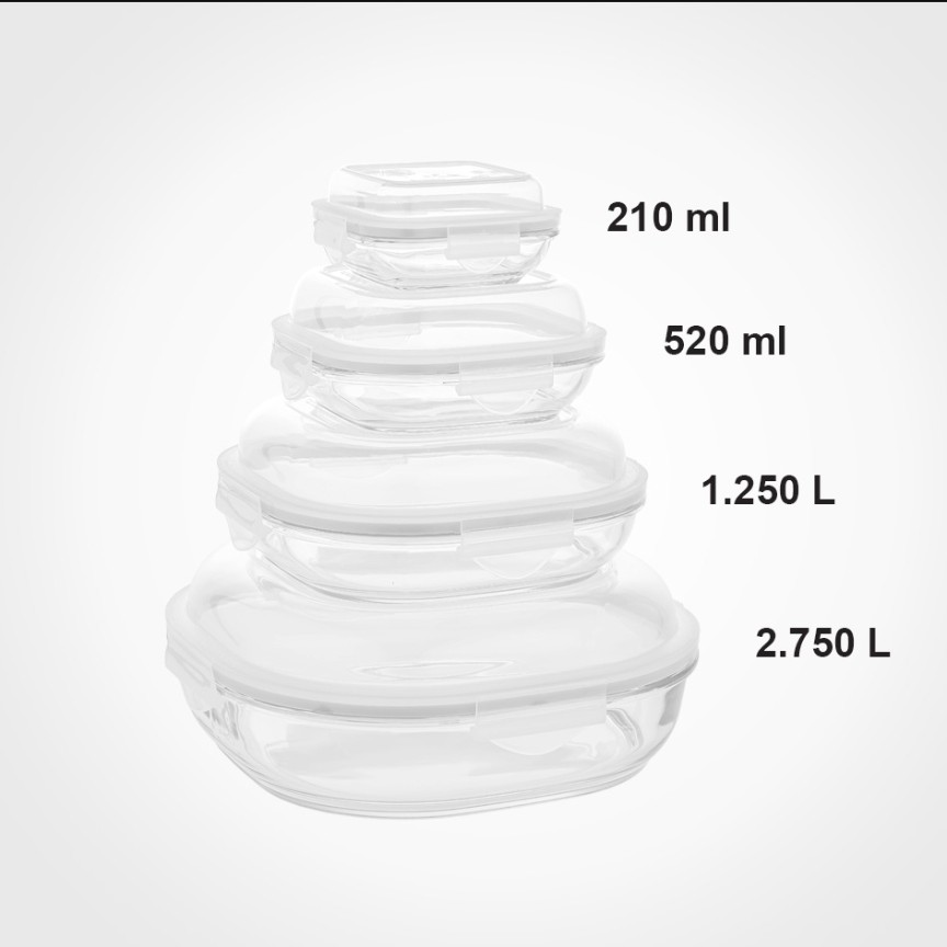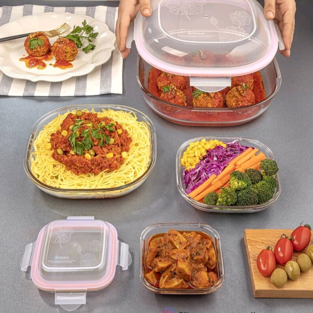 ست ظرف شیشه ای سرو و نگهداری 8 پارچه لیمون، جنس بدنه محصول شیشه ای و جنس درب آن پلاستیکی است. این ست دارای 4 ظرف دربدار در 4 سایز مختلف، دارای گنجایش 210 و 520 میلی لیتر، 1250 و 2750 لیتر می باشند. این محصول قابل استفاده در فر، یخچال و همچنین گرم کردن غذا در مایکروویو است. وجود نوار سیلیکونی و قفل کلیپسی در چهار طرف درب ظروف از بیرون ریختن مواد غذایی جلوگیری می کند