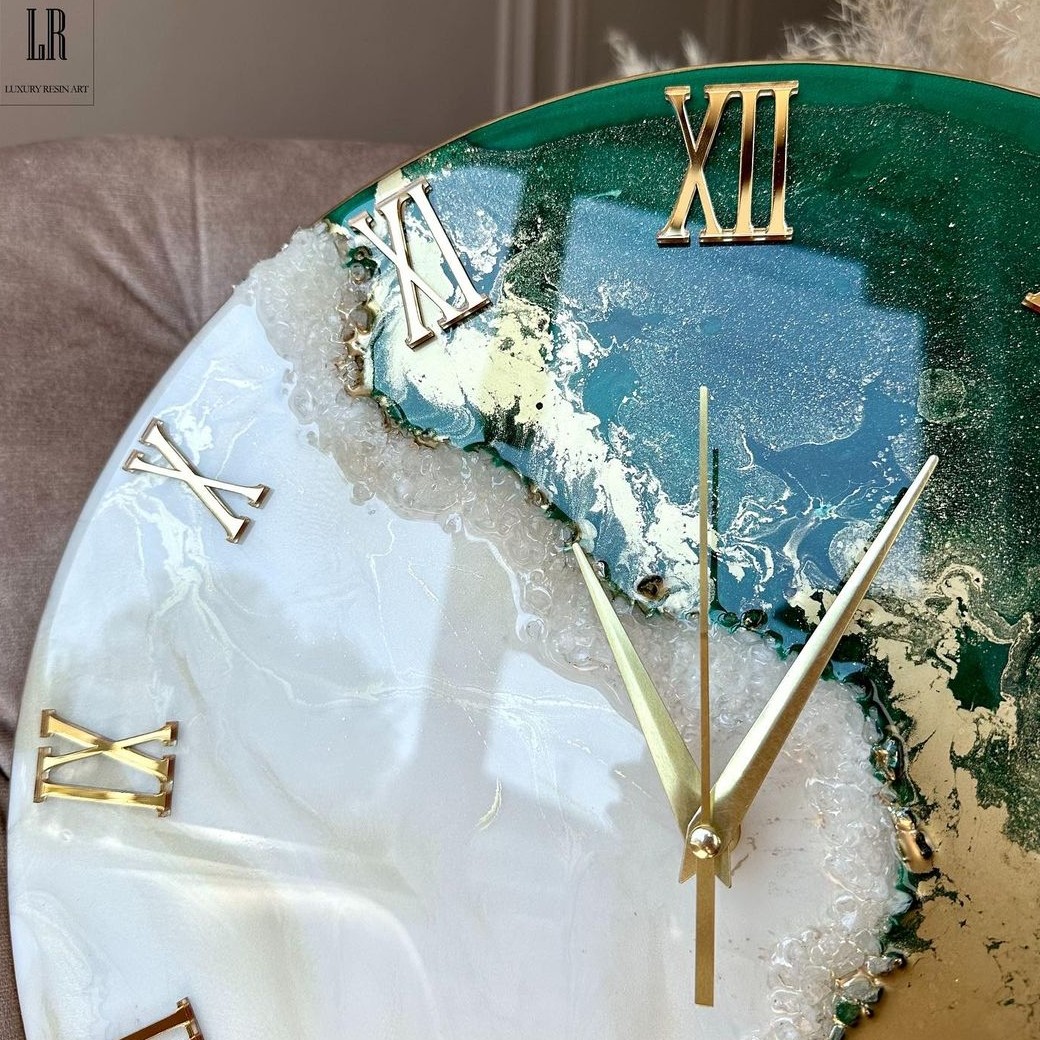 ساعت رزینی سایز 50 سانت سبز سفیذ طلایی مخصوص دکوراسیون های سبز از سایز 30 سانت تا 50 سانت قابل اجراست قابل اجرا در رنک بندی مختلف کارها تماما دست سازن و طبق رنگ دلخواه شما اجرا میشه