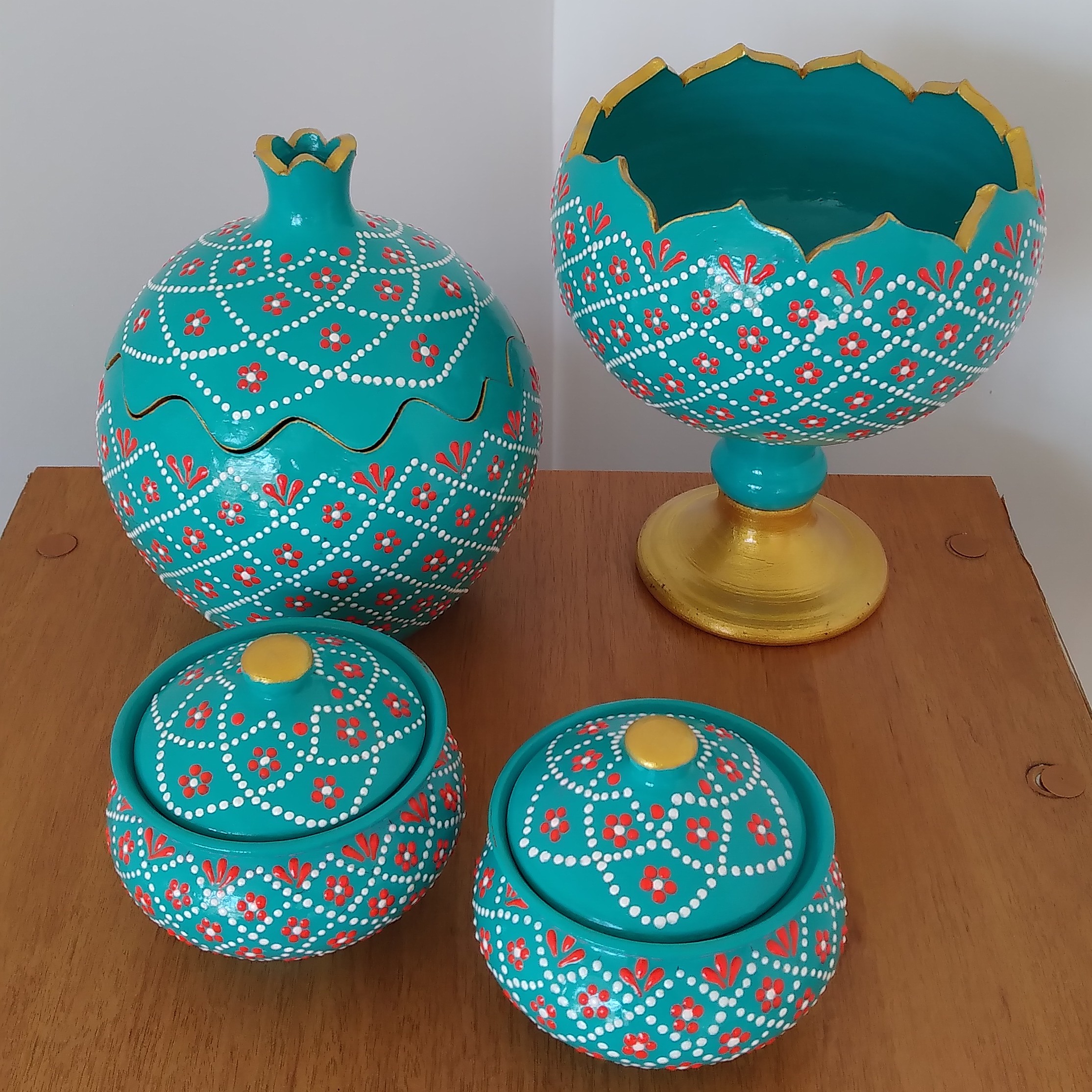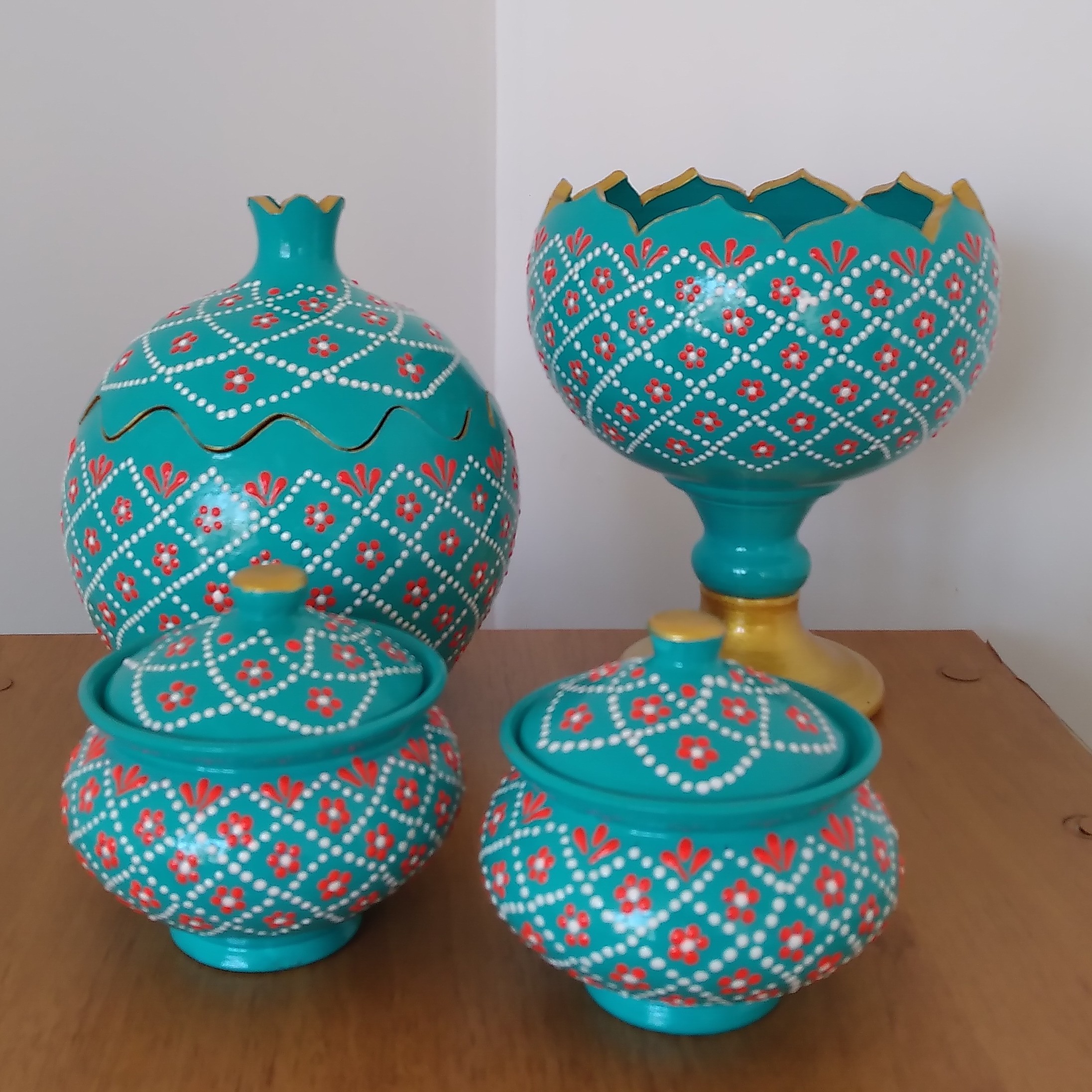 ست گزخوری ، شکلات خوری و قندان های سفالی نقطه کوبی شده، رنگ فیروزه ای ، قابل شستشو مبلمونسرا مدل 272094