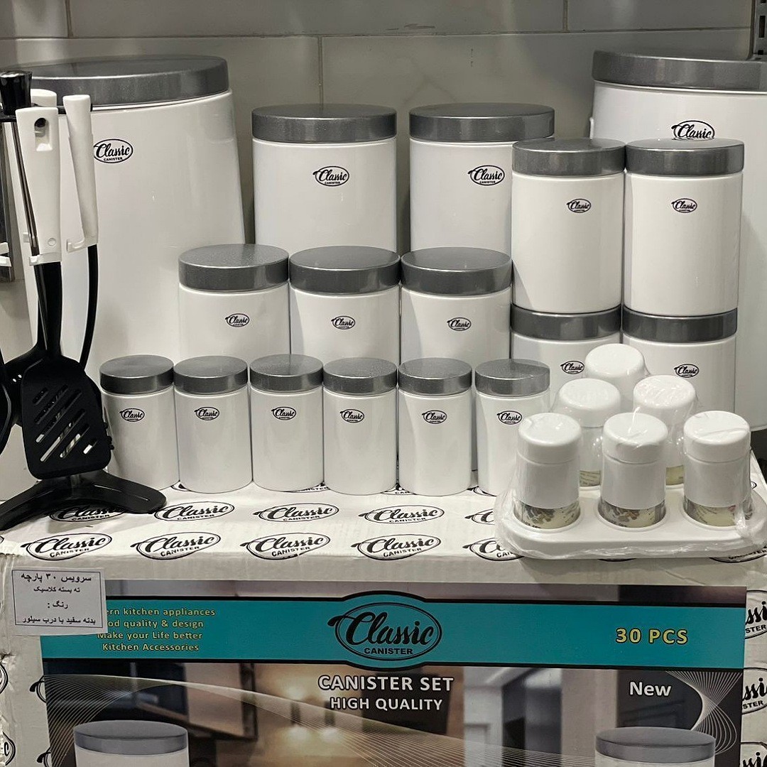 ✨️سرویس 30 پارچه کلاسیک سفید درب طوسی وطوسی درب مشکی