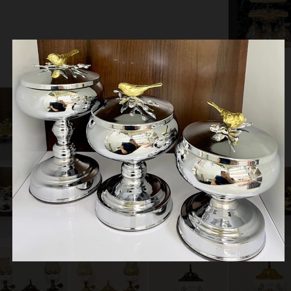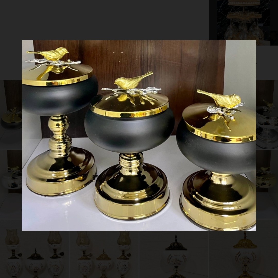 نام محصول:ظروف پذیرایی سه تایی😍 جنس:بدنه فلزی باگل وگنجشک های برنزی💎 کیفیت:بسیار عالی،ابکاری فورتیک،دارای ضمانت رنگ👌 رنگ:مشکی ،طلایی و نقره ای 🔴یه کار بسیار شیک و خاص مناسب مهمونی های شما برای استفاده روی میز جلو مبلی و عسلی برای آجیل و شکلات و ...🥰✅