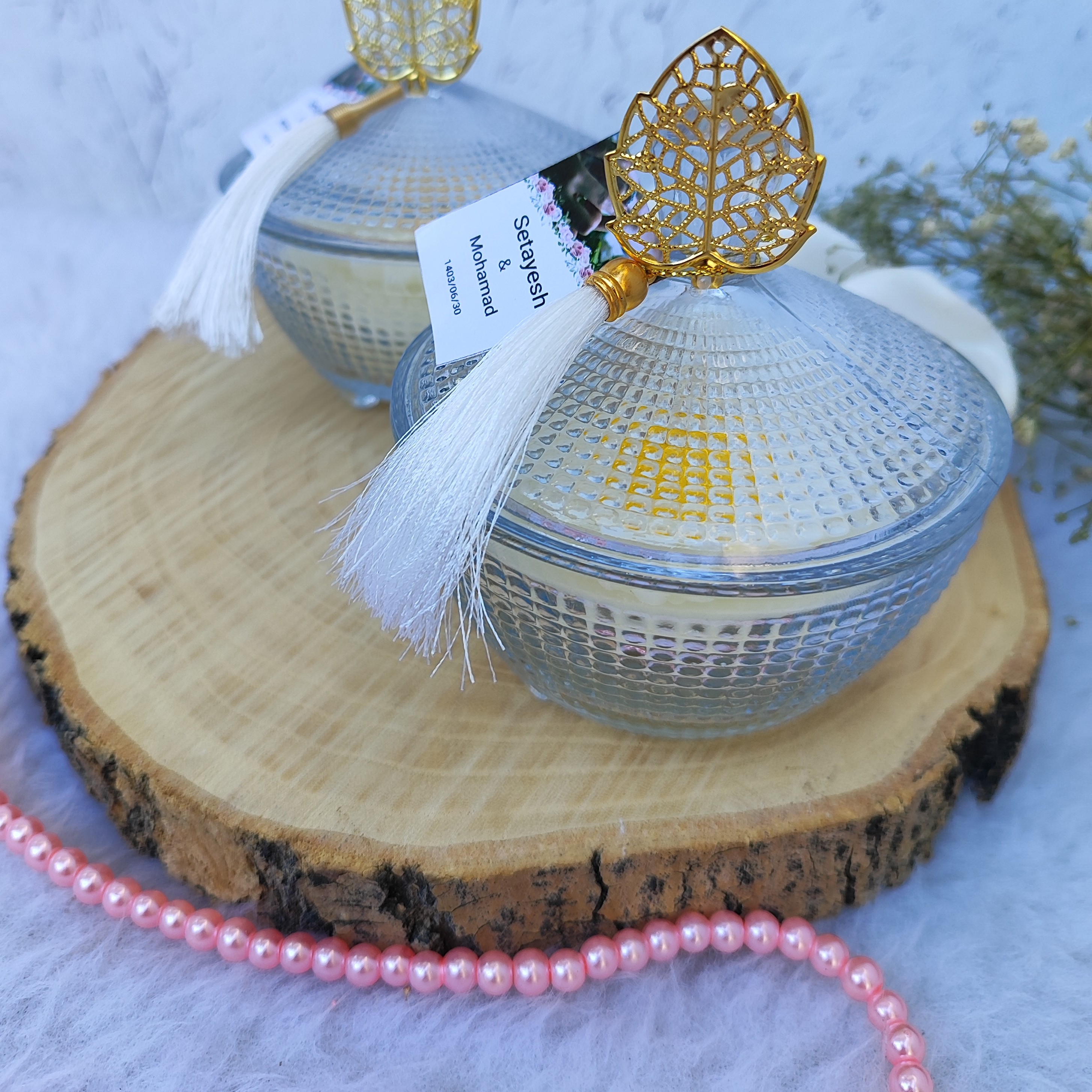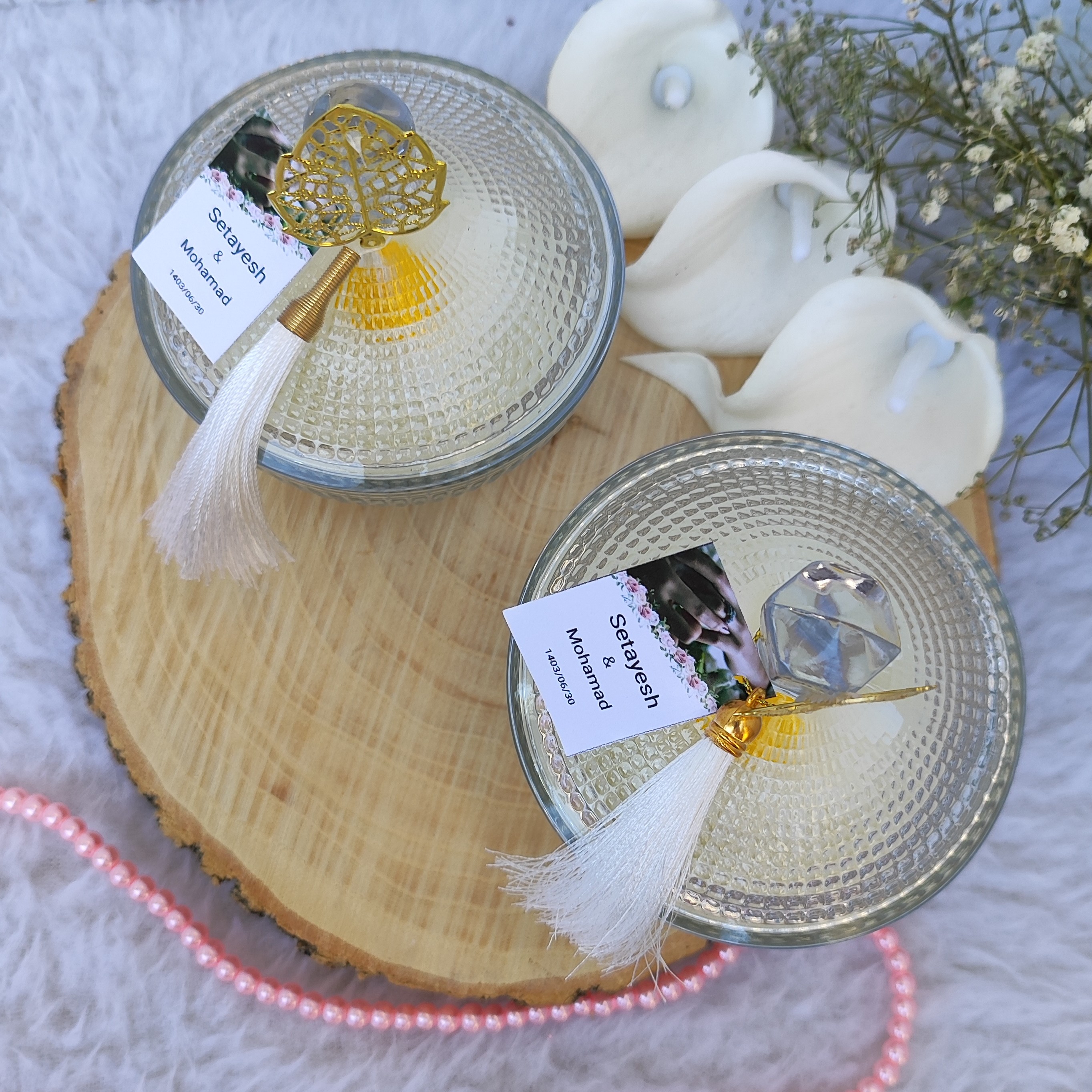 یه گیفت شیک و خاص جنس شات شیشه ای هست گل داخل شات بابونه هست همراه با لیبل اختصاصی عروس داماد
