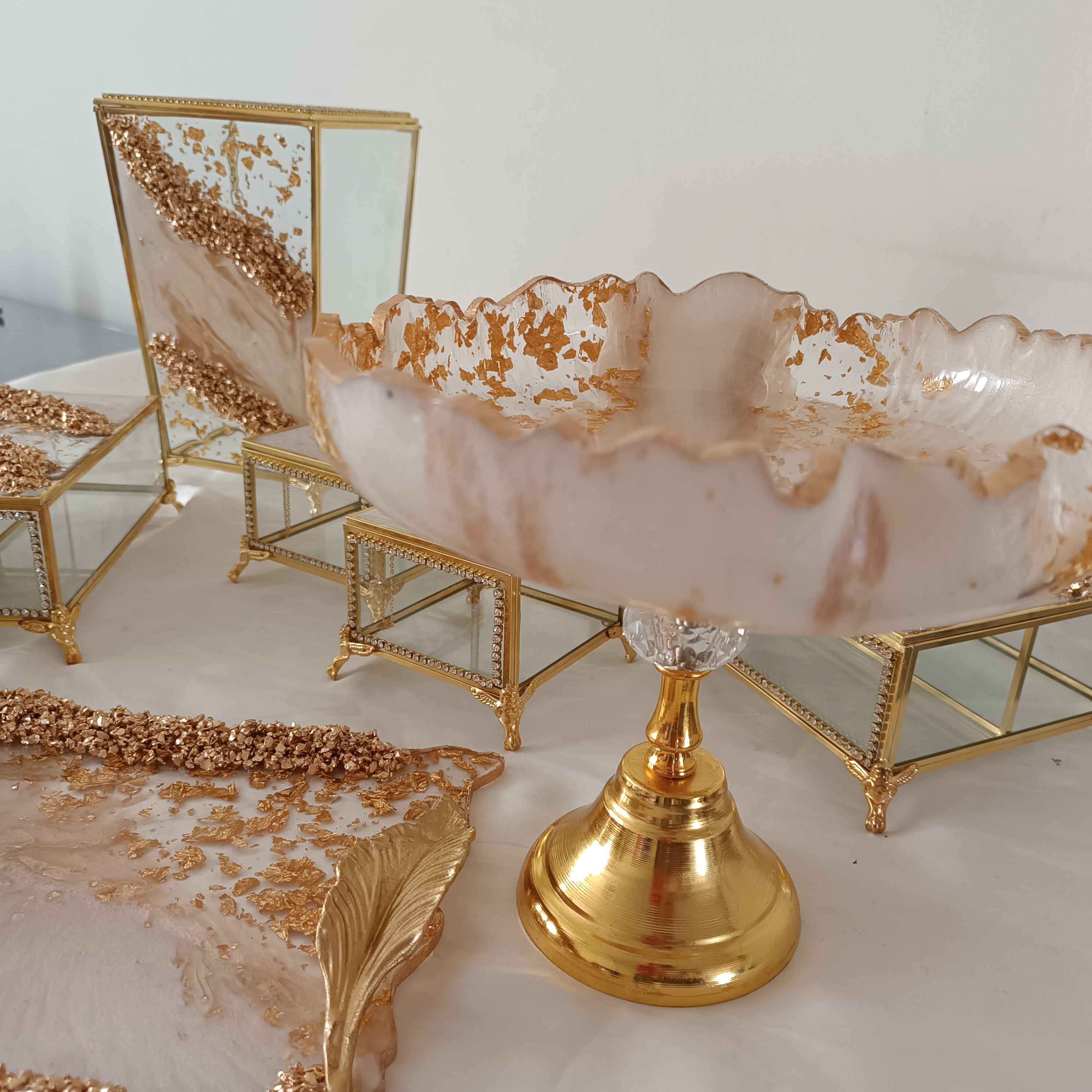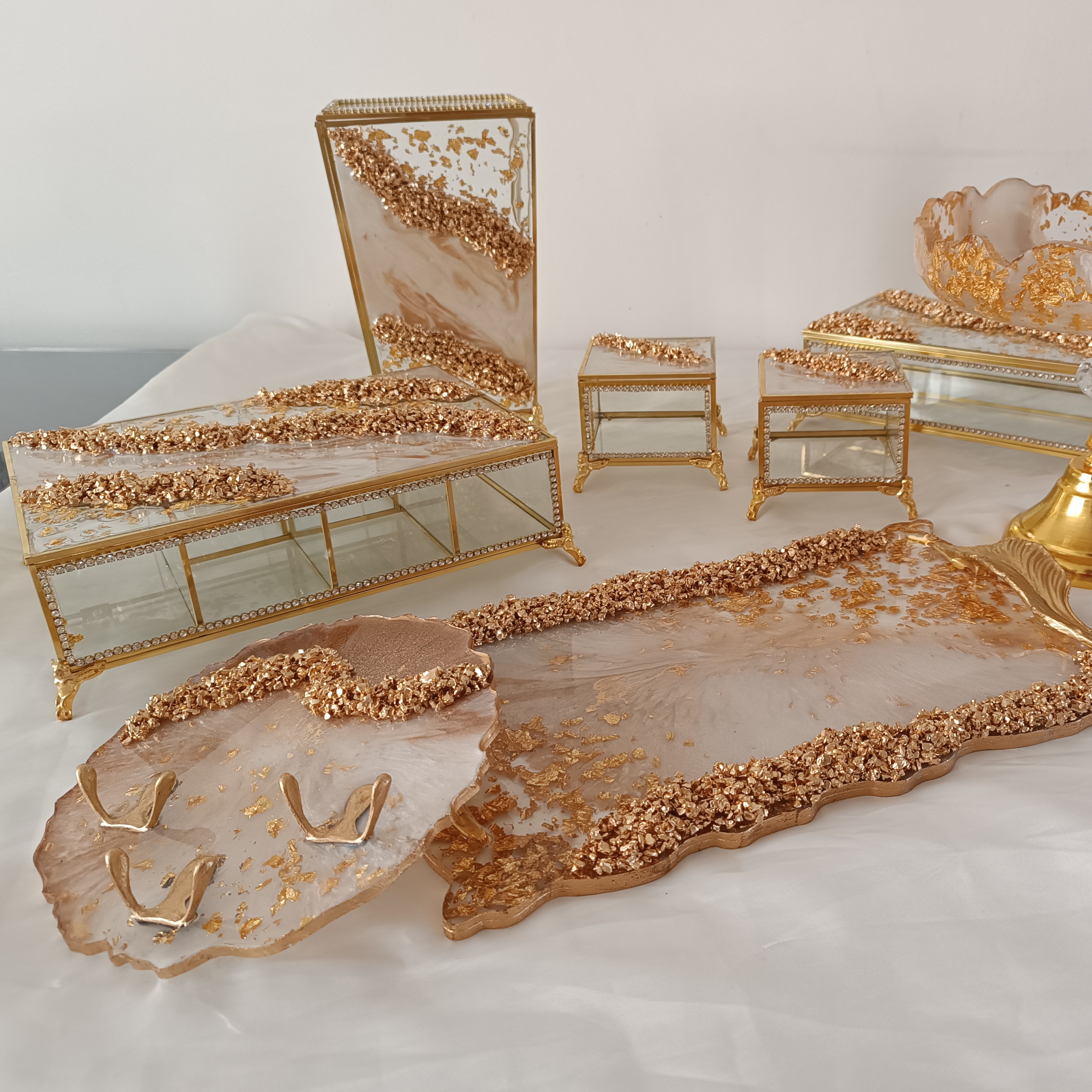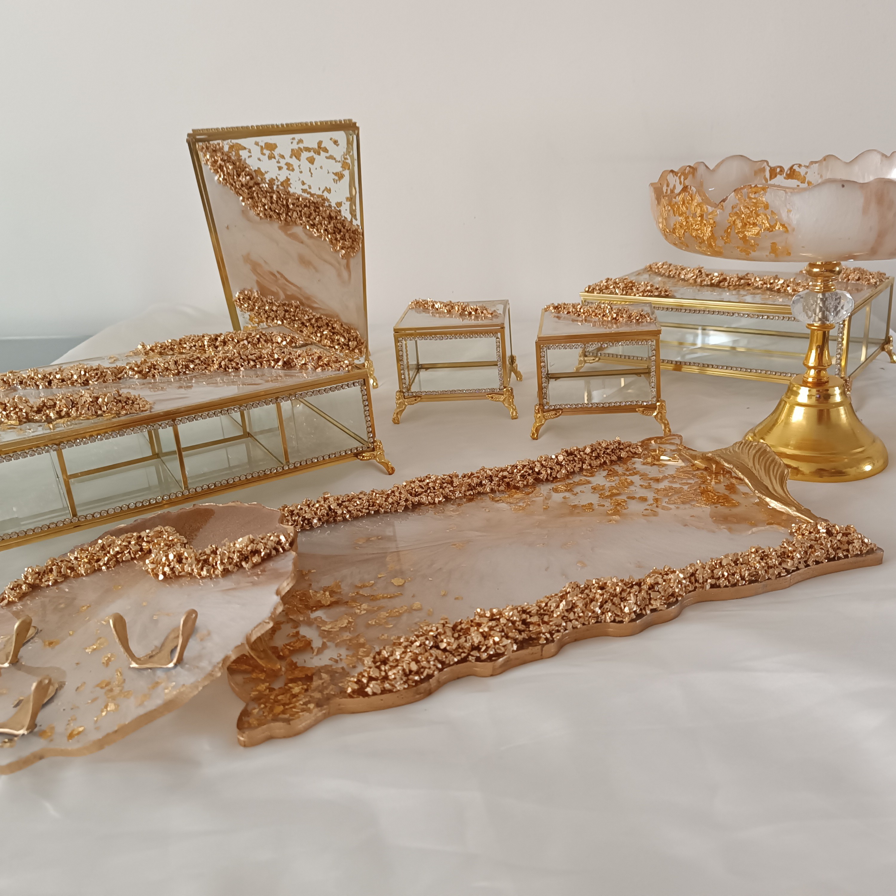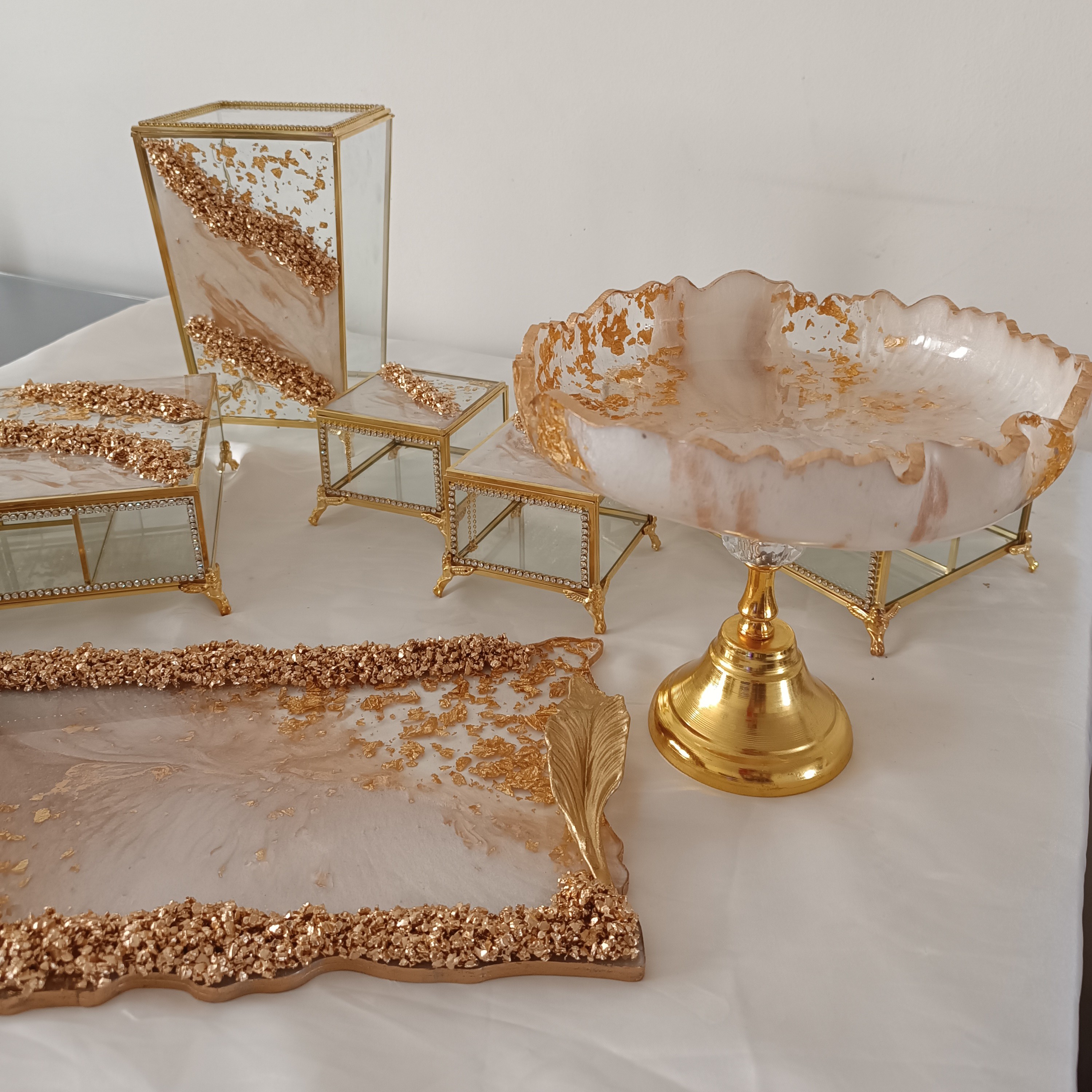سرویس 6تکه سطل شیشه ای ،جادستمال شیشه ای، تیبگ شیشه ای ،جای کارد شیشه ای،قندان شیشه ای و گلدان شیشه ای ب همراه ست هم شکل رزینی قابل سفارش